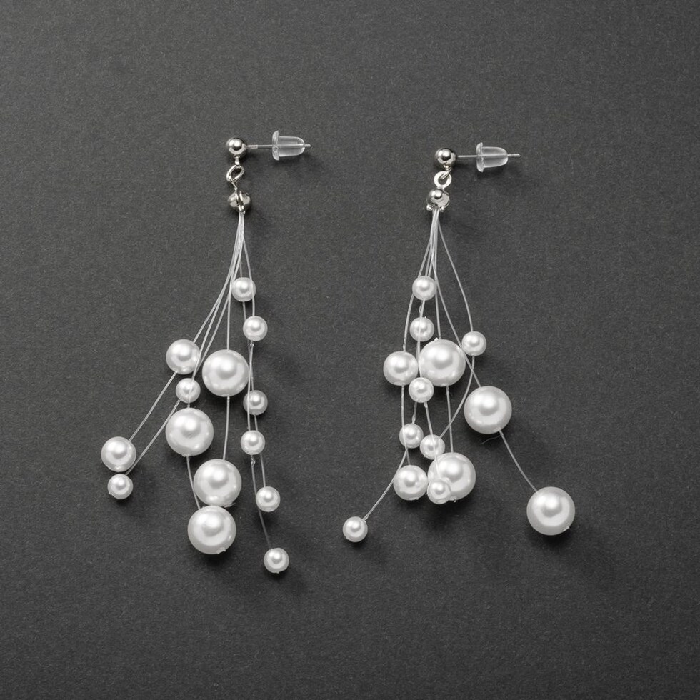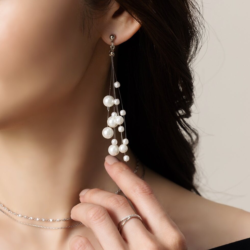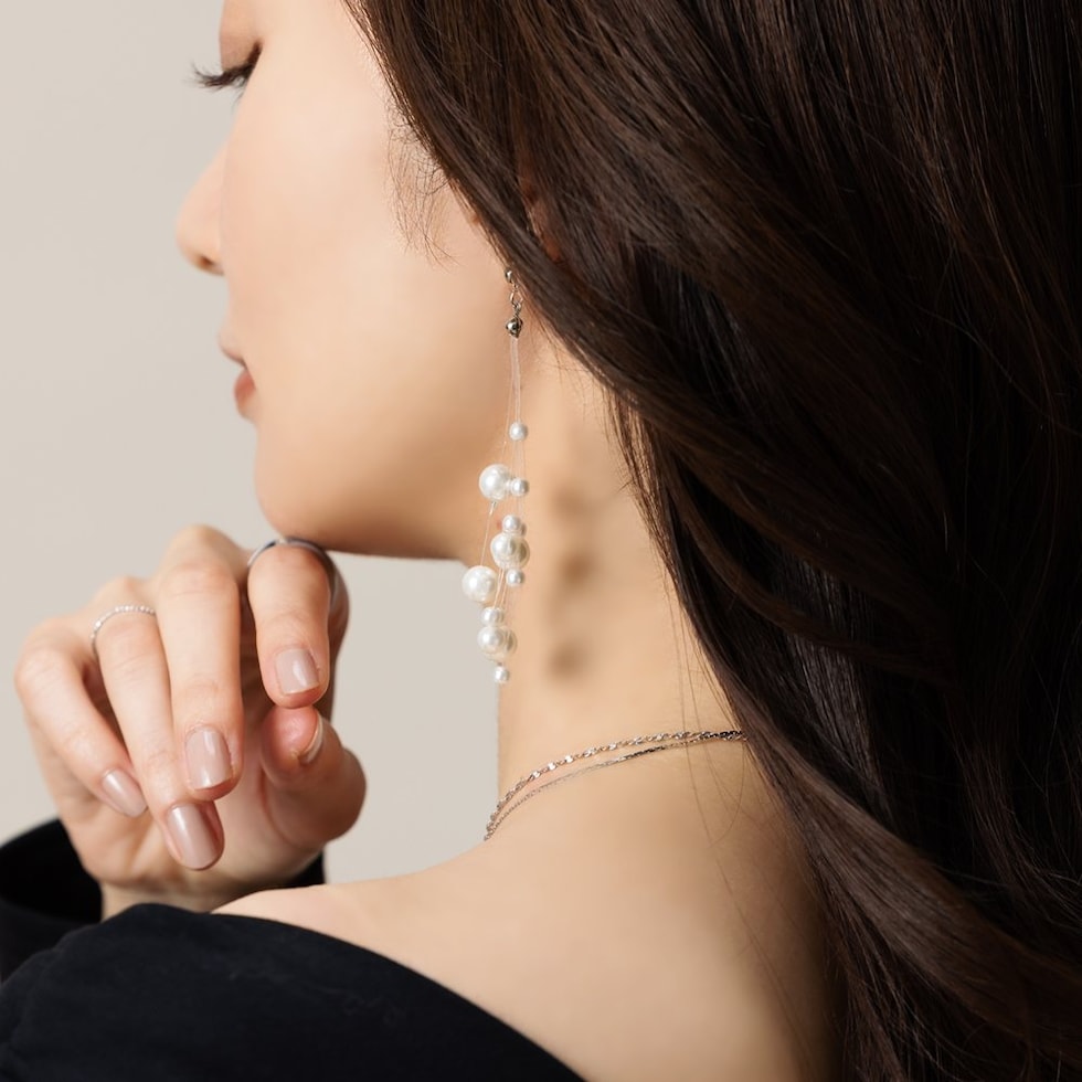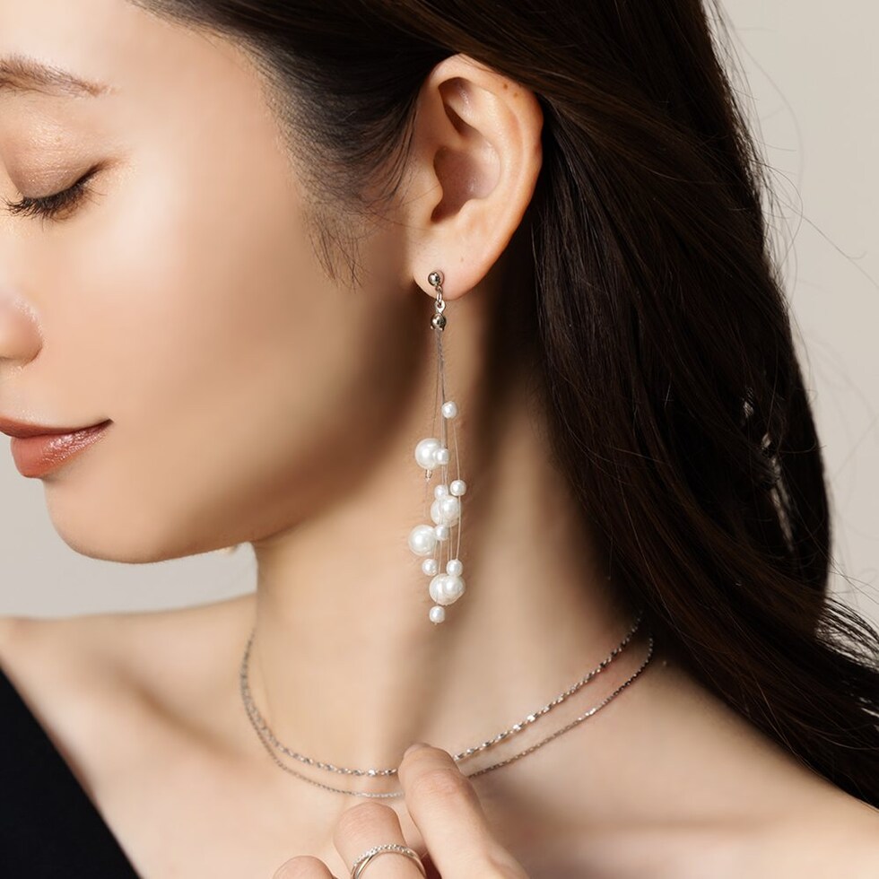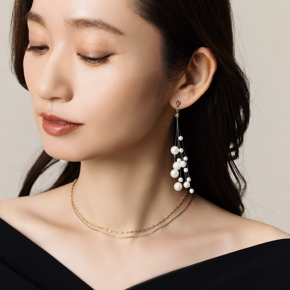 ランダムパールが揺れる大ぶりスイングピアス。3サイズの艶パールをランダムに吊るした女性らしさ溢れる華やかな逸品。パールの揺れ感と縦長フォルムで小顔効果も期待できちゃいそう◎