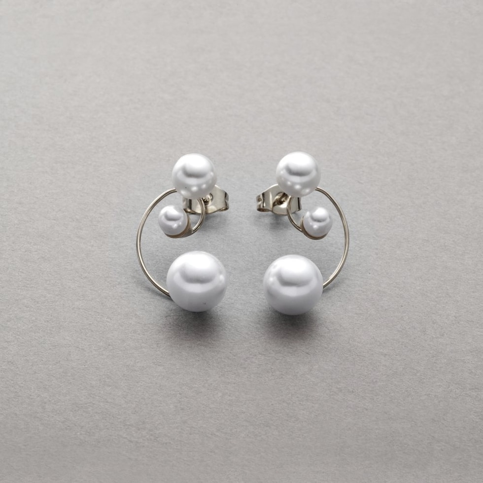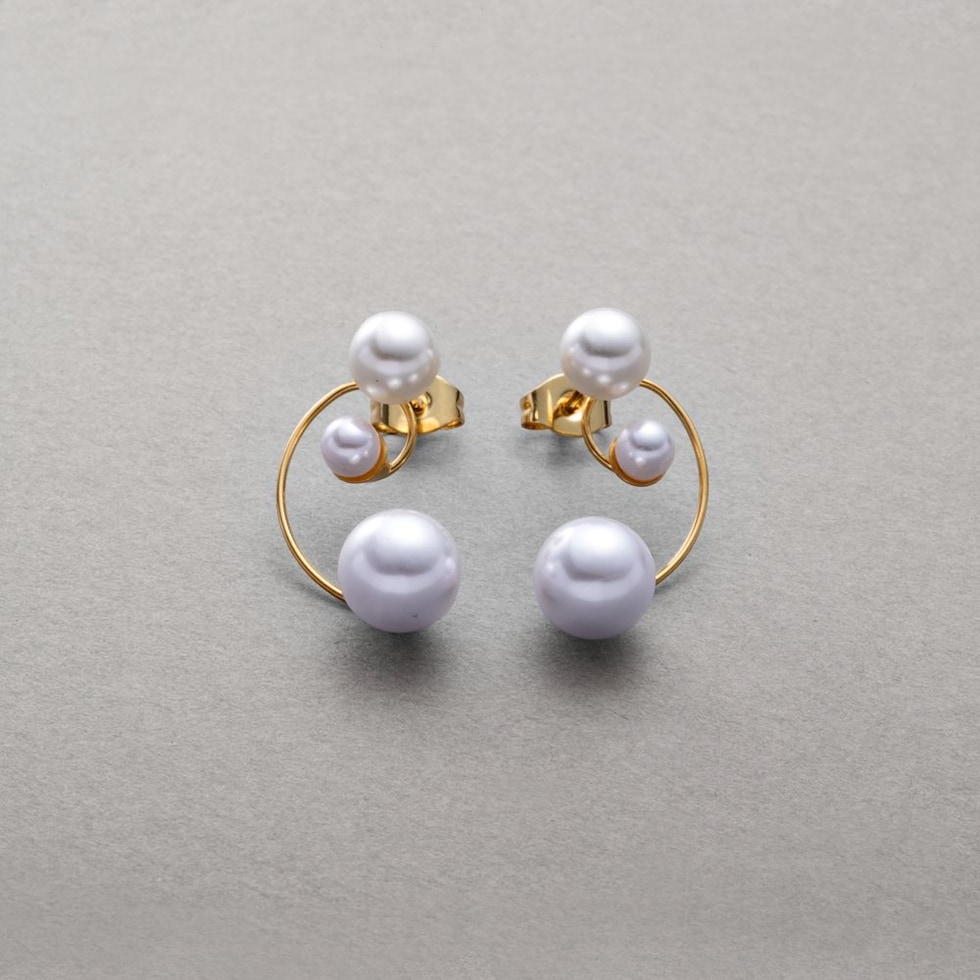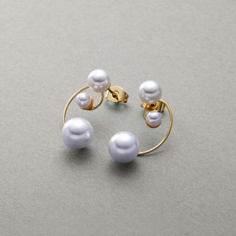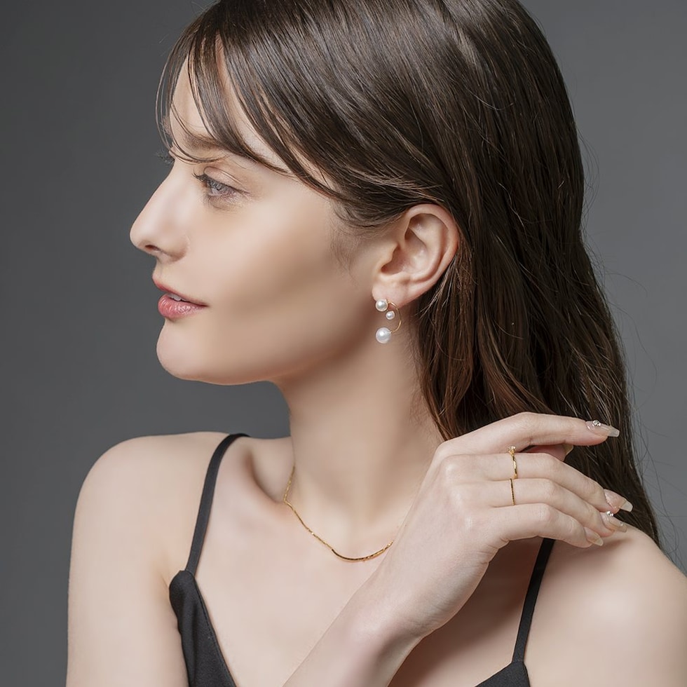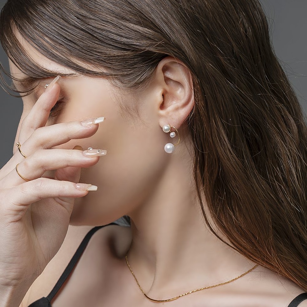 3粒パール付き華奢ドローイングラインピアス。とっても華奢なくるんとしたドローイングラインに3つの艶パールを添えた女性らしさ満点のデザインで、これひとつでお顔周りが上品に華やぎます。コーデに気軽にパールを取り入れられるマストアイテムです◎