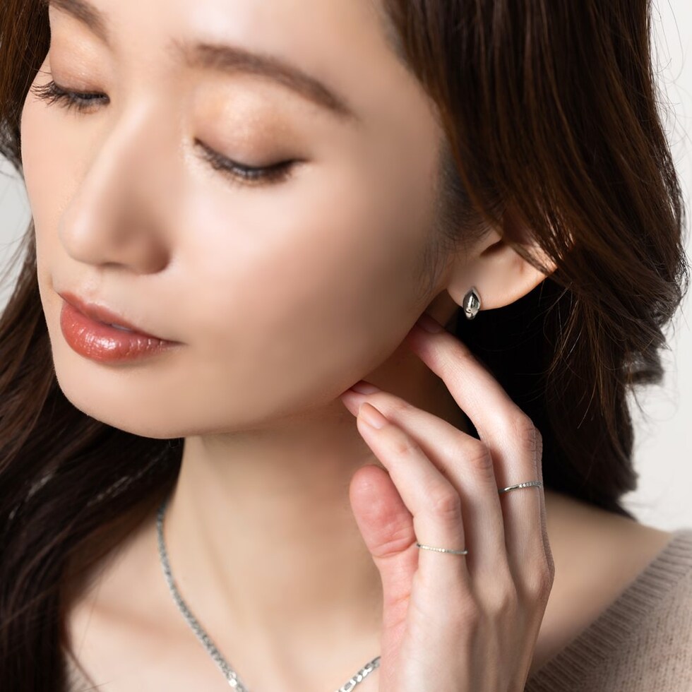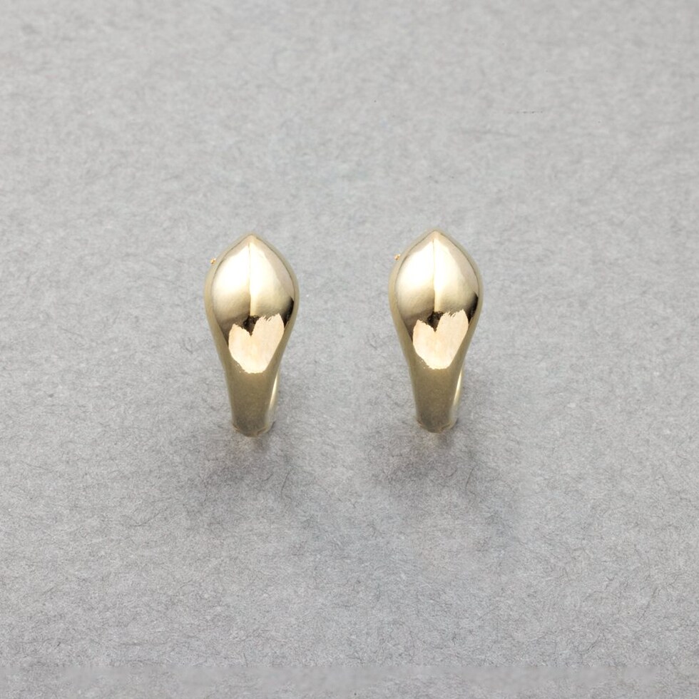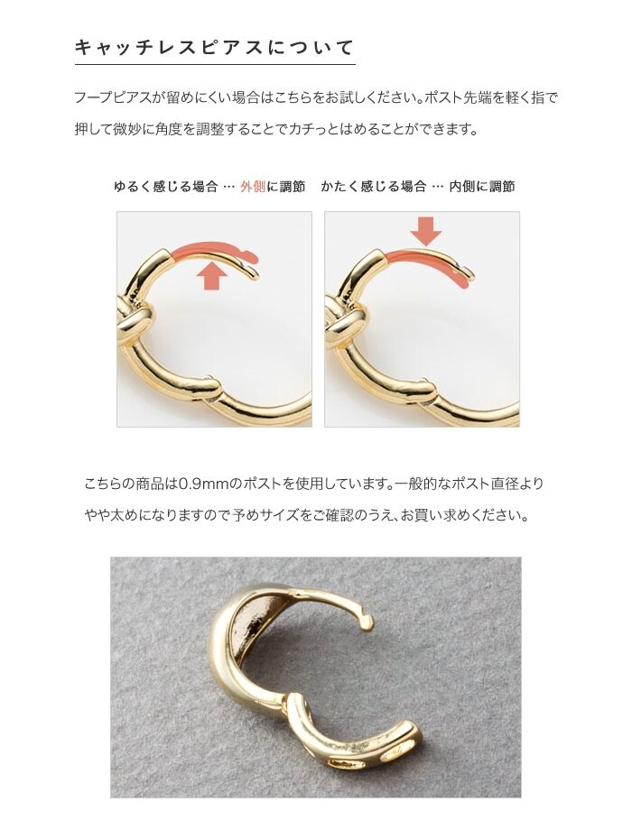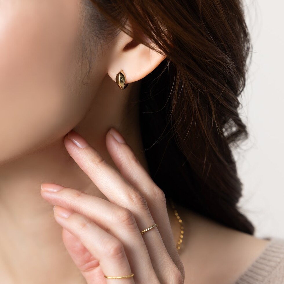 ドロップモチーフのようなぷっくりとしたシルエットのキャッチレスフープピアス。ミニマムなサイジングですが、ちょっとユニークな遊び心のあるデザインで存在感も◎耳もとにすっとなじんで、おしゃれ感のある横顔を引き出してくれます。