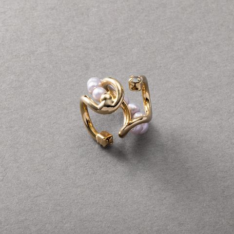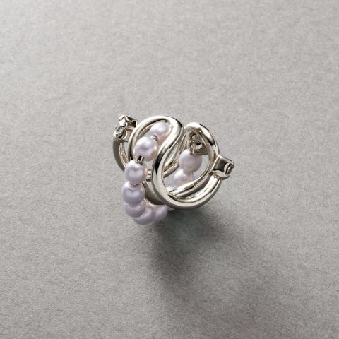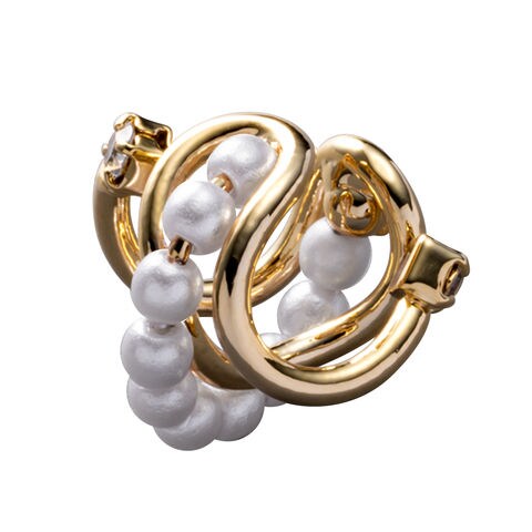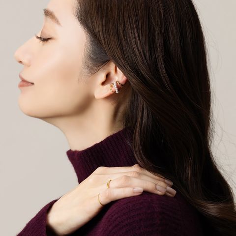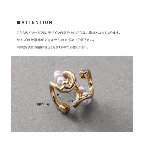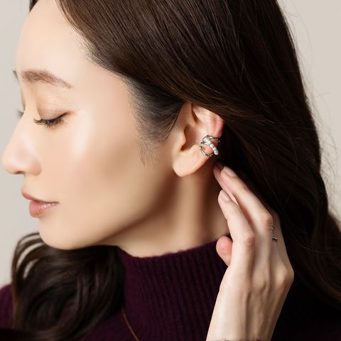 パール×3連ラインのレイヤード風イヤーカフ。ぐにゃぐにゃと3連になったメタルラインにパールラインをクロスしたレイヤード風デザインと耳元にフィットする程よいサイジングでお顔周りをパッと華やかに◎