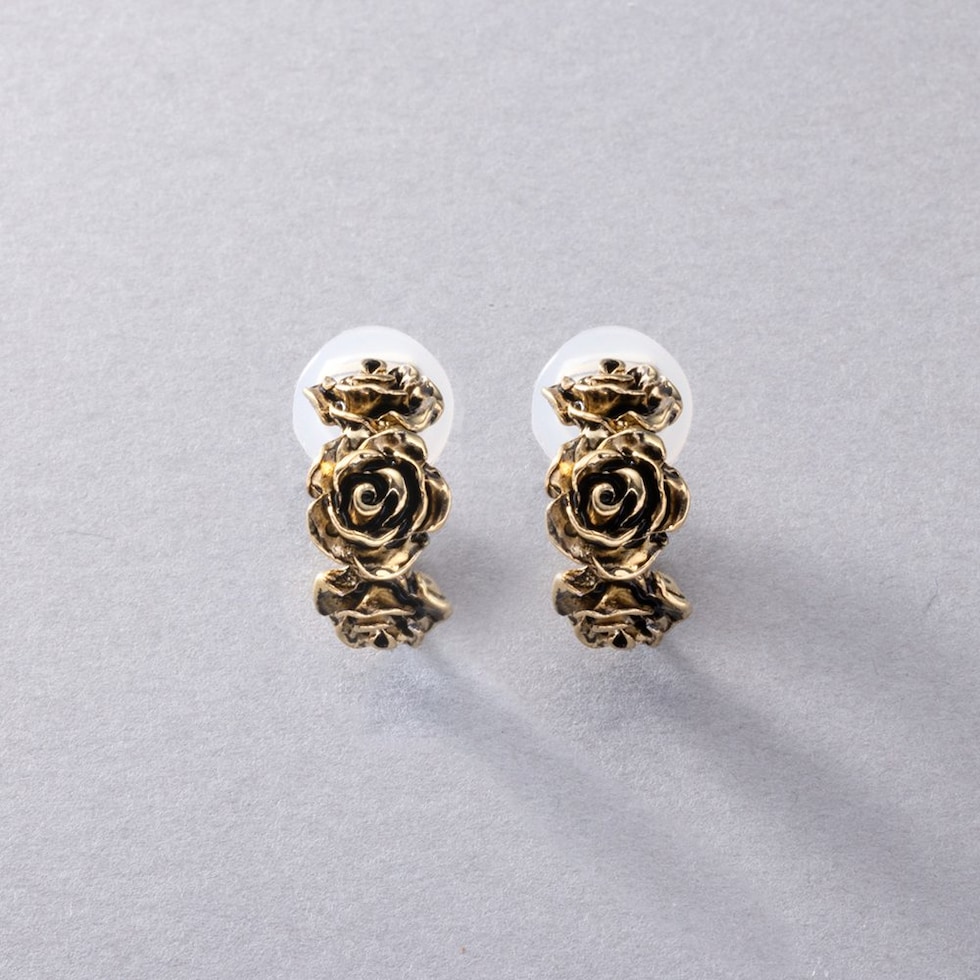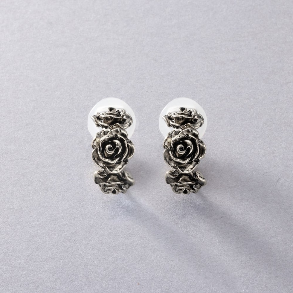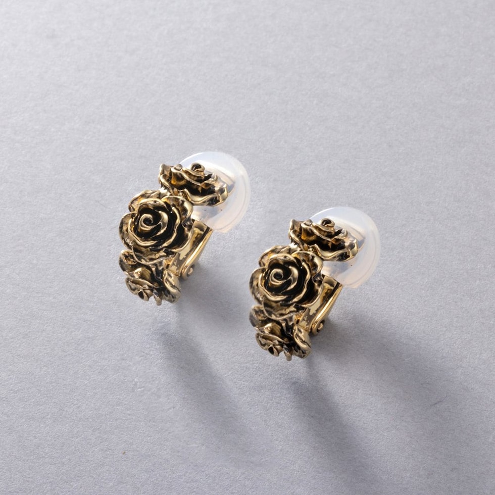 ローズをモチーフにした高見えアンティークフラワーのイヤリング。立体感のあるリアルなモチーフが耳元に映えるデザインです。フープタイプなのでどの角度から見てもキレイ見えするのが嬉しいポイント。一点投入するだけでいつものコーデを格上げしてくれるひと品です。