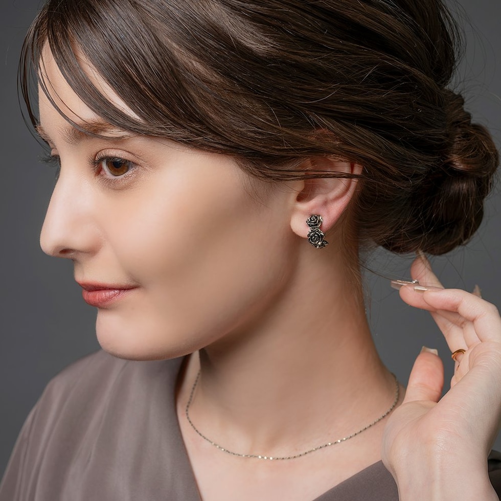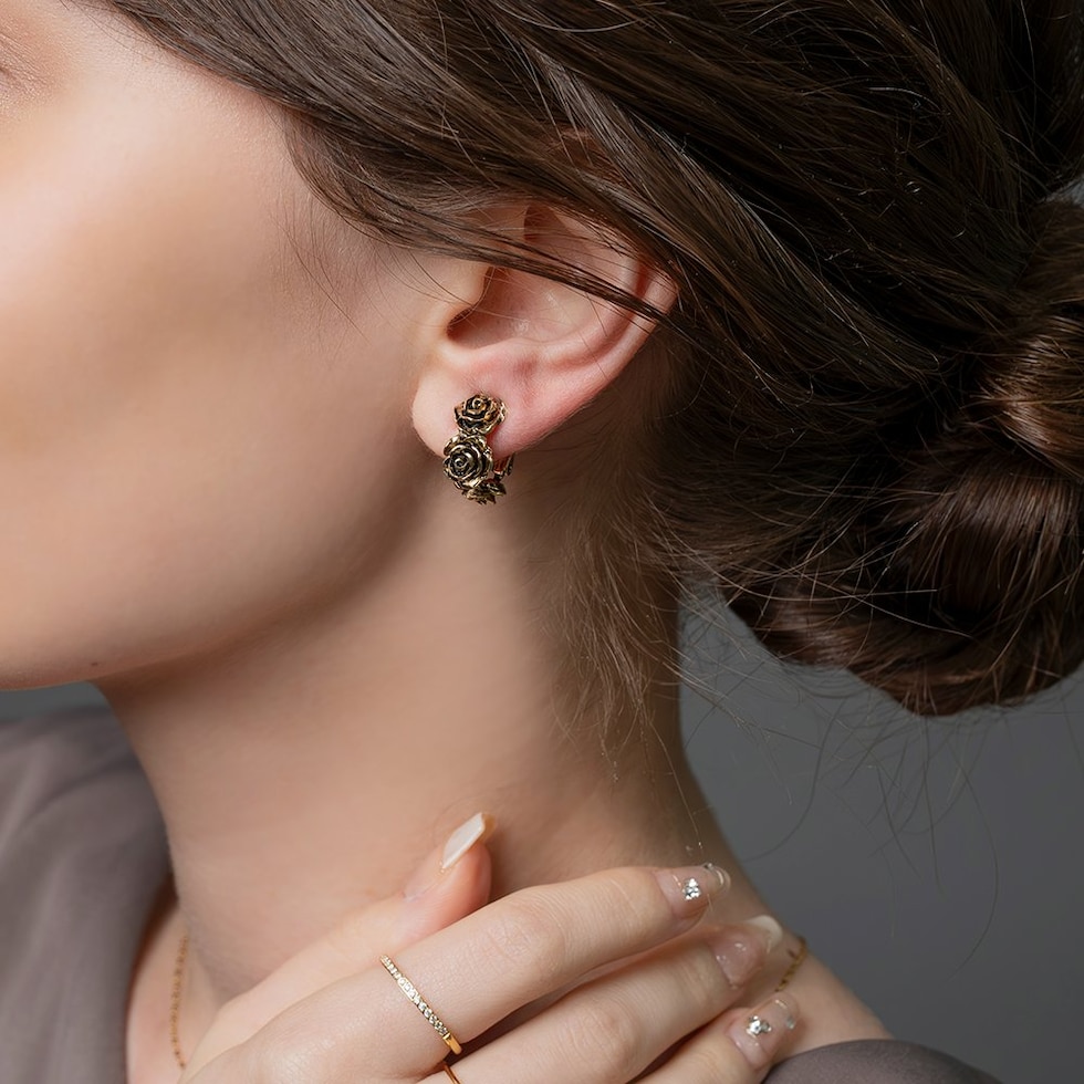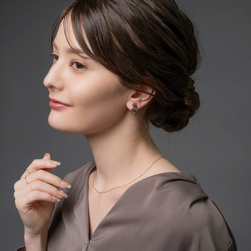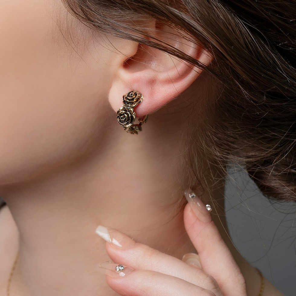 ローズをモチーフにした高見えアンティークフラワーのイヤリング。立体感のあるリアルなモチーフが耳元に映えるデザインです。フープタイプなのでどの角度から見てもキレイ見えするのが嬉しいポイント。一点投入するだけでいつものコーデを格上げしてくれるひと品です。