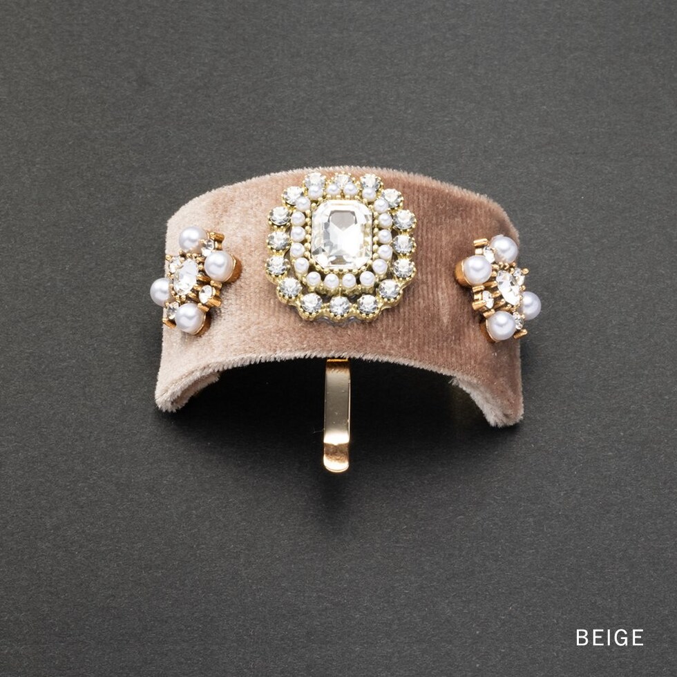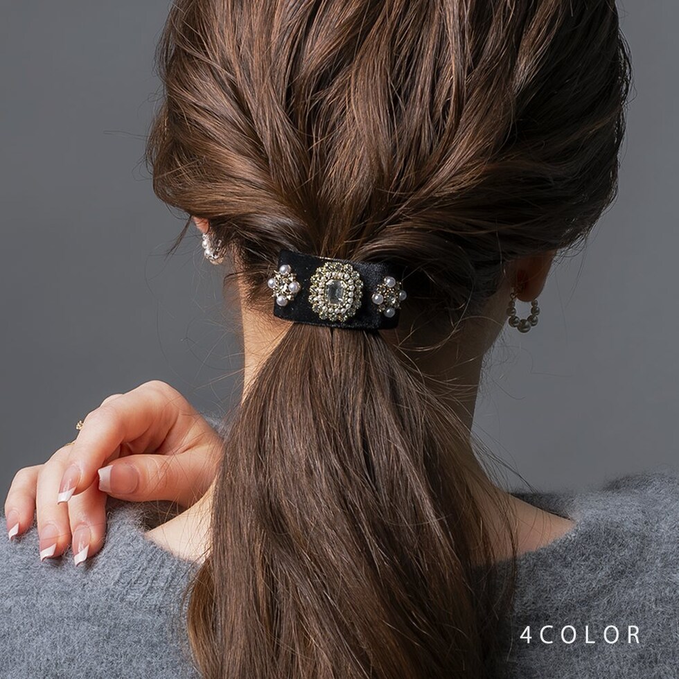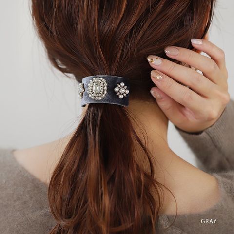 女心くすぐるデコラクティブなポニーフック。ベロア生地のカーブプレートに宝石を並べたような華やぎデザインでちょっぴりアンティークチックな雰囲気を楽しんで◎