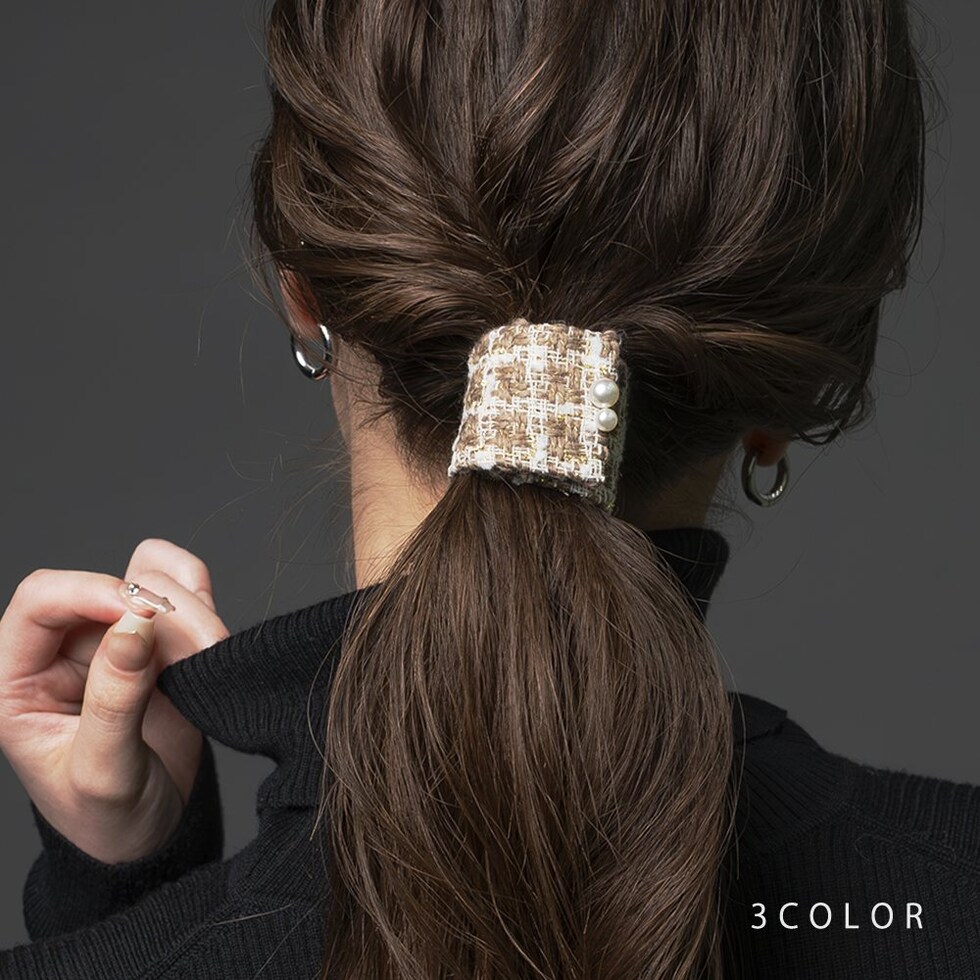パール付きツイード調生地の巻きつけ式ポニーフック。ツイード調生地の温かみがこの時季の気分を盛り上げてくれそう◎帯状に広げて伸ばしてフックを差し込むだけの簡単装着で、シンプルなポニーにボリューム感をプラス。