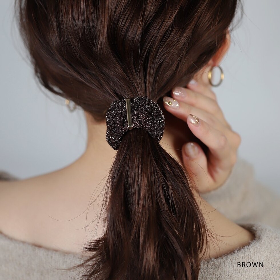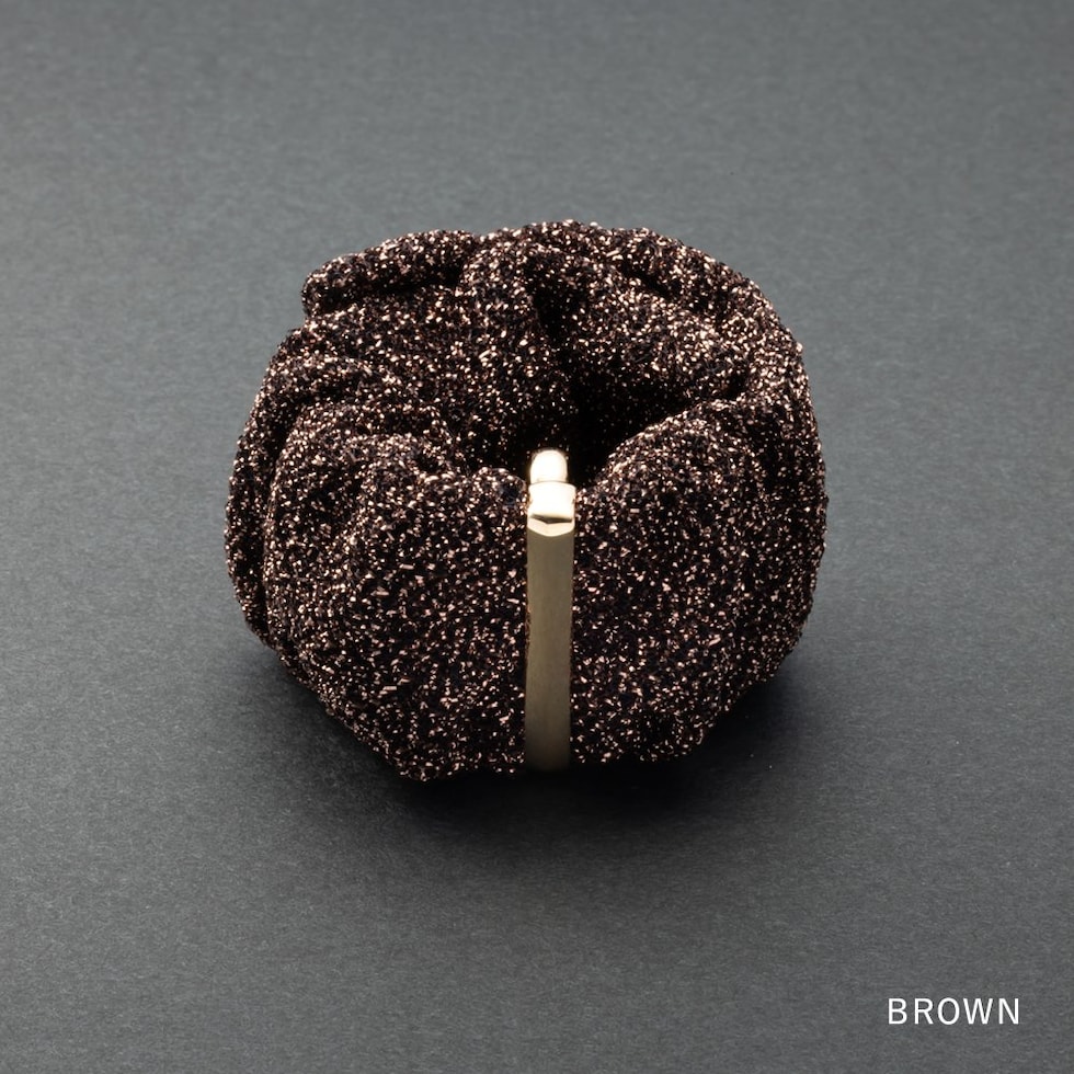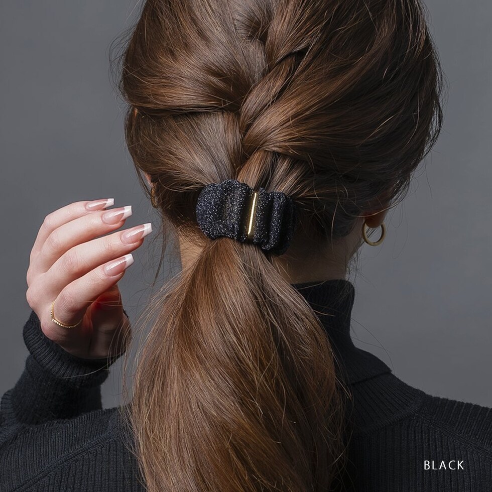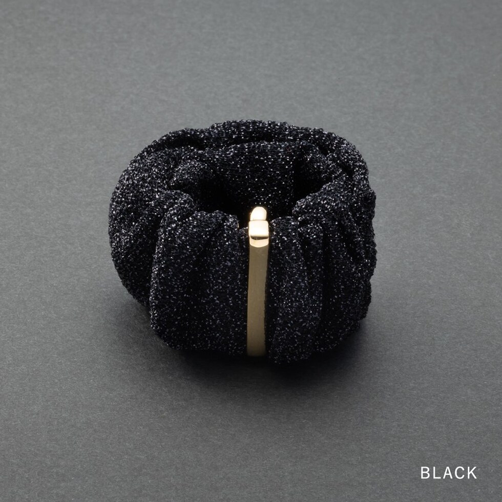 メタルバー付きラメ生地の巻きつけ式のヘアカフ。キラキラとしたラメ入りのシックな色合い生地が華やかだけど派手過ぎず使えるひと品。帯状に広げて長く伸ばし、内側のフックをまとめ髪に差し込むだけの簡単装着。ワンタッチでくるんと巻きつき、シンプルなポニーもボリュームのある仕上がりに◎