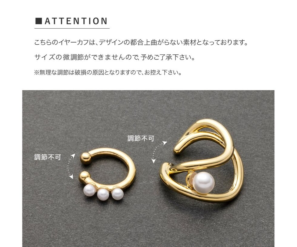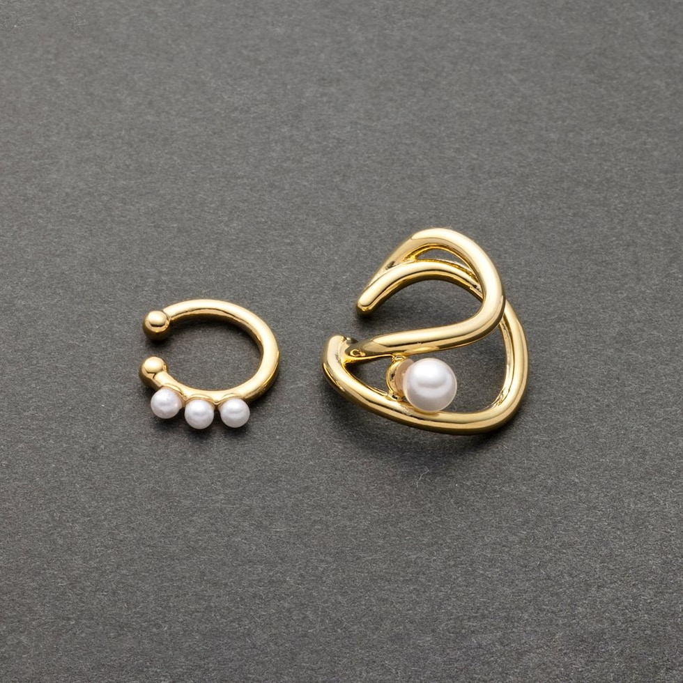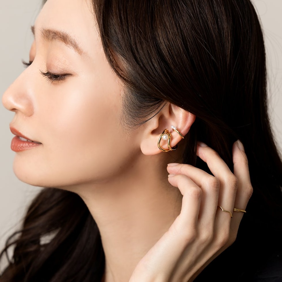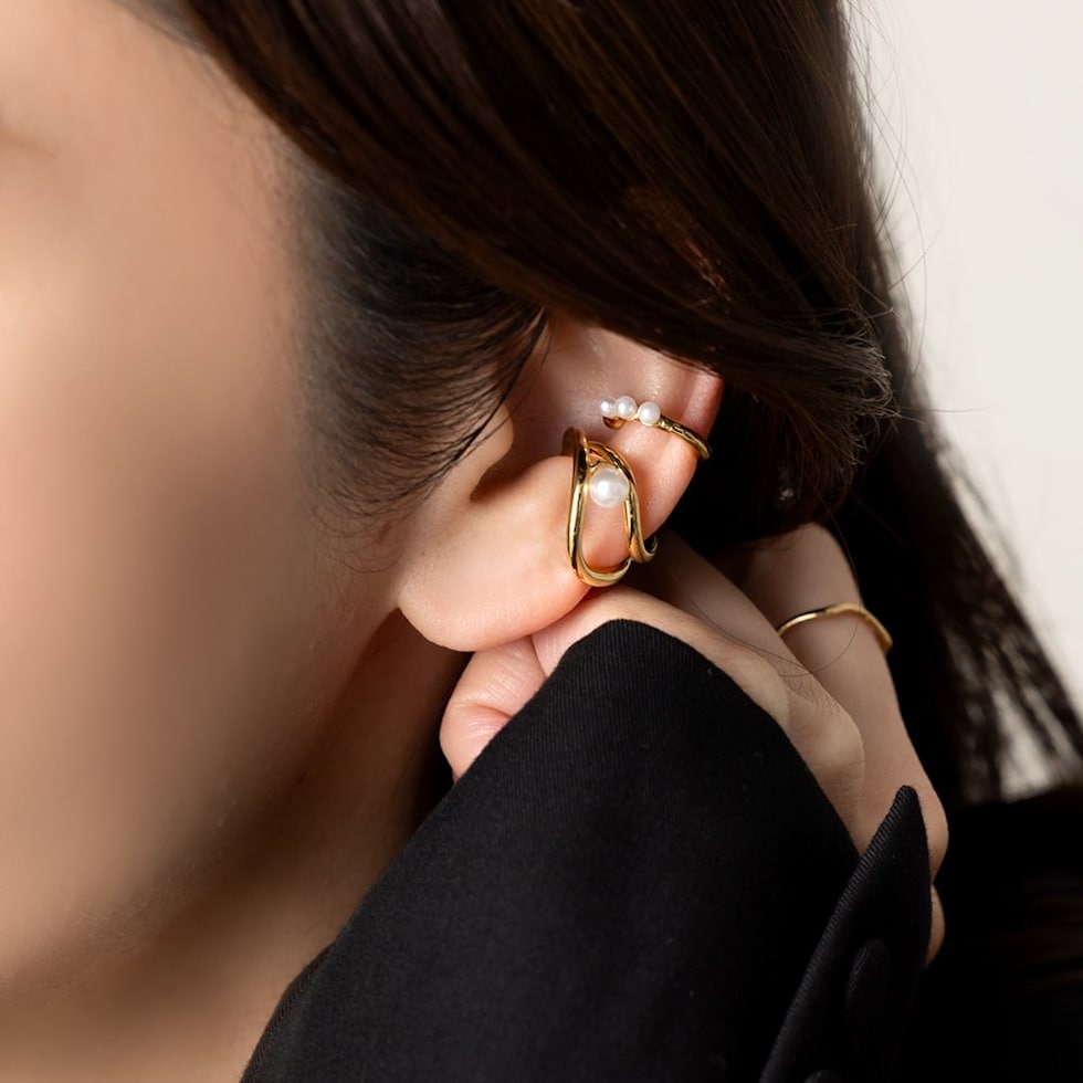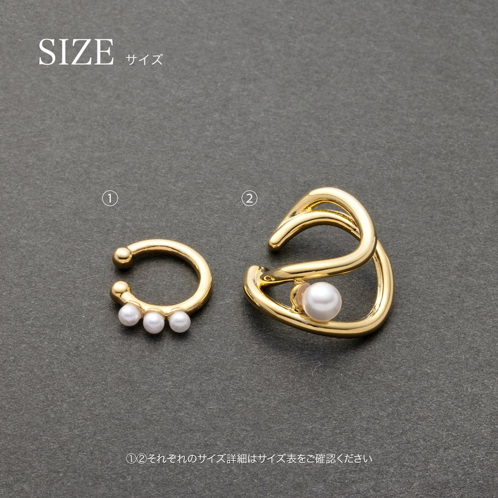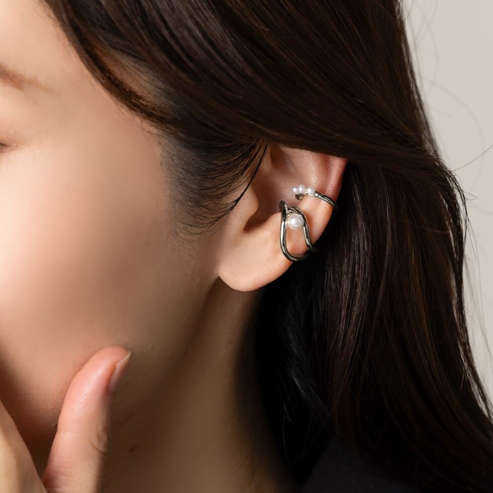 レイヤード風メタルと小粒3連パールの片耳用2セットイヤーカフ。単品でも重ね付けでも使える嬉しい3wayアイテム◎立体的なフォルムがモード感をプラスして大人上品な雰囲気を演出します。ピアスやイヤリングとの組み合わせを楽しむのもオススメ。