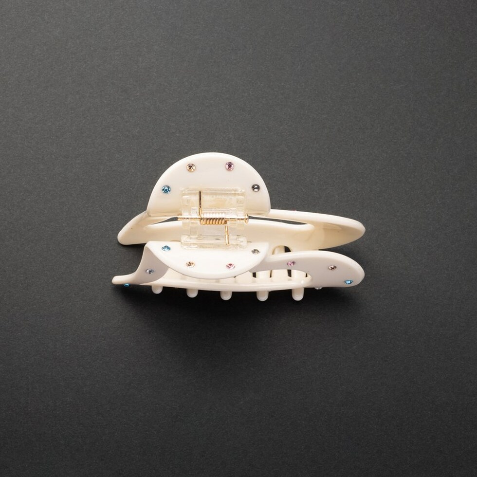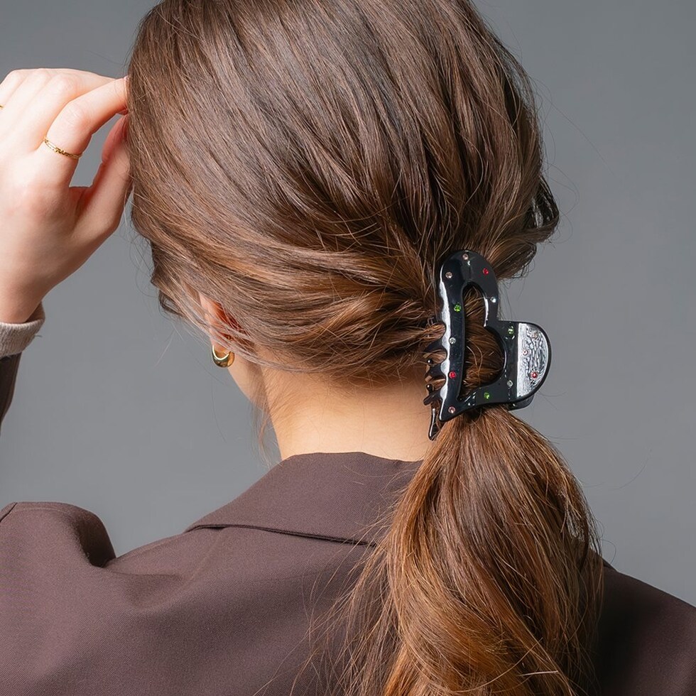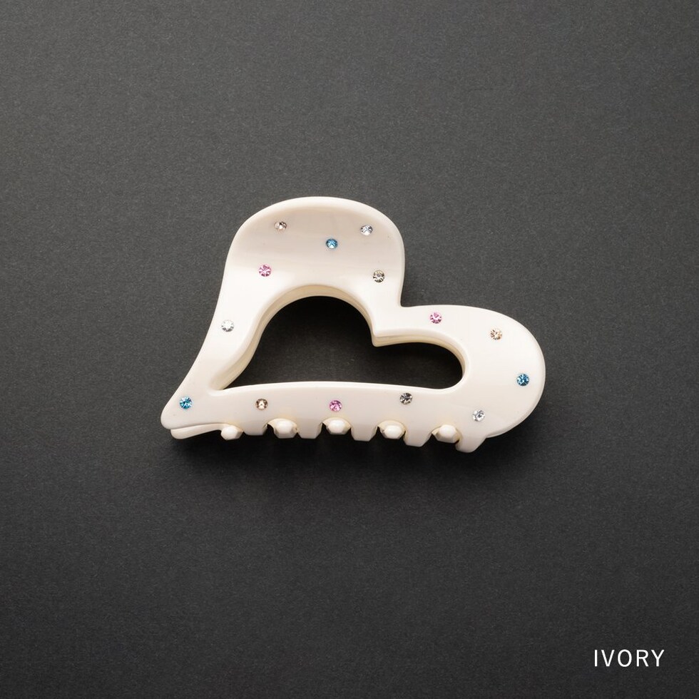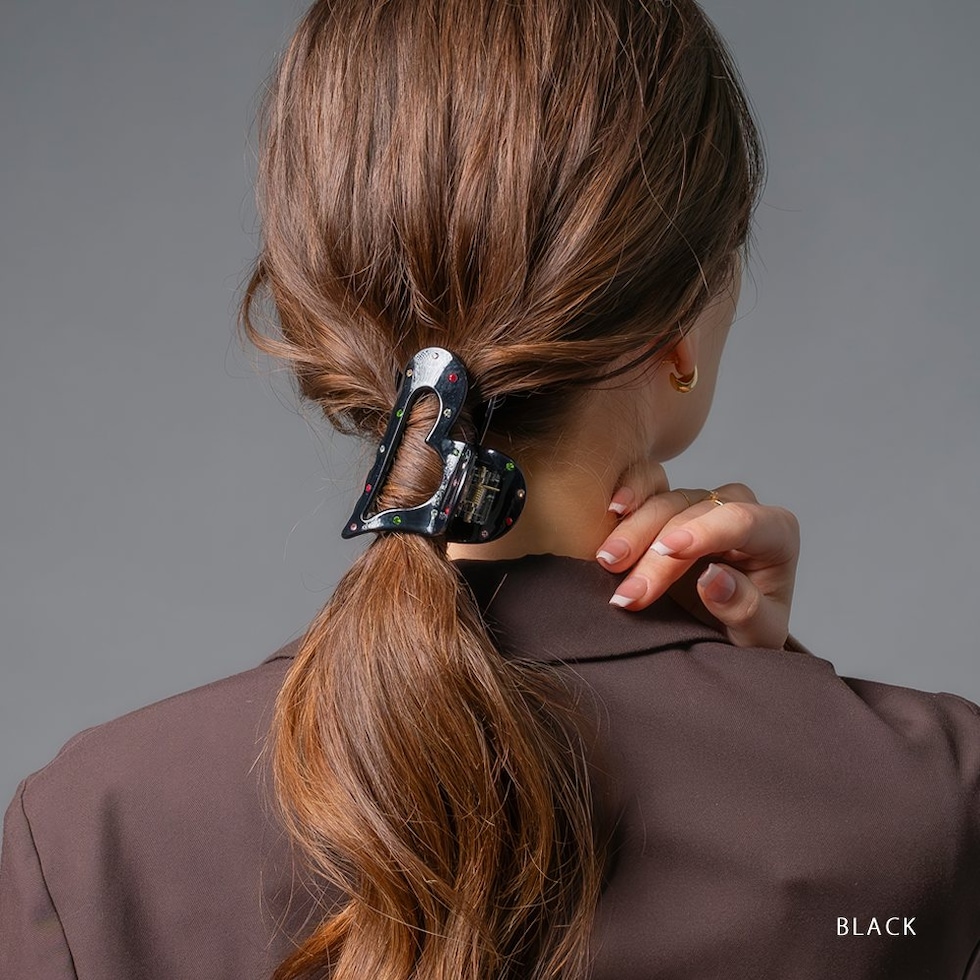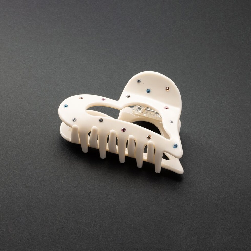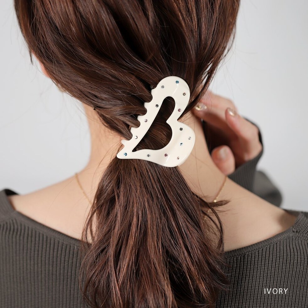 ハートフレームにマルチカラーのビジュードットを配したバンスクリップ。煌めくビジューとハートモチーフが華やかな印象で、コーデのアクセントになるアイテム◎使いやすいサイズ感で、ハーフアップやラフなまとめ髪にサッと挟むだけでこなれヘアが完成します。