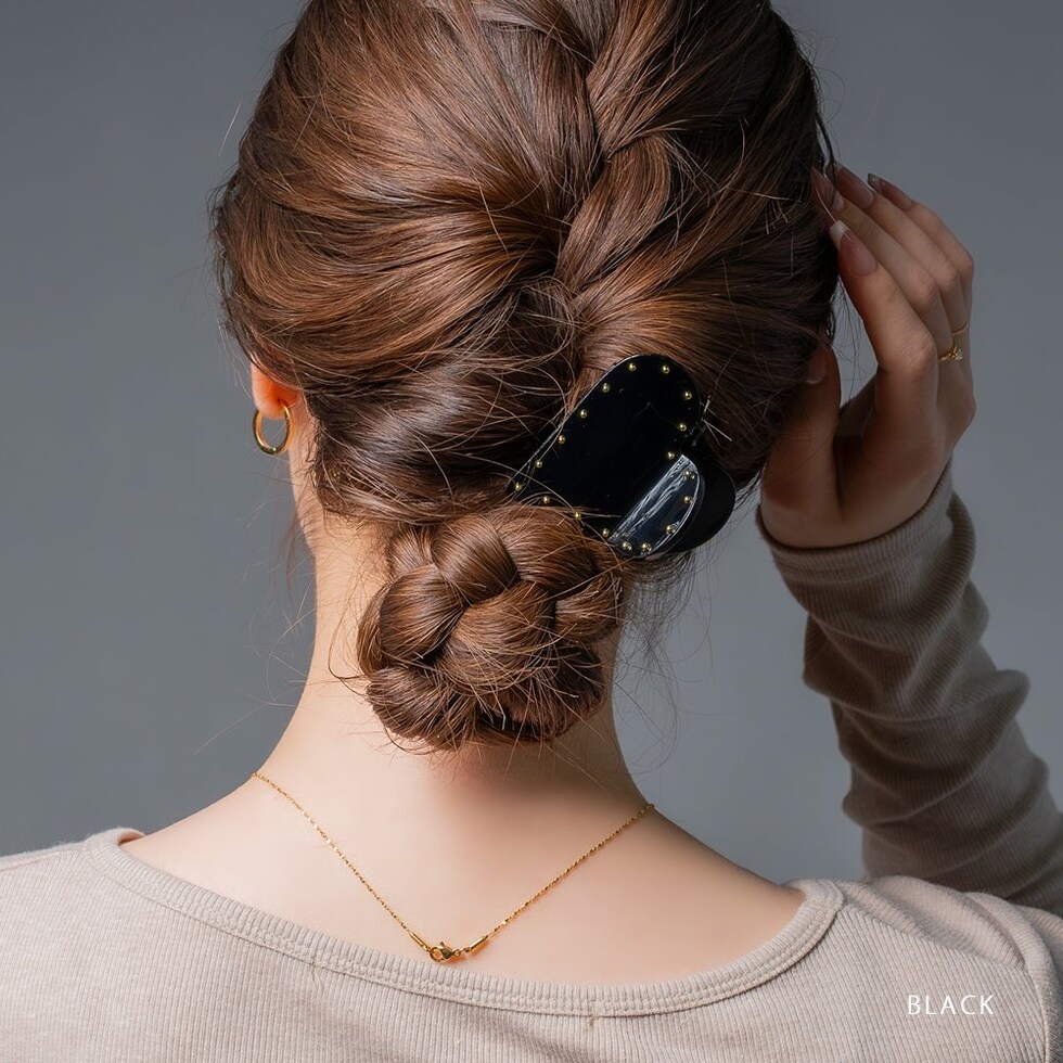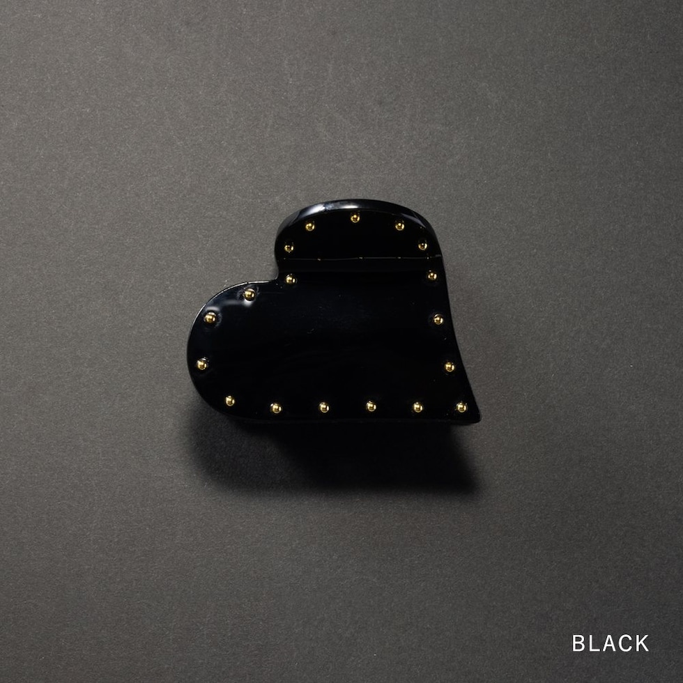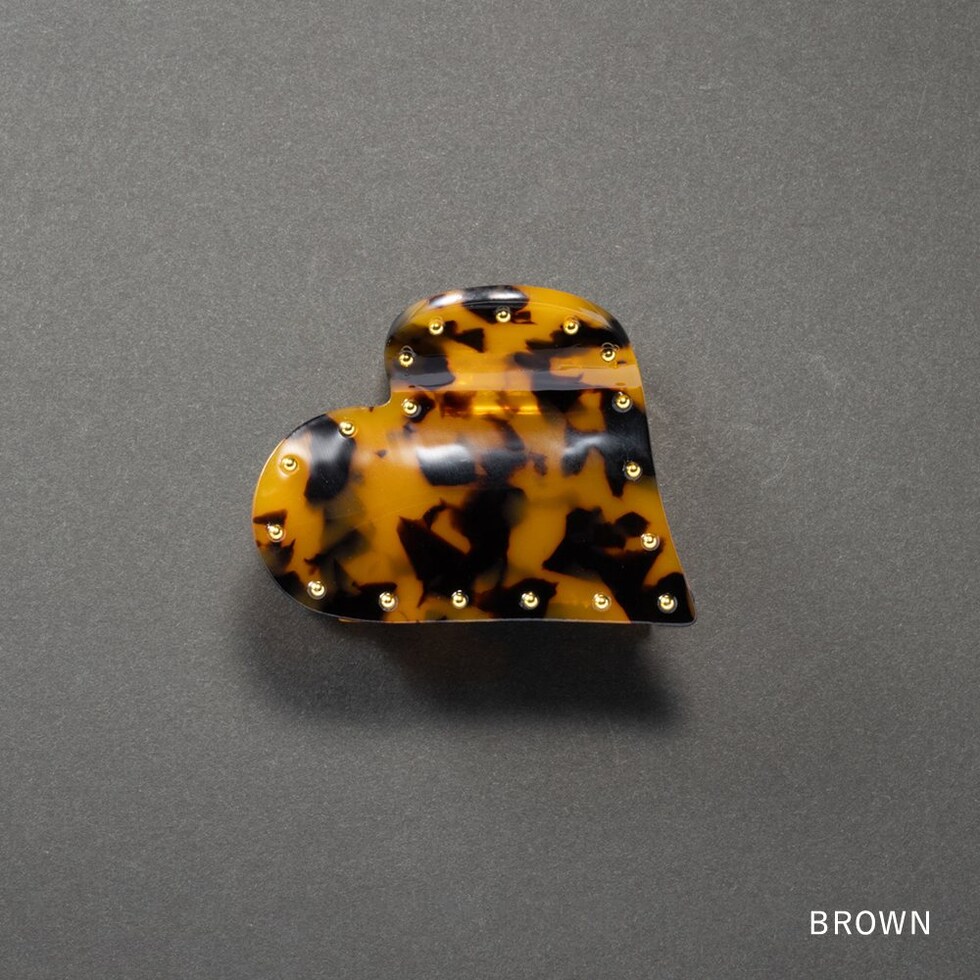 べっ甲柄やマーブル模様のハートモチーフの淵にゴールドカラーのスタッズドットを配したバンスクリップ 。コーデに馴染むカラーにトレンドライクなスタッズドットが上品さと華やかさを演出◎ラフなまとめ髪もさっと挟むだけでこなれたアクセントを添えてくれます。