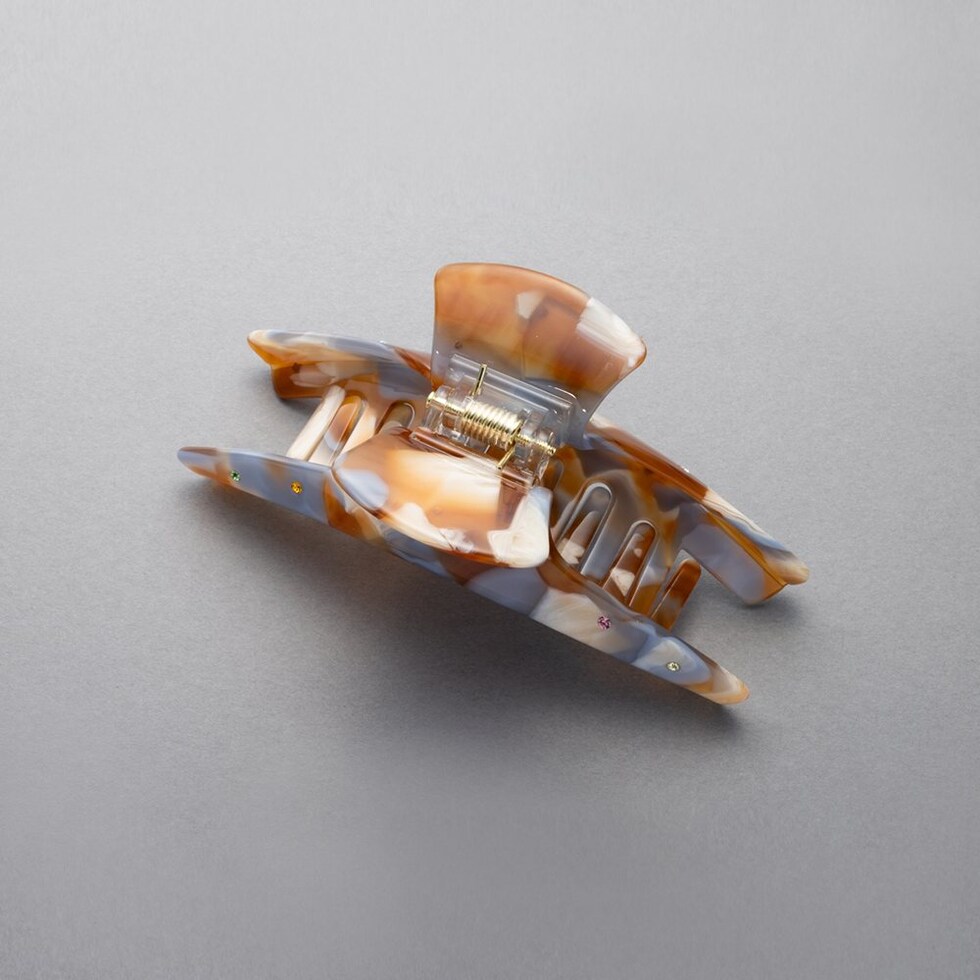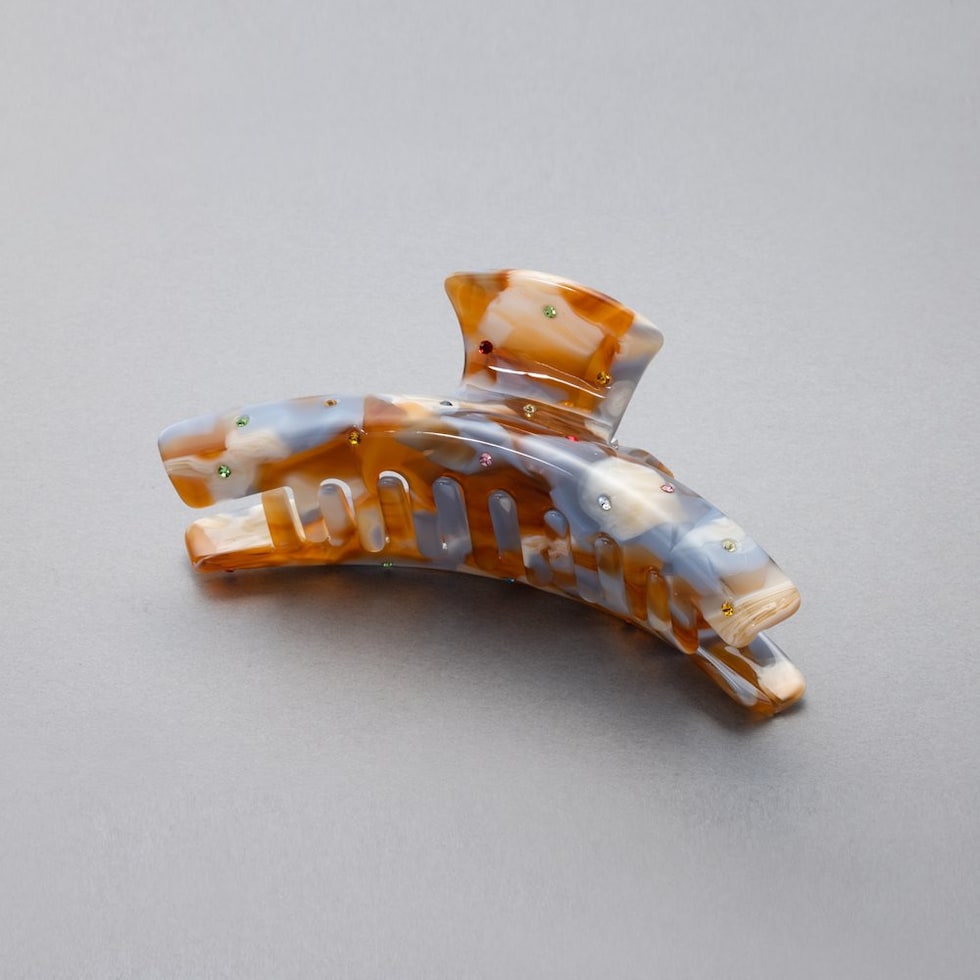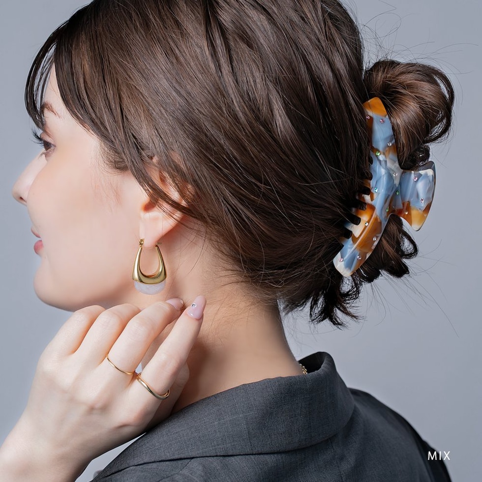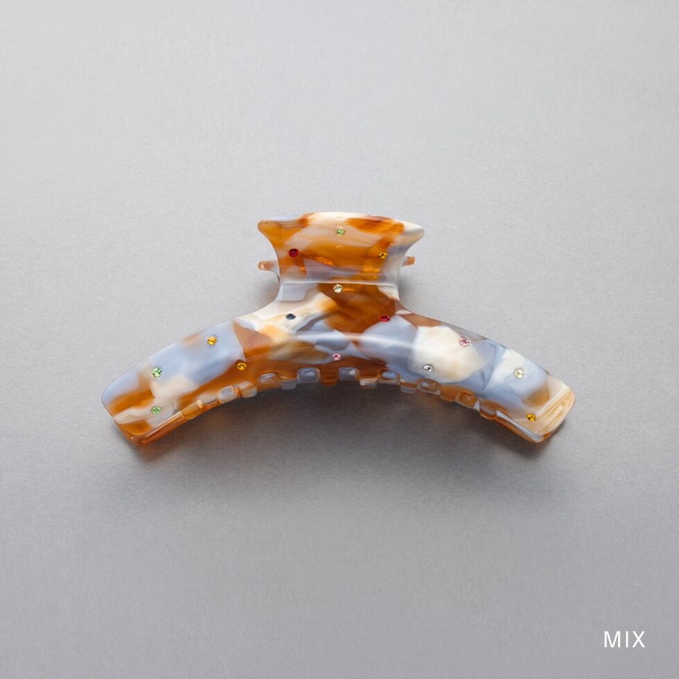 マーブル模様にマルチカラーのビジュードットが可愛いバンスクリップ。しなやかで美しいセルロイドを使用しており、高見えする上品な雰囲気も◎華やかなマーブル模様と煌めくビジューが、スタイリングのアクセントにぴったり。使いやすいサイズ感で、ラフなまとめ髪も今っぽい雰囲気に仕上げてくれるアイテムです。