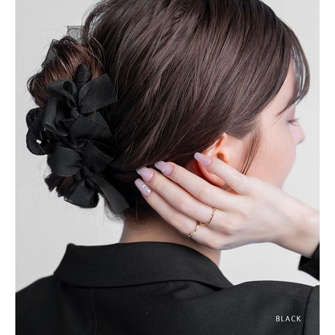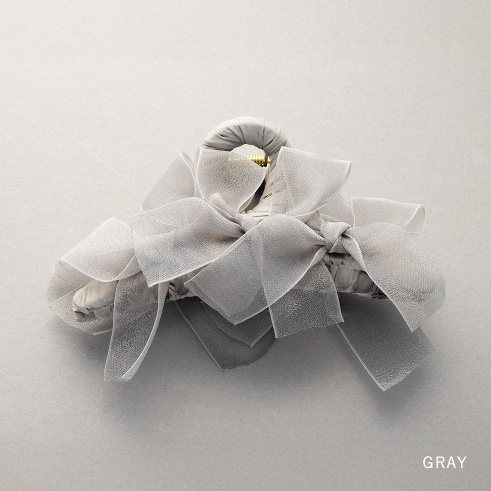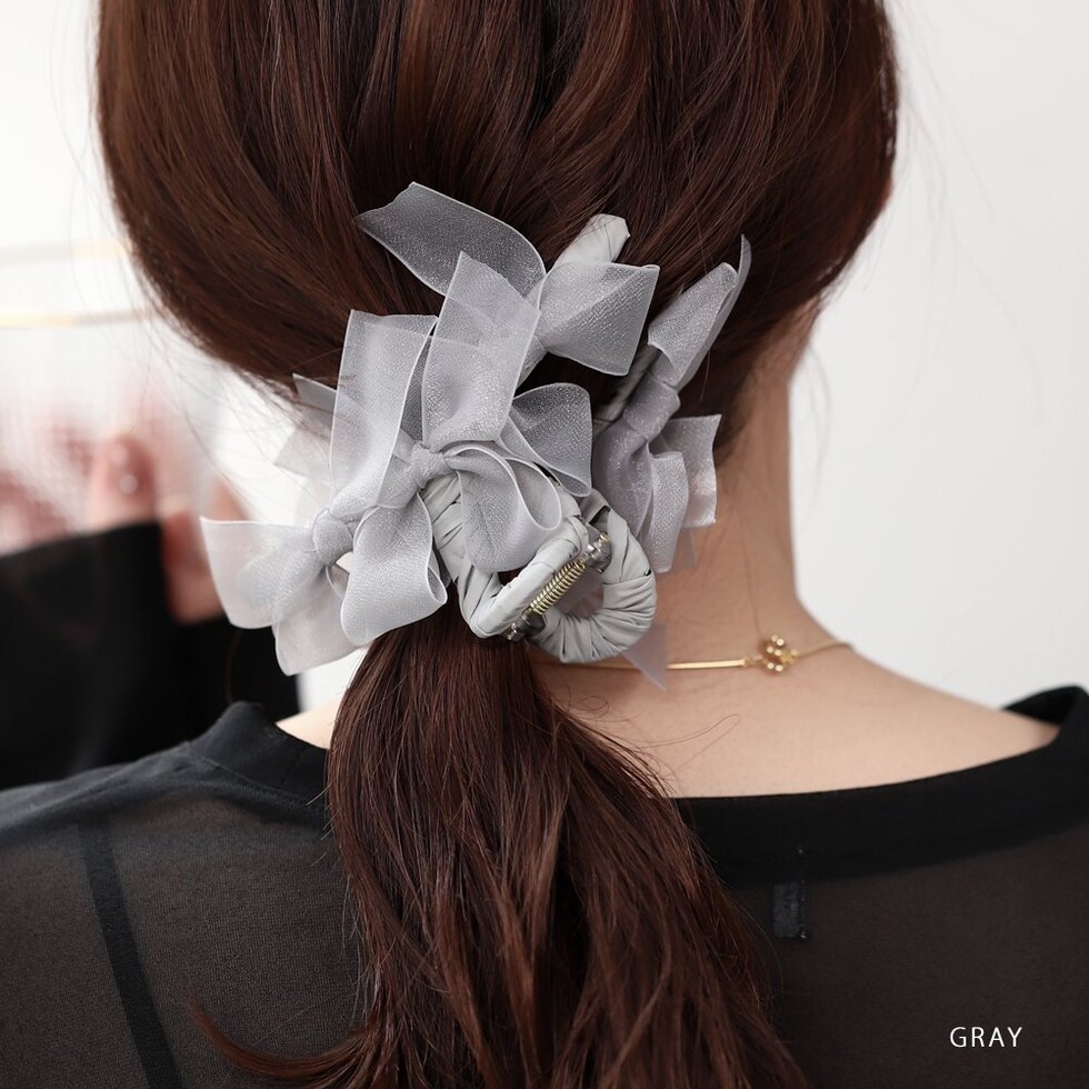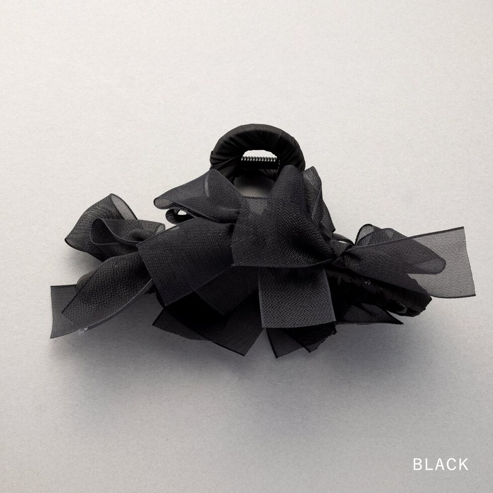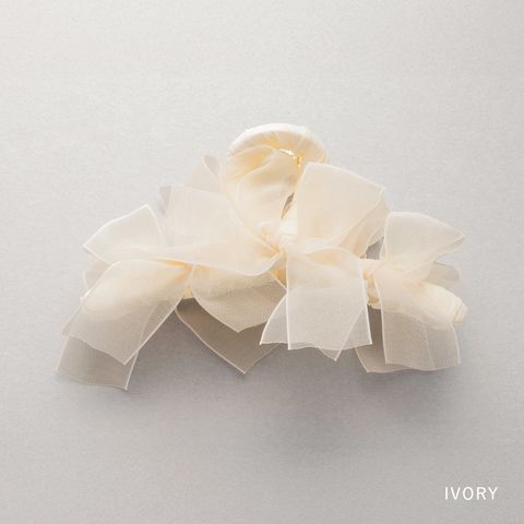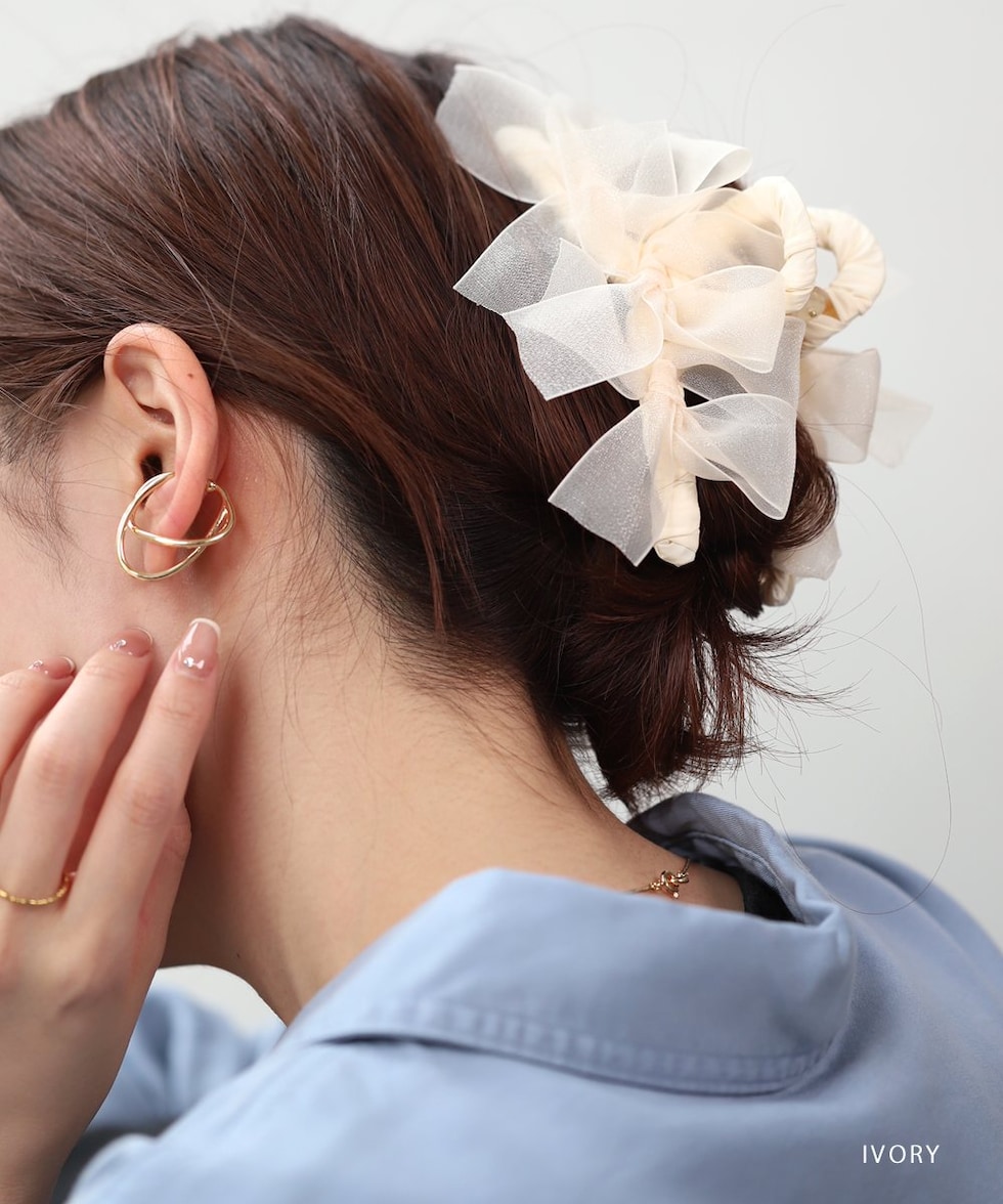 存在感抜群、シアーリボンを並べたバンスクリップ。さりげなく煌めくグリッターと透け感あるデザインが華やかでボリューム感満点。大人フェミニンに仕上げてくれるアイテムです。