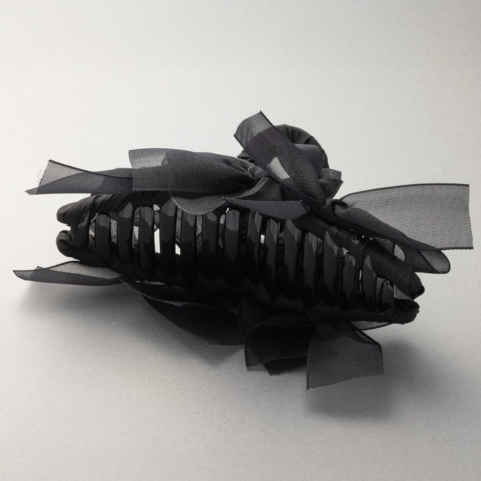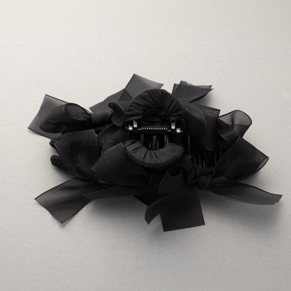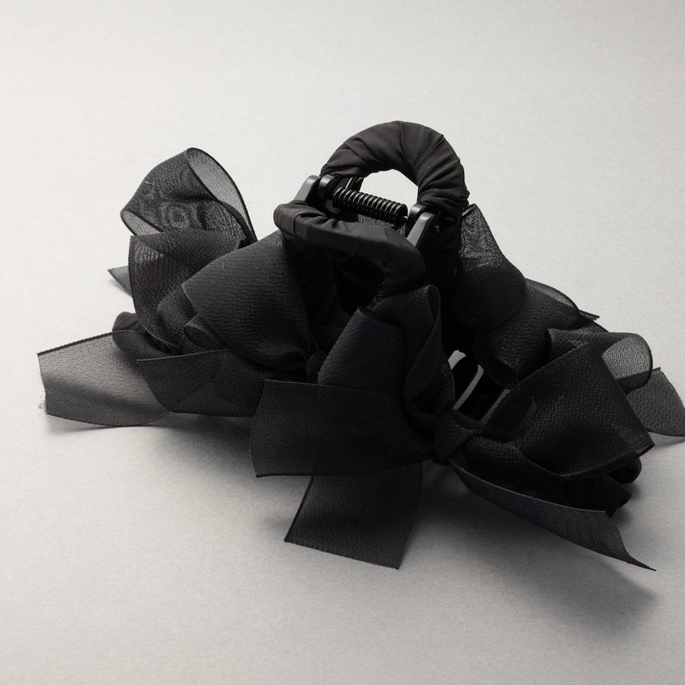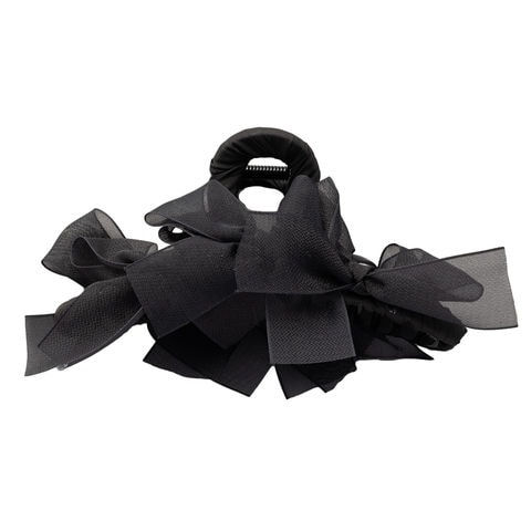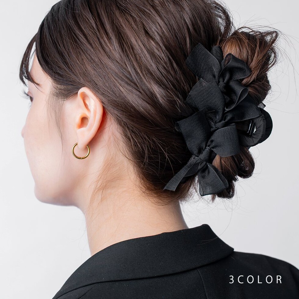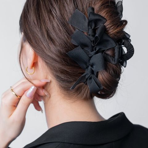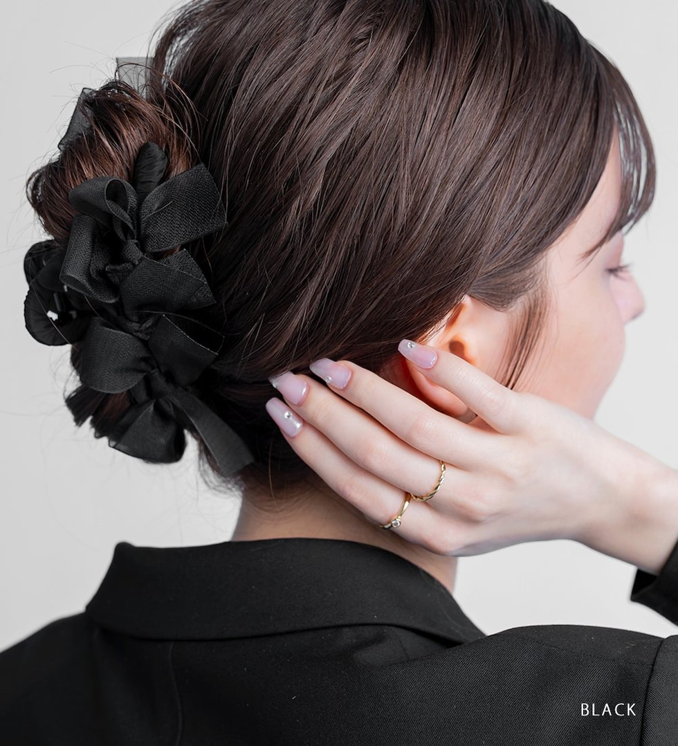 存在感抜群、シアーリボンを並べたバンスクリップ。さりげなく煌めくグリッターと透け感あるデザインが華やかでボリューム感満点。大人フェミニンに仕上げてくれるアイテムです。