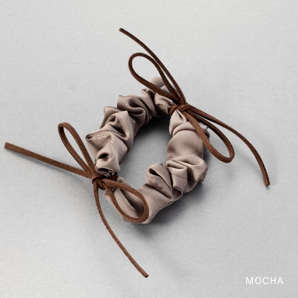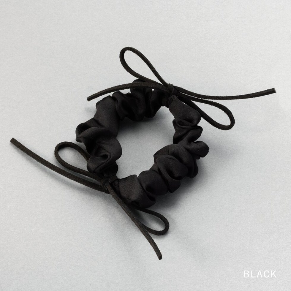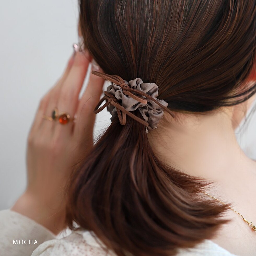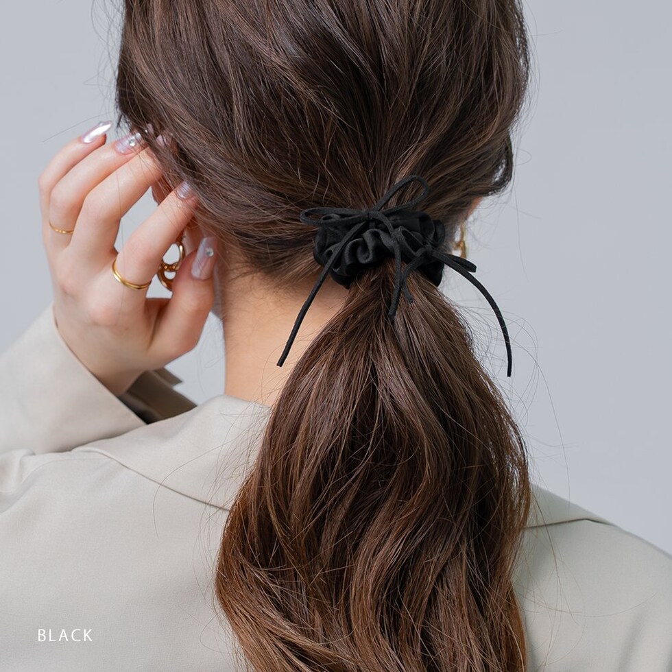 細めのスエードリボンがアクセントのシュシュ。シックな色合いの小さめシュシュでデイリーに使いやすいデザイン。甘すぎず洒落感たっぷりで周りと差がつく大人可愛いアイテムです。