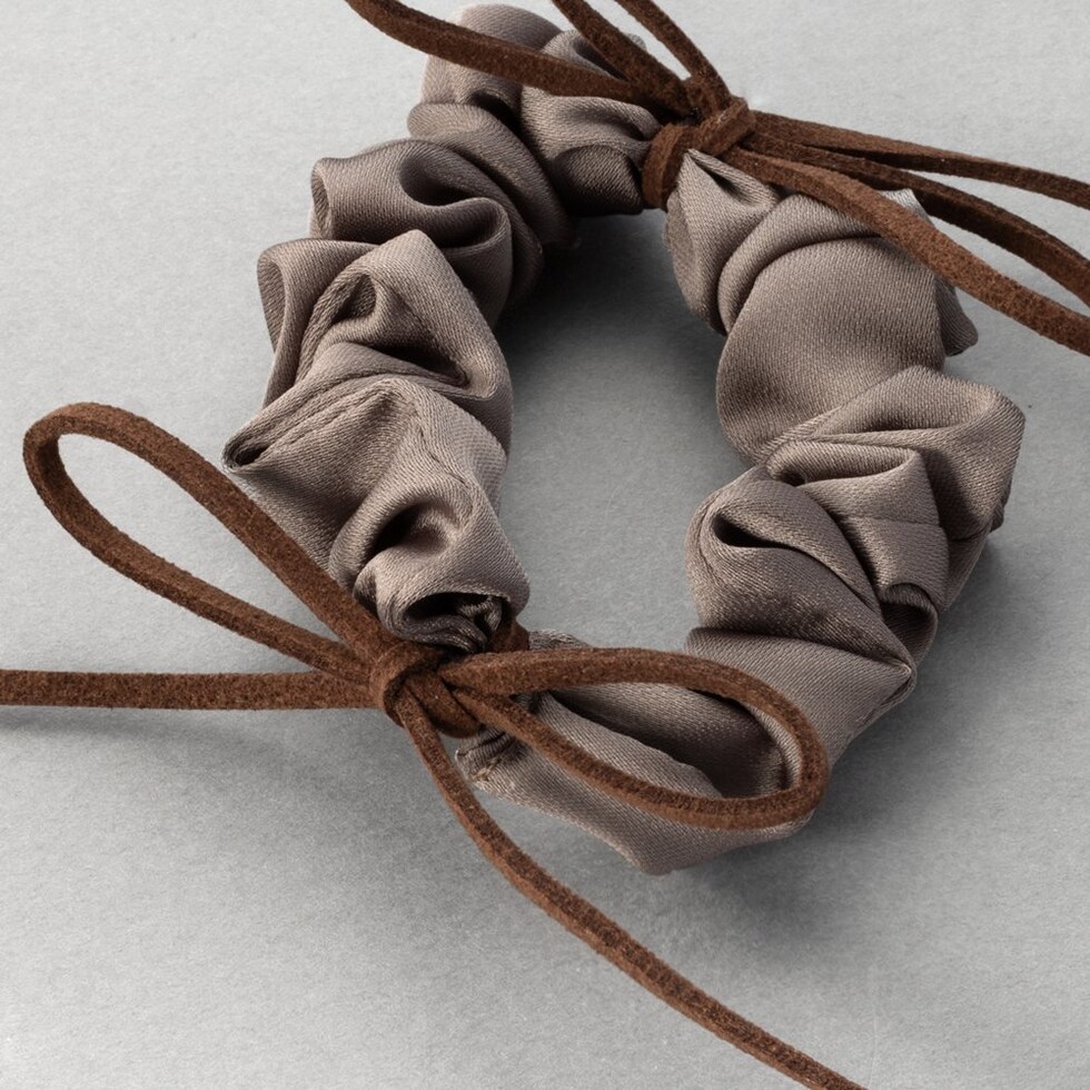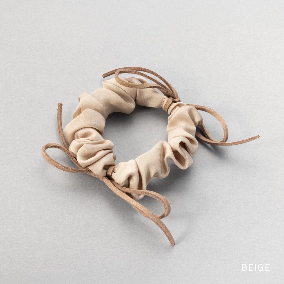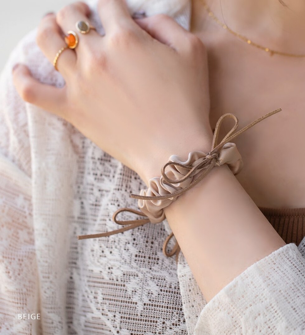 細めのスエードリボンがアクセントのシュシュ。シックな色合いの小さめシュシュでデイリーに使いやすいデザイン。甘すぎず洒落感たっぷりで周りと差がつく大人可愛いアイテムです。