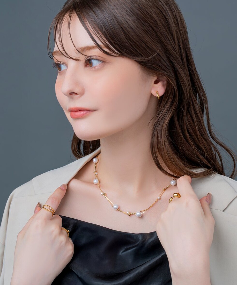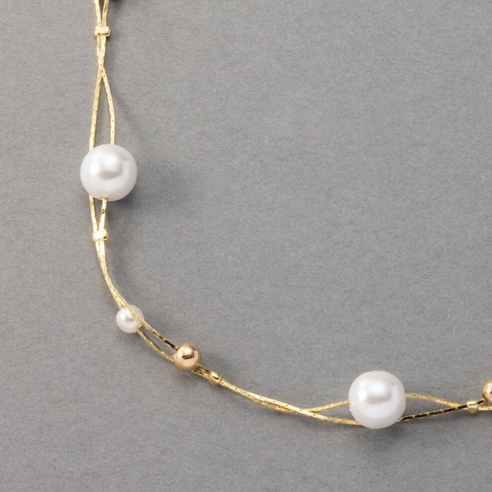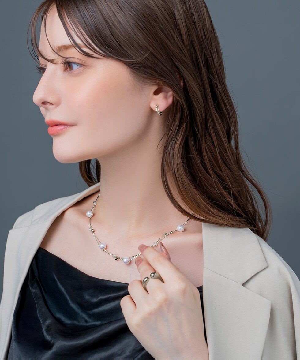 大きさの異なるパールを編み込んだようなネックレス。華奢な2本のチェーンがパールの存在感を引き立て、華やかな雰囲気を演出します。コーデを品良く仕上げ、様々なシーンに活躍してくれるひと品。