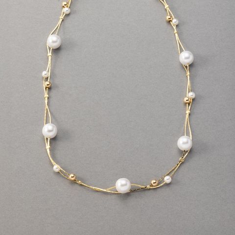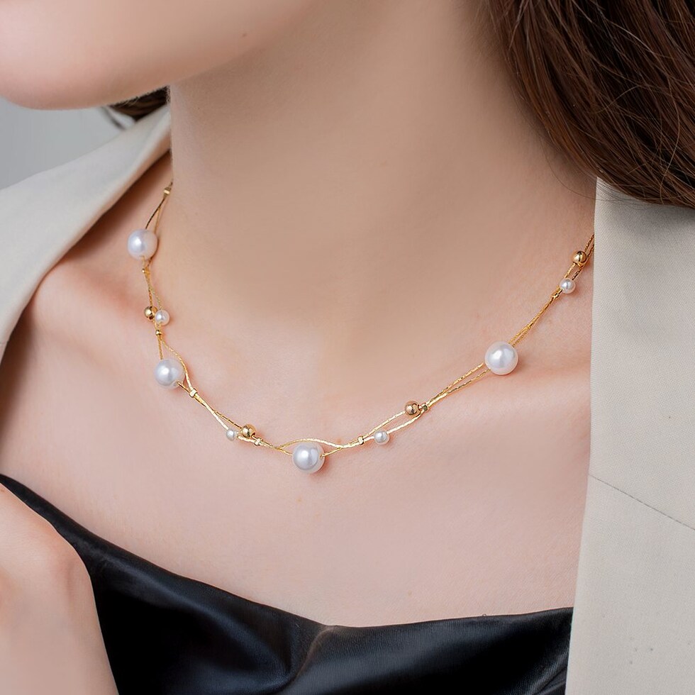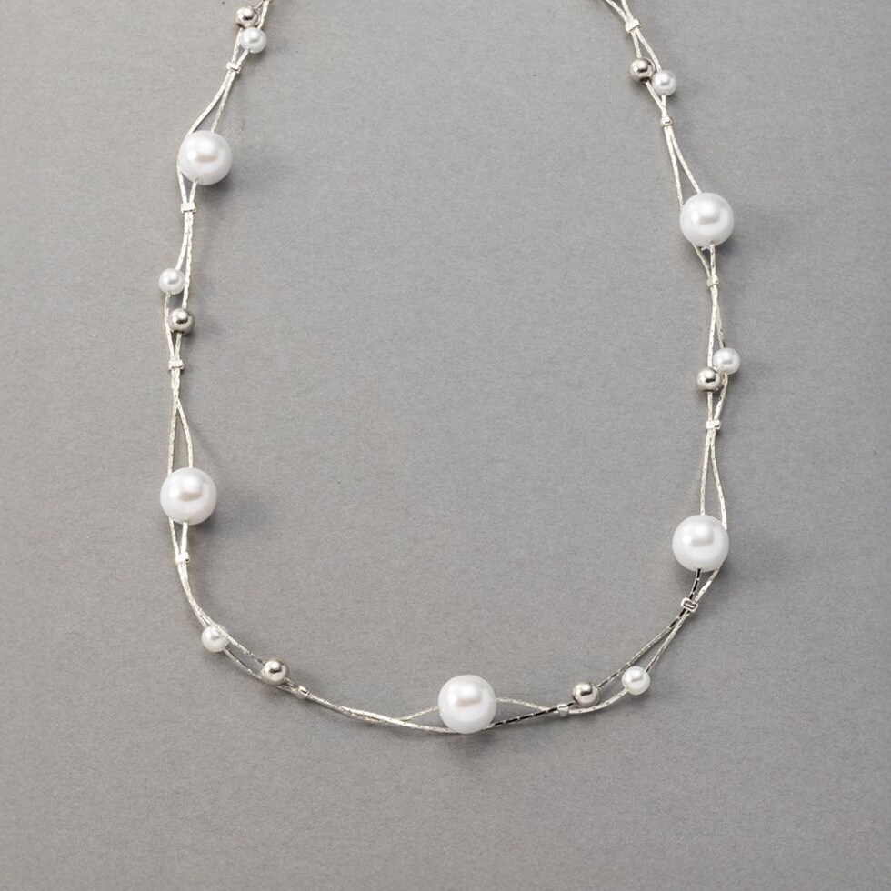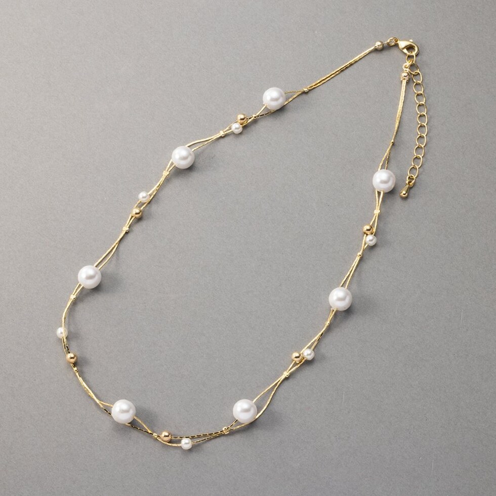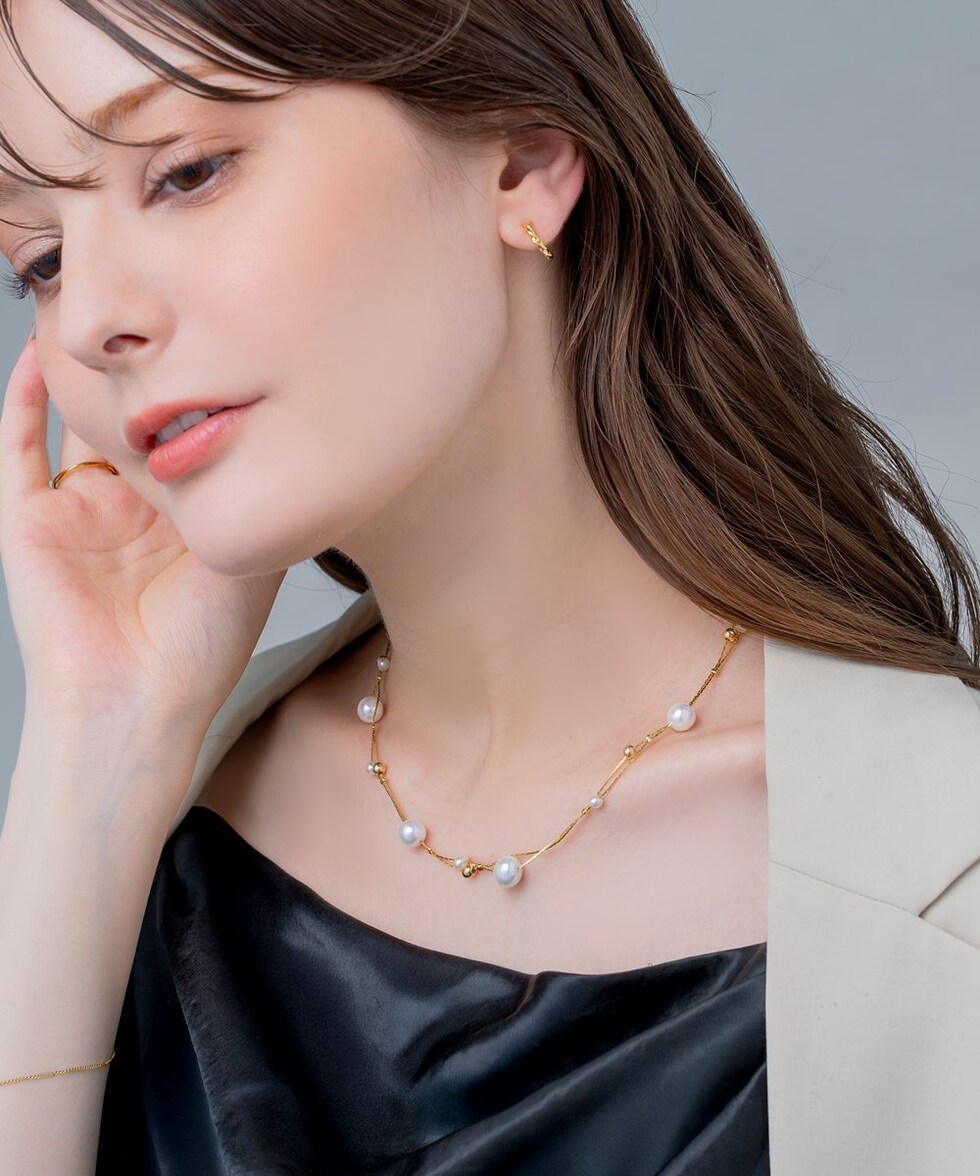 大きさの異なるパールを編み込んだようなネックレス。華奢な2本のチェーンがパールの存在感を引き立て、華やかな雰囲気を演出します。コーデを品良く仕上げ、様々なシーンに活躍してくれるひと品。