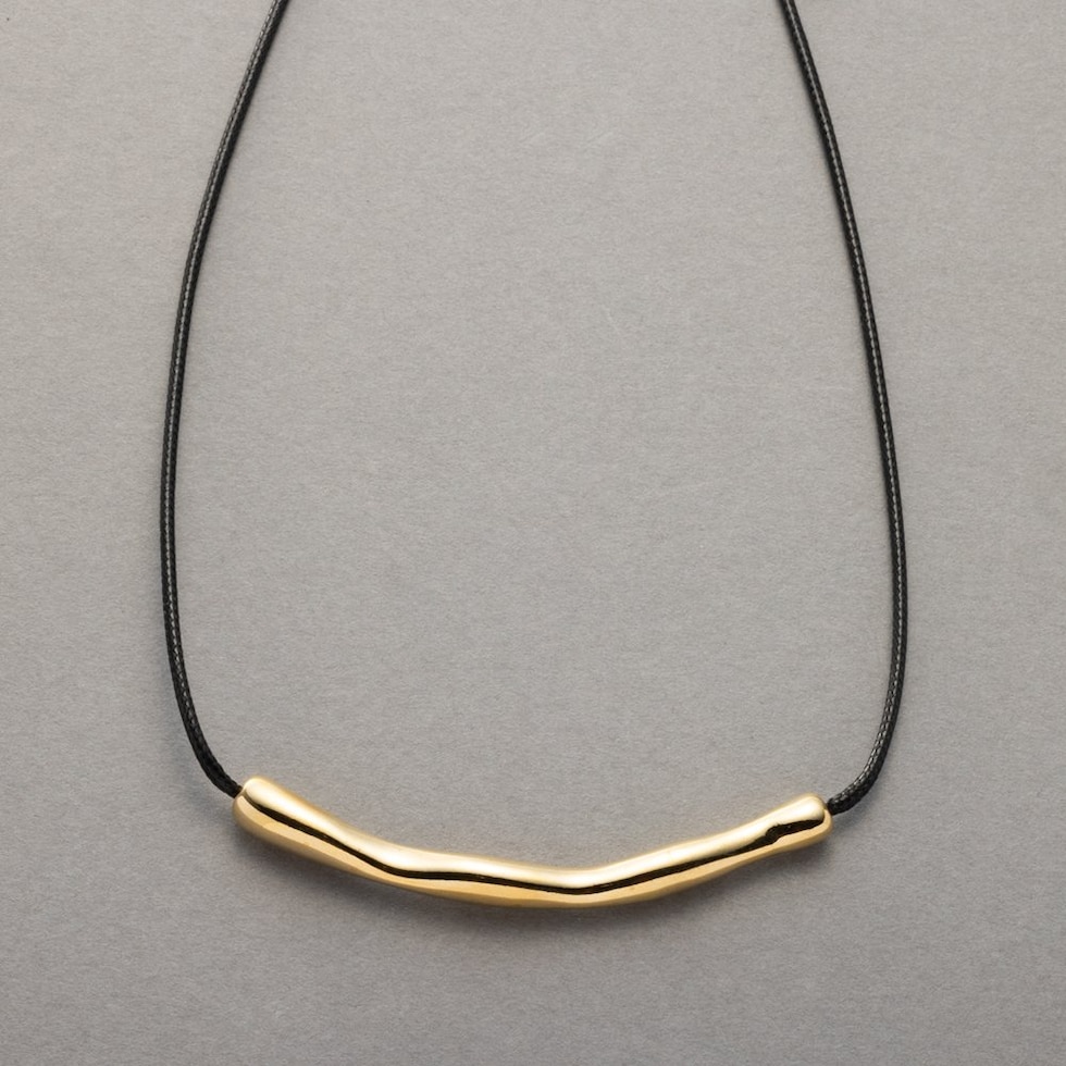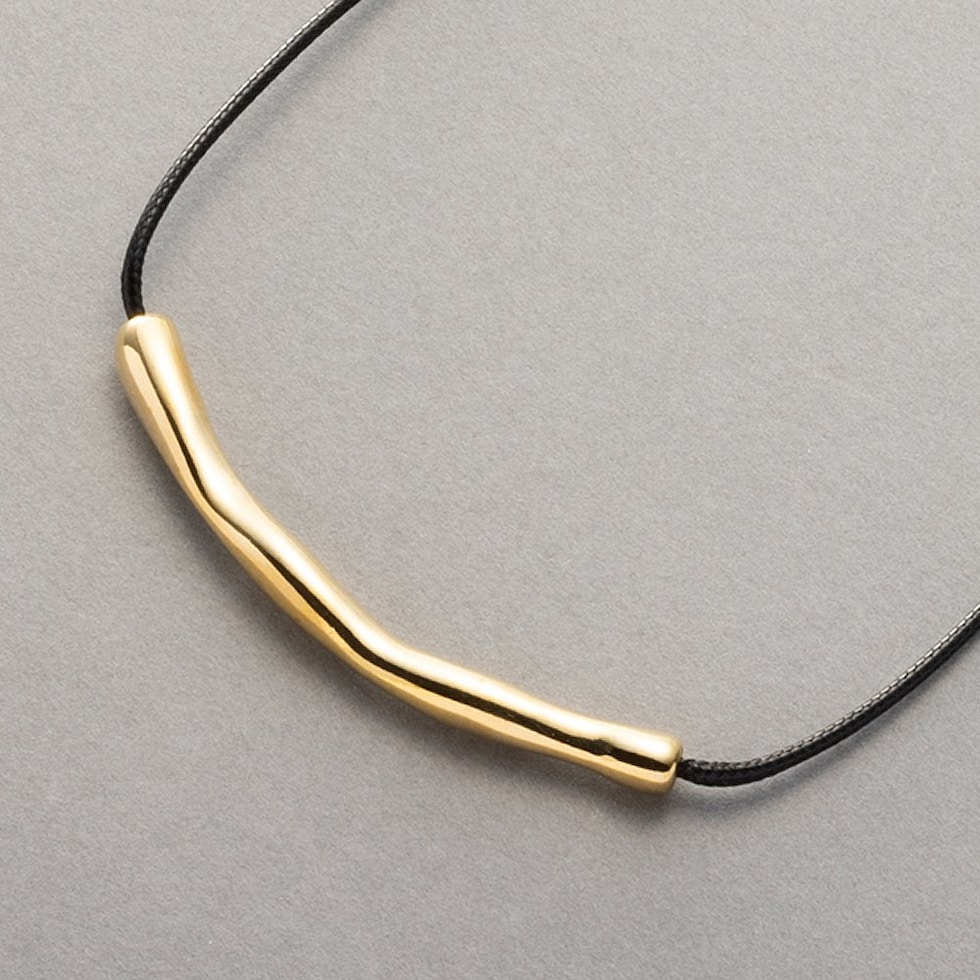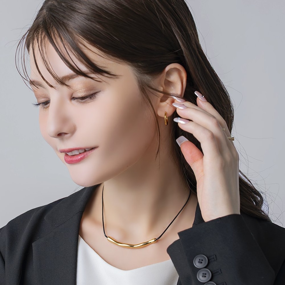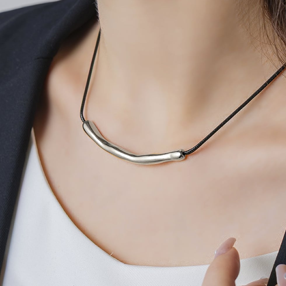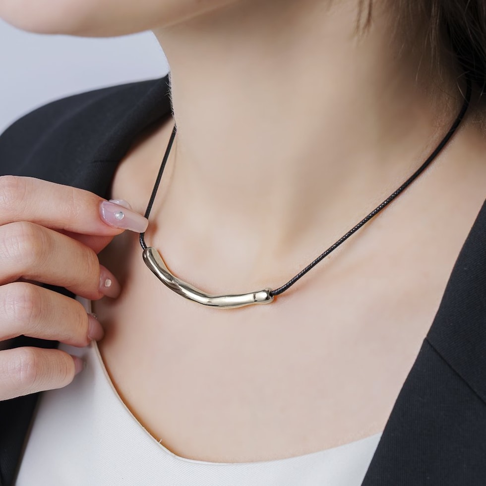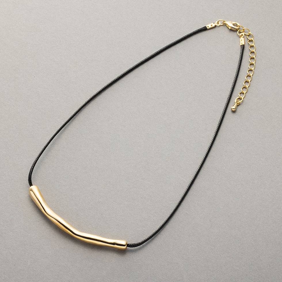 ニュアンスパイプのレザーコードネックレス。“ゆがみ”の効いたメタルとトレンドのレザーコードが相性バツグン。これひとつで普段のコーデを即旬顔にチェンジしてくれます◎シンプルな大人スタイルに取り入れてみて。