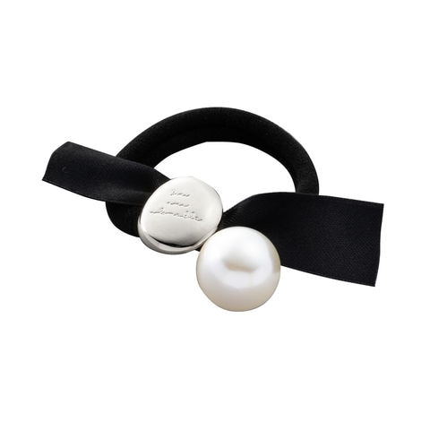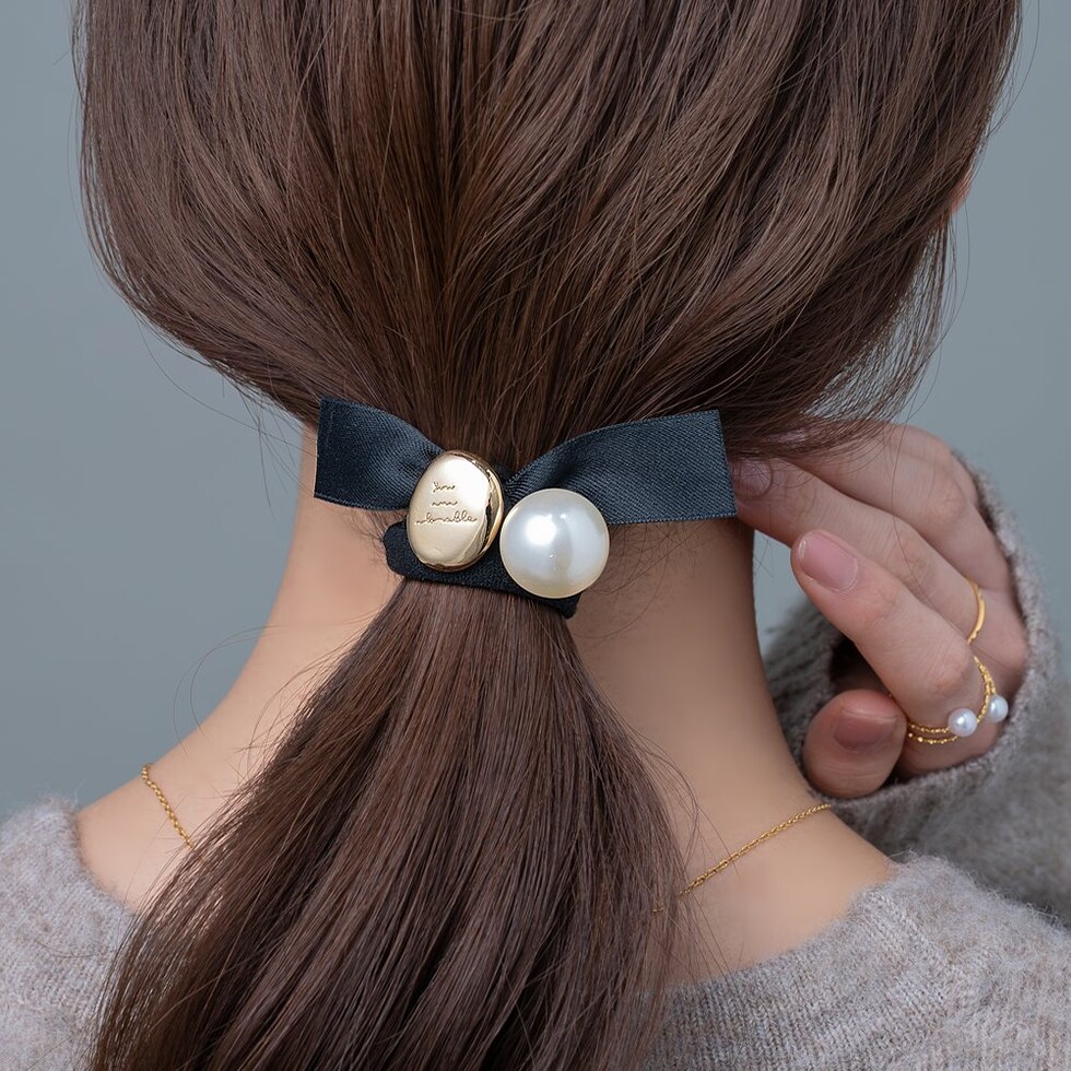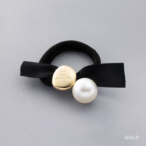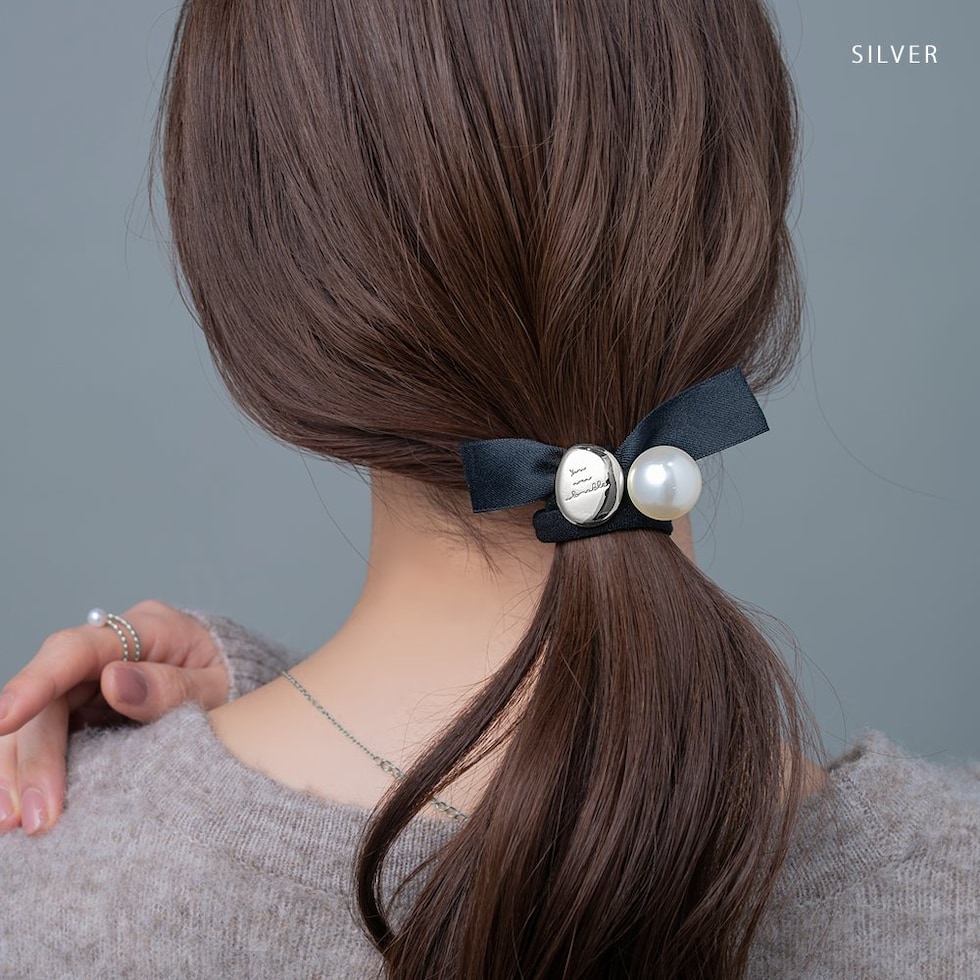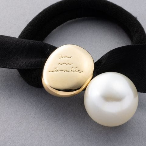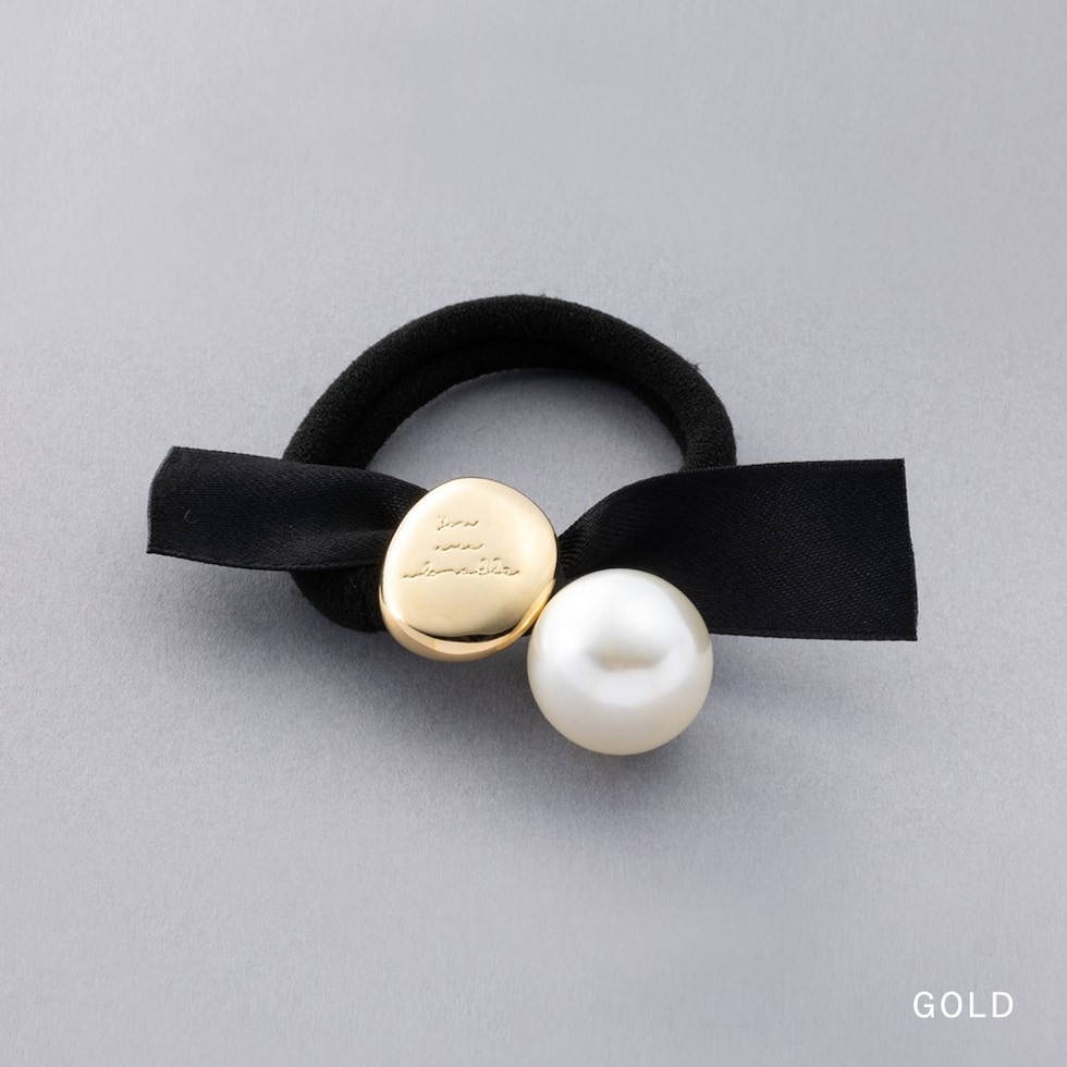 メッセージが刻印された変形メタルプレートと艶めくパールがついたリボンヘアゴム。キレイめスタイルからカジュアルまで幅広く使える大人かわいいアイテム◎サッとつけられて、後ろ姿にアクセントを添えてくれます。