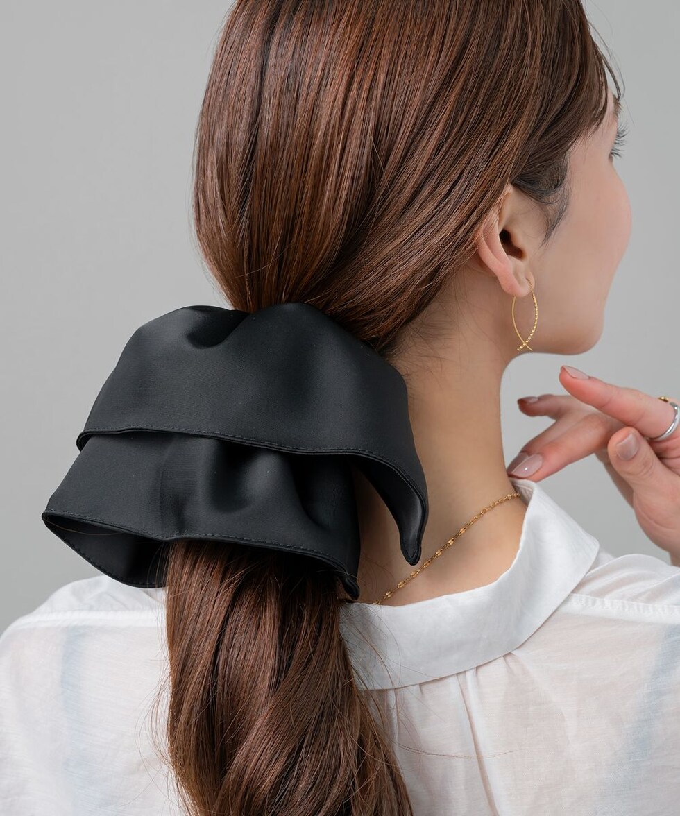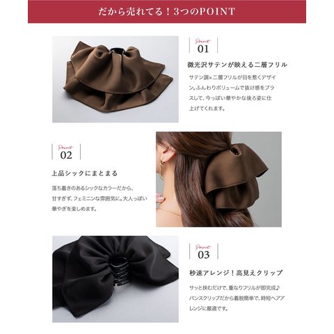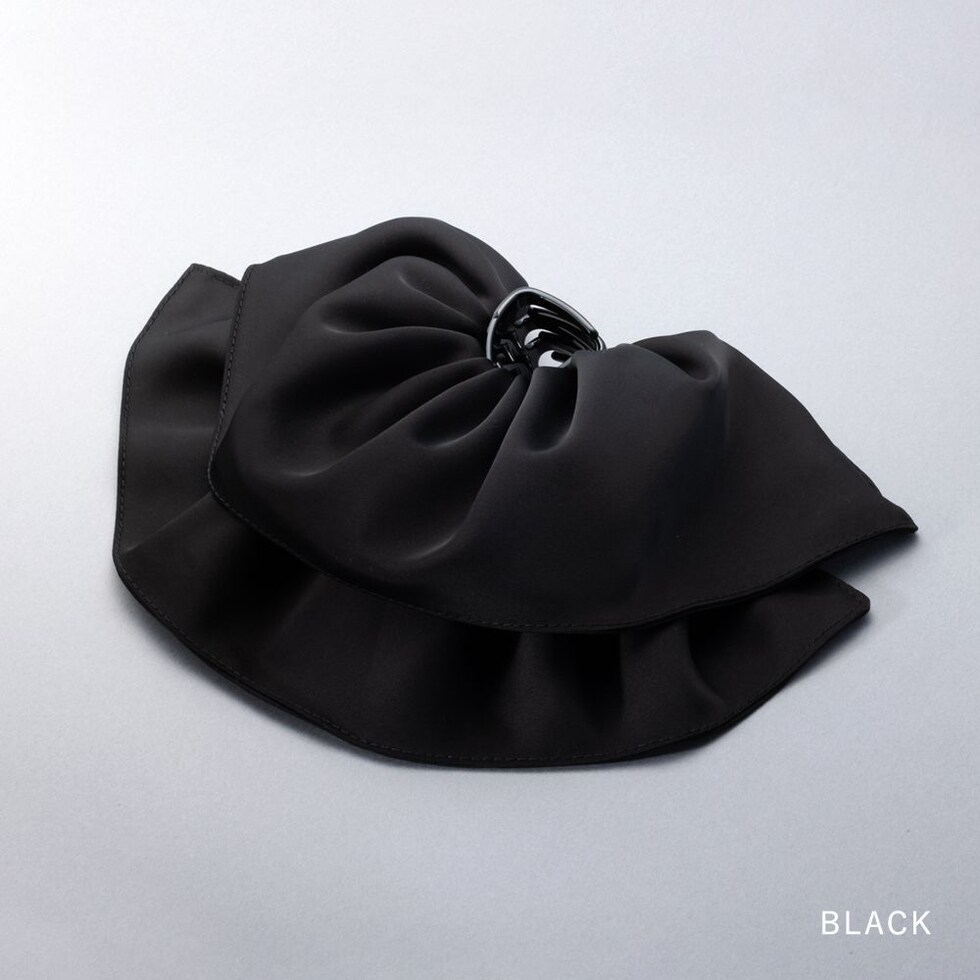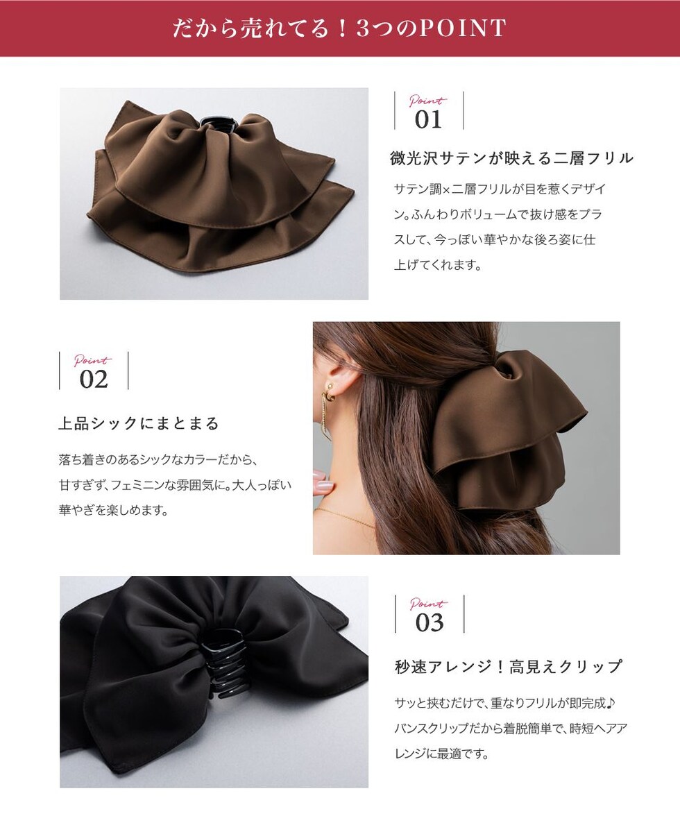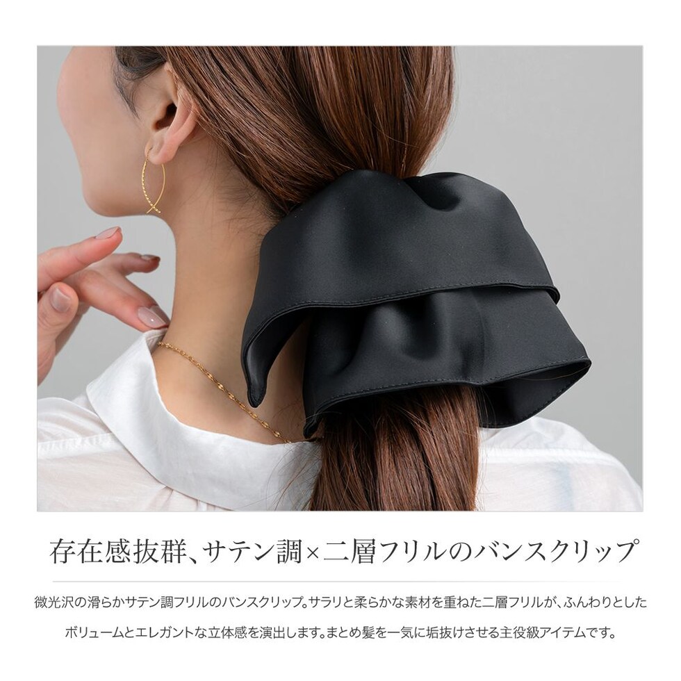 微光沢の滑らかサテン調フリルのバンスクリップ。サラリと柔らかな素材を重ねた二層フリルが、ふんわりとしたボリュームとエレガントな立体感を演出します。まとめ髪を一気に垢抜けさせる主役級アイテムです。