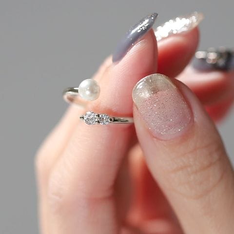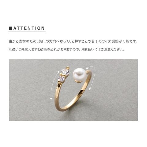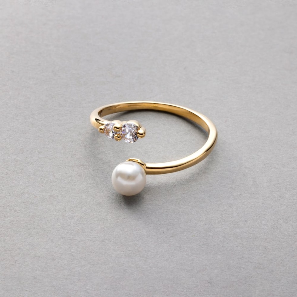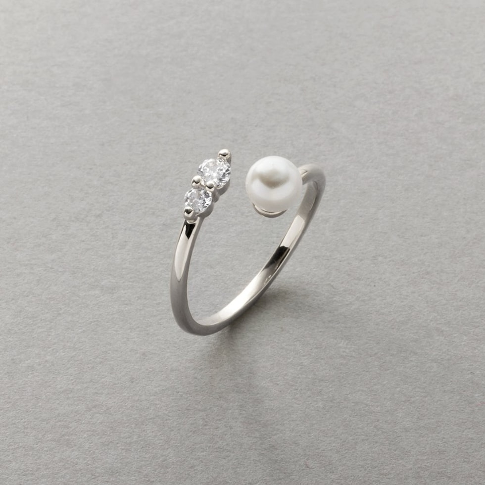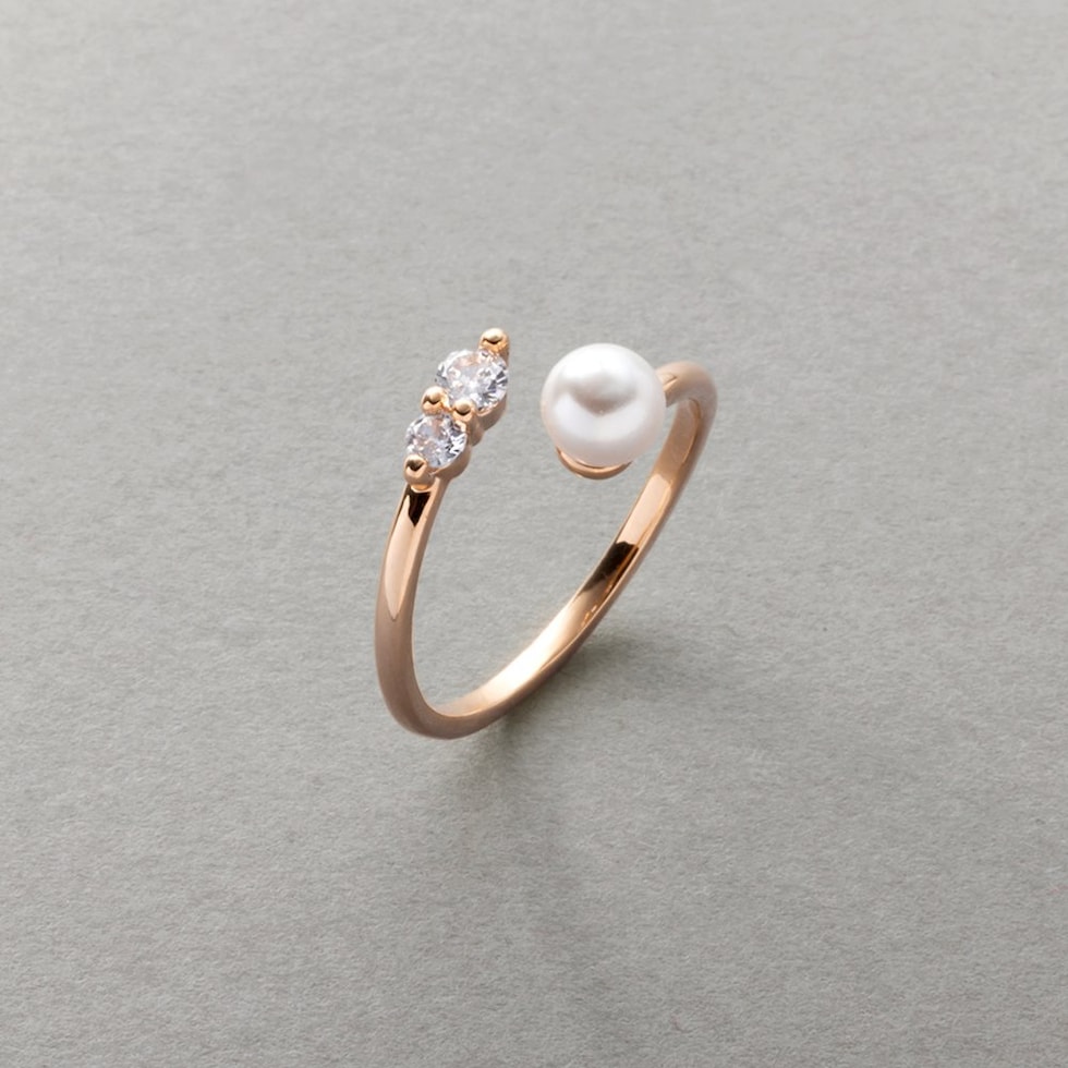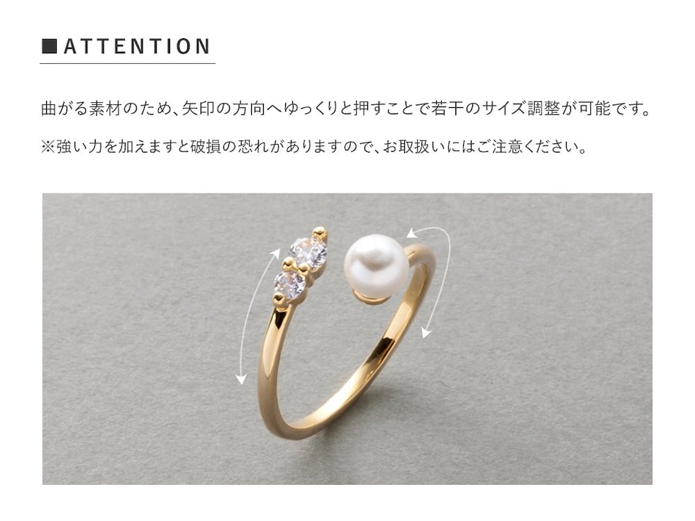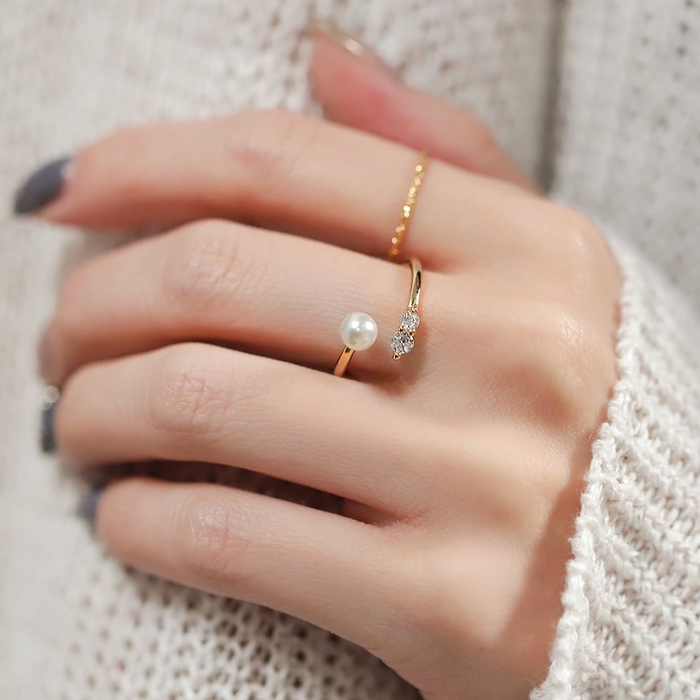 パールと2粒のビジューが品良く煌めくリング。サイズ調整可能なオープンデザインで、お好みの指に着けられるのも嬉しいひと品。さりげなくも美しく指先を魅せてくれるオススメのアイテムです。