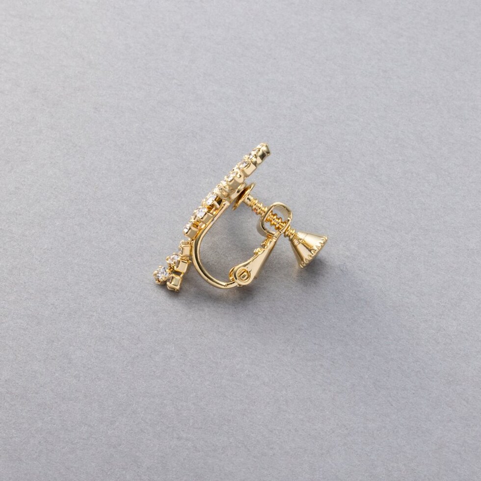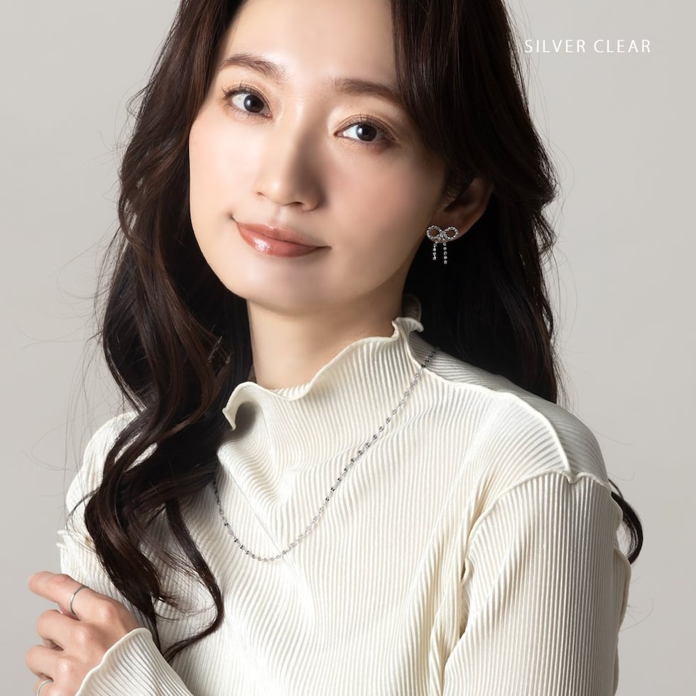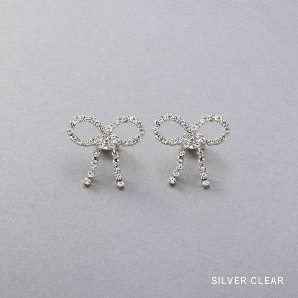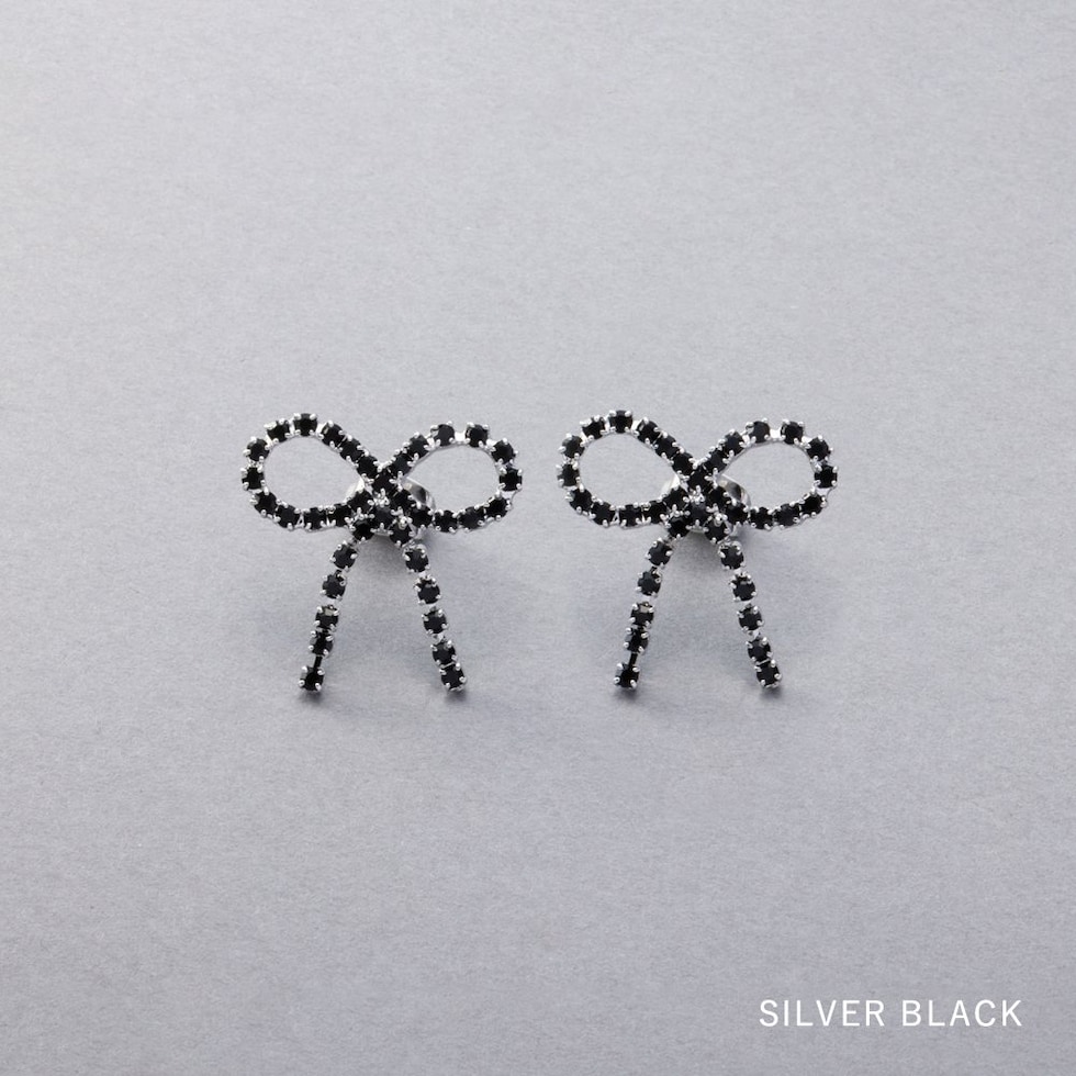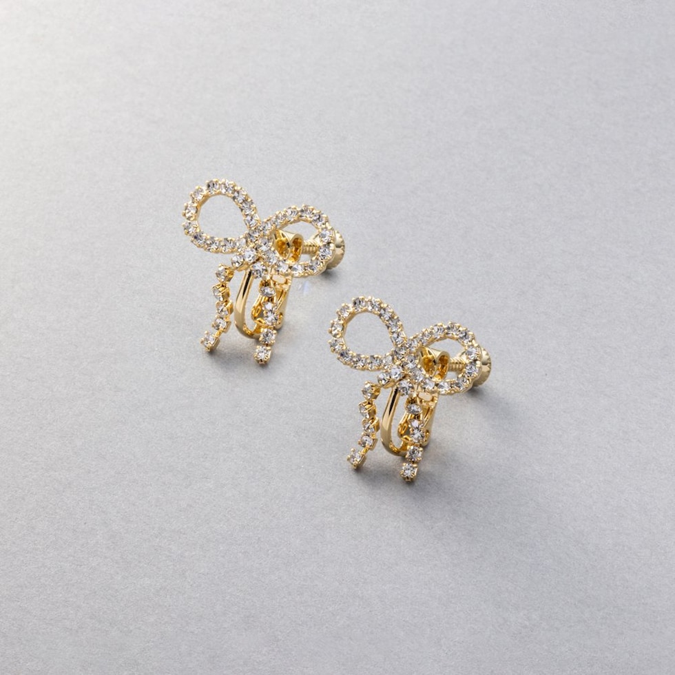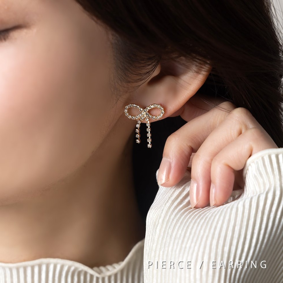 繊細な煌めきを放つビジューラインのリボンモチーフピアス/イヤリング。リボンのエンド部分はちょい揺れするデザインになっていて、お顔周りに華やぎを添えてくれます。女性ならではのリボンモチーフで可憐な印象も演出◎カジュアルコーデの外しアイテムとしてもオススメです。低アレルギーのチタンポストを使用しているので、長時間の着用も安心です。