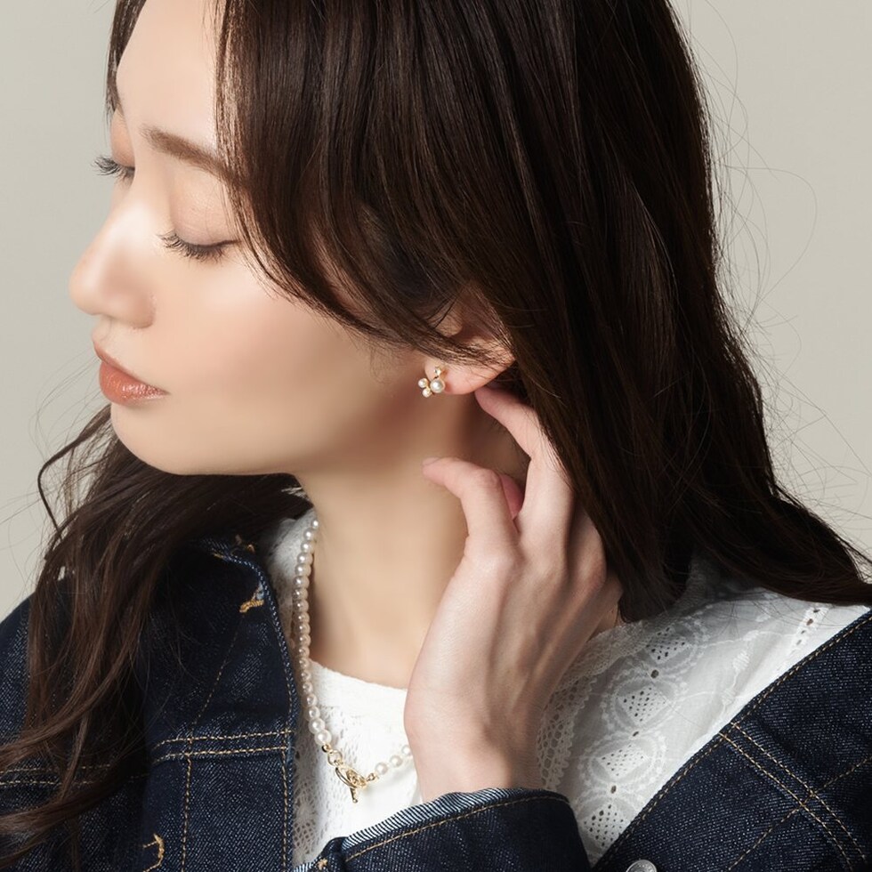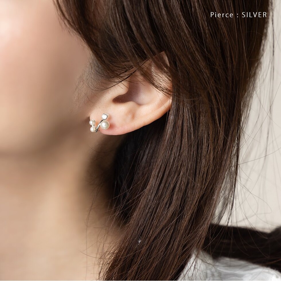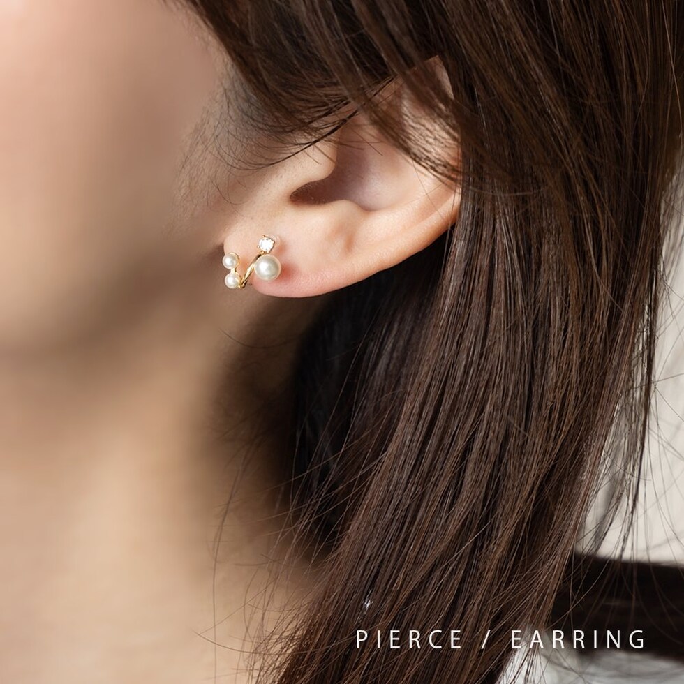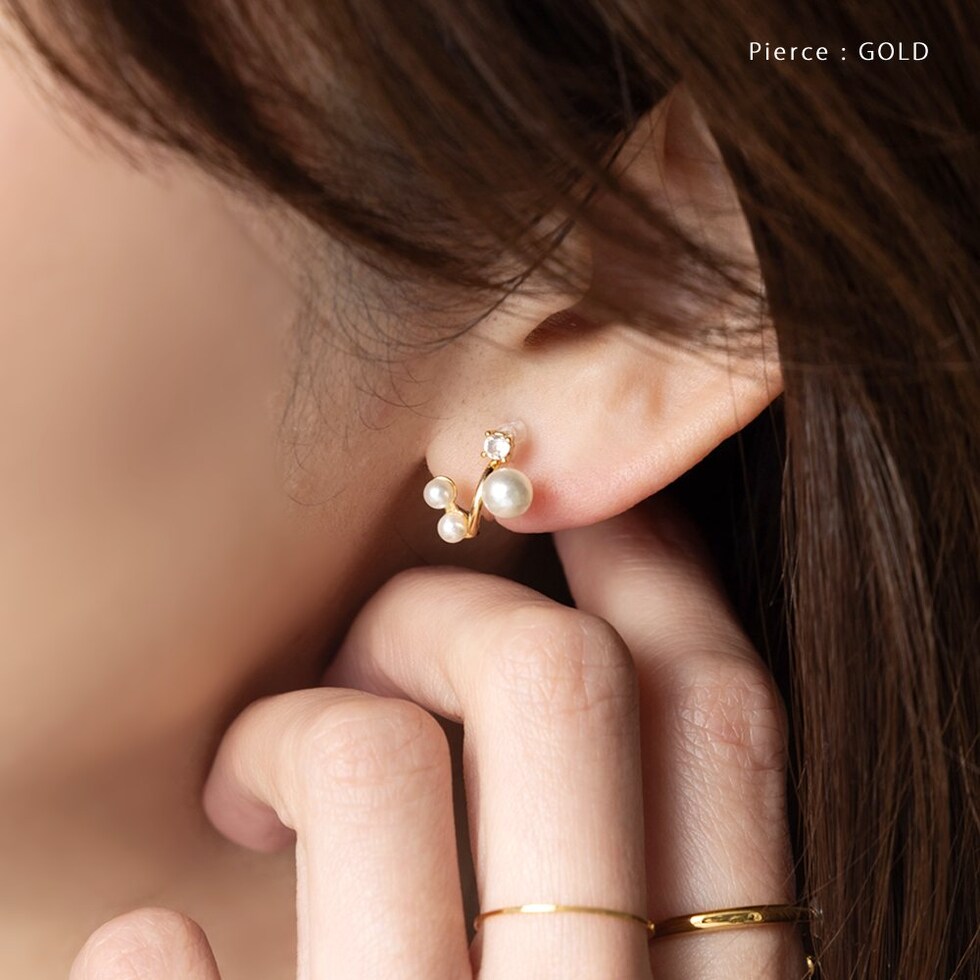 華奢なドローイングラインにパールとビジューを飾ったピアス/イヤリング。大小3粒の艶パールと小粒のジルコニアを並べた女性らしさ満点のデザインでお顔周り華やか。主張しすぎない絶妙に華奢なボリューム感でオトナっぽく上品な雰囲気に◎