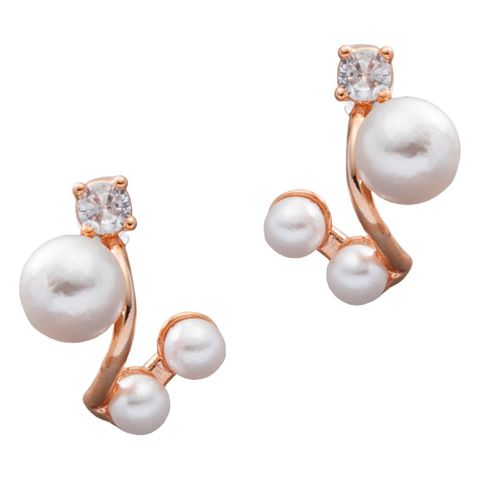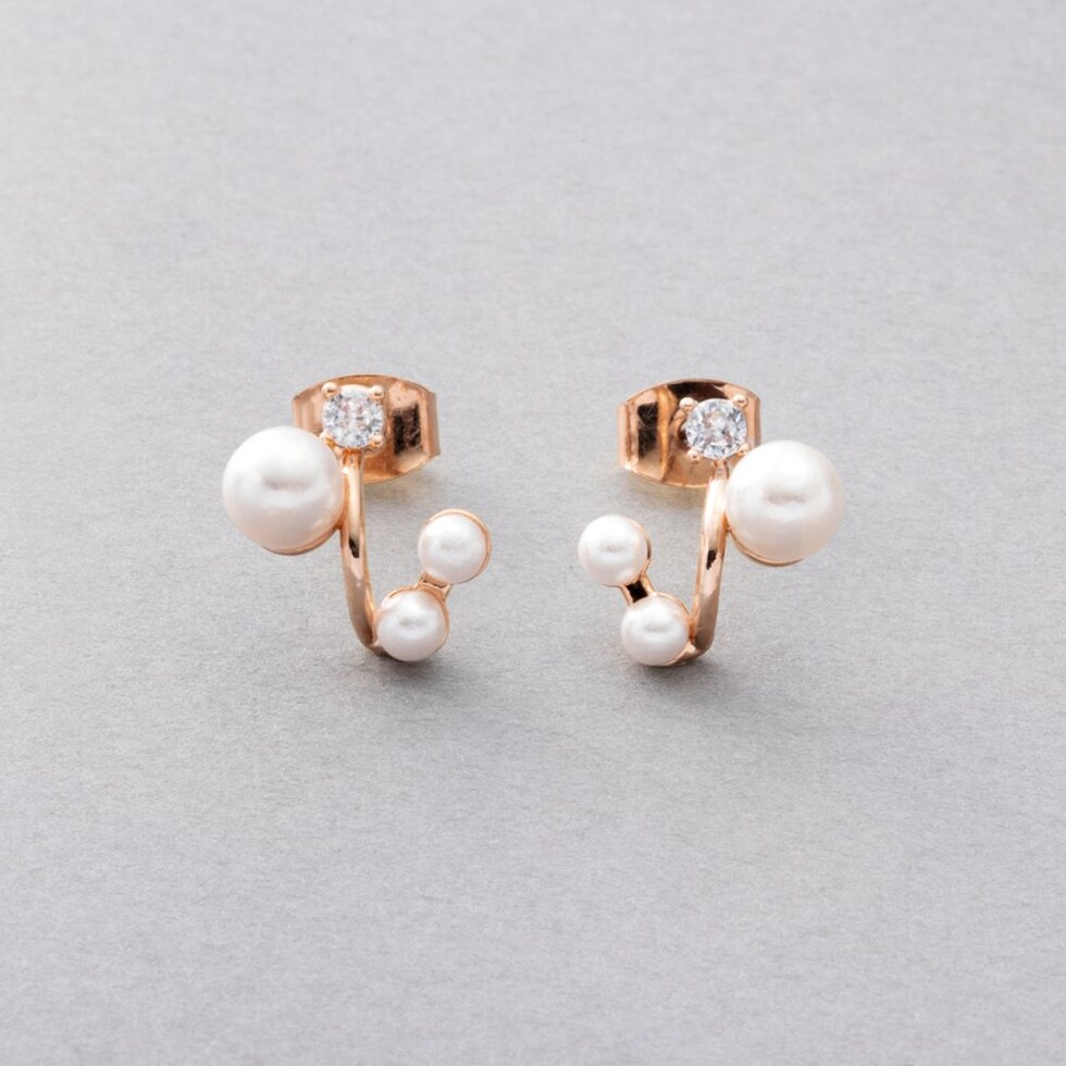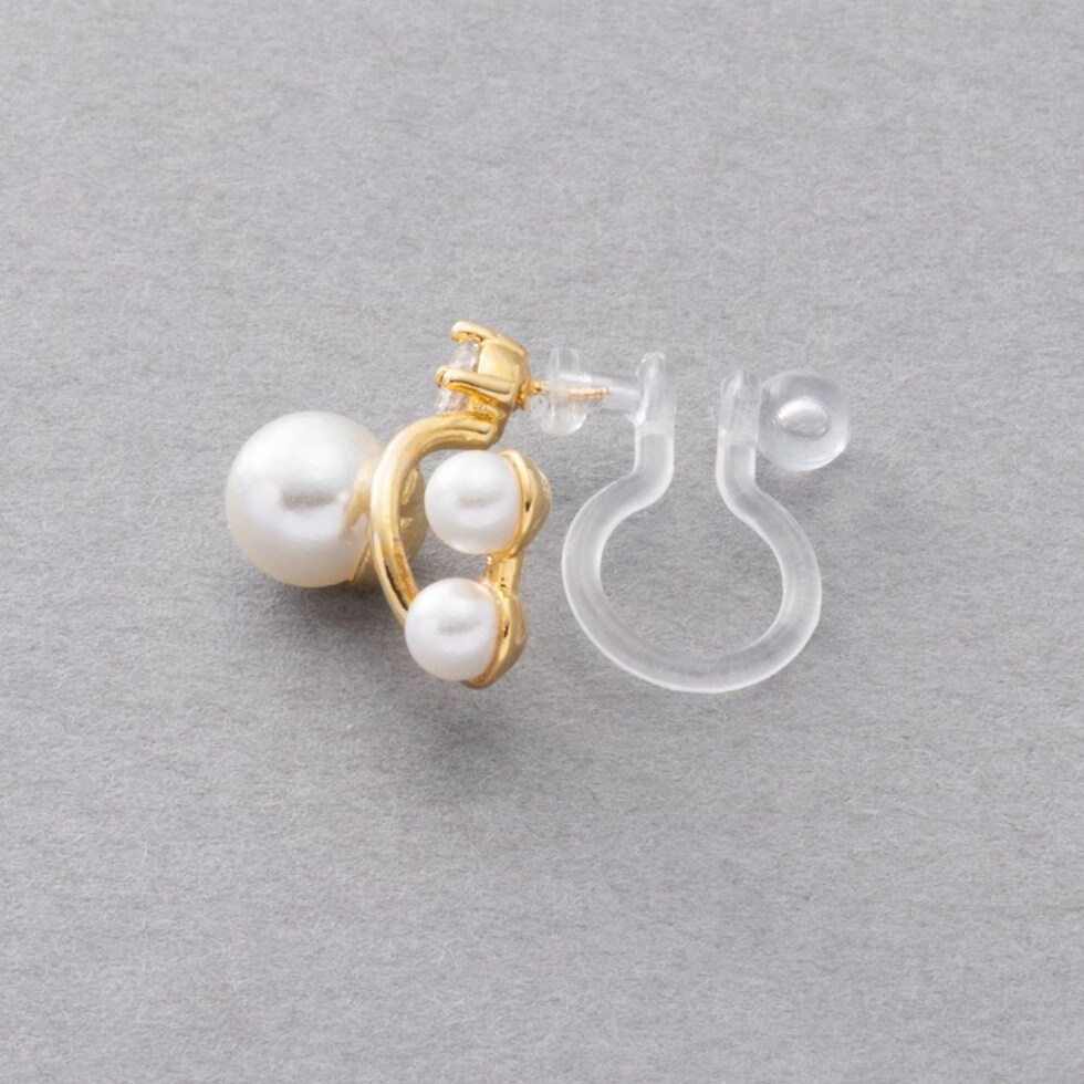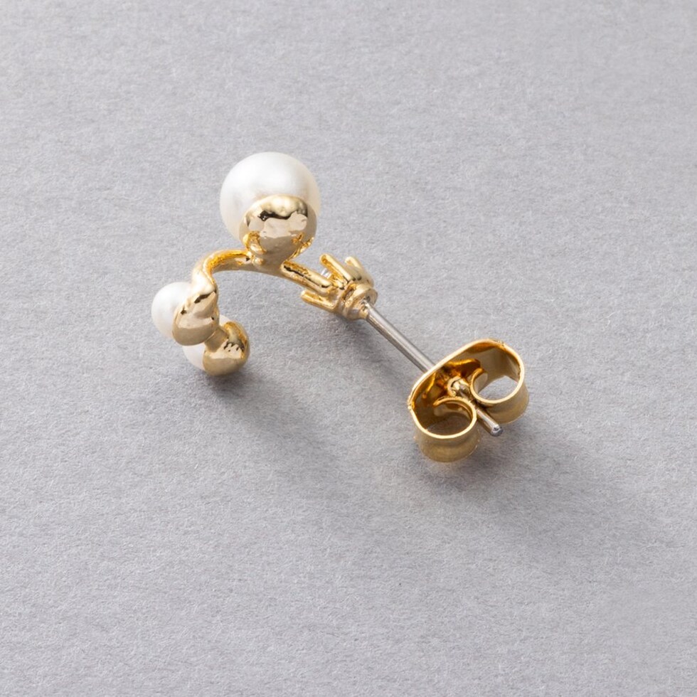 華奢なドローイングラインにパールとビジューを飾ったピアス/イヤリング。大小3粒の艶パールと小粒のジルコニアを並べた女性らしさ満点のデザインでお顔周り華やか。主張しすぎない絶妙に華奢なボリューム感でオトナっぽく上品な雰囲気に◎