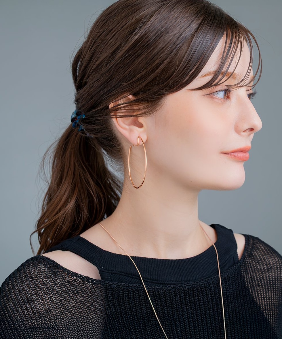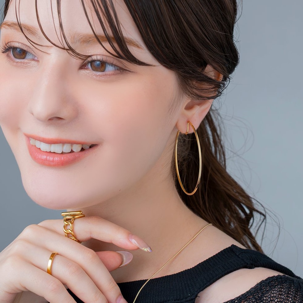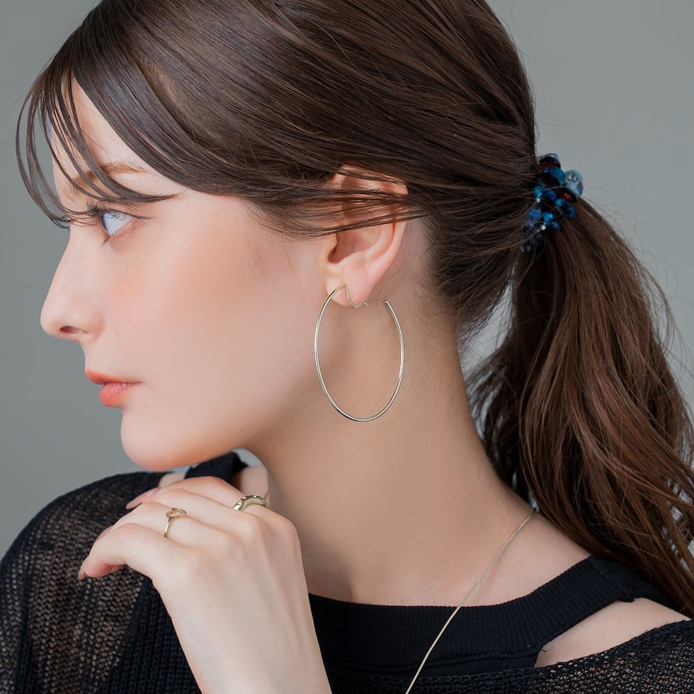 シンプルで細身のメタルが艶めくフープイヤリング。大胆なサイジングで他にはない存在感を放ちます。コーデのアクセントにピッタリなひと品です。