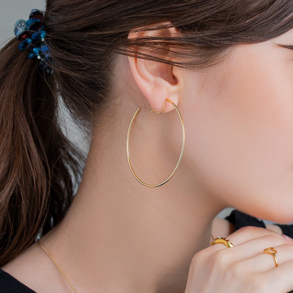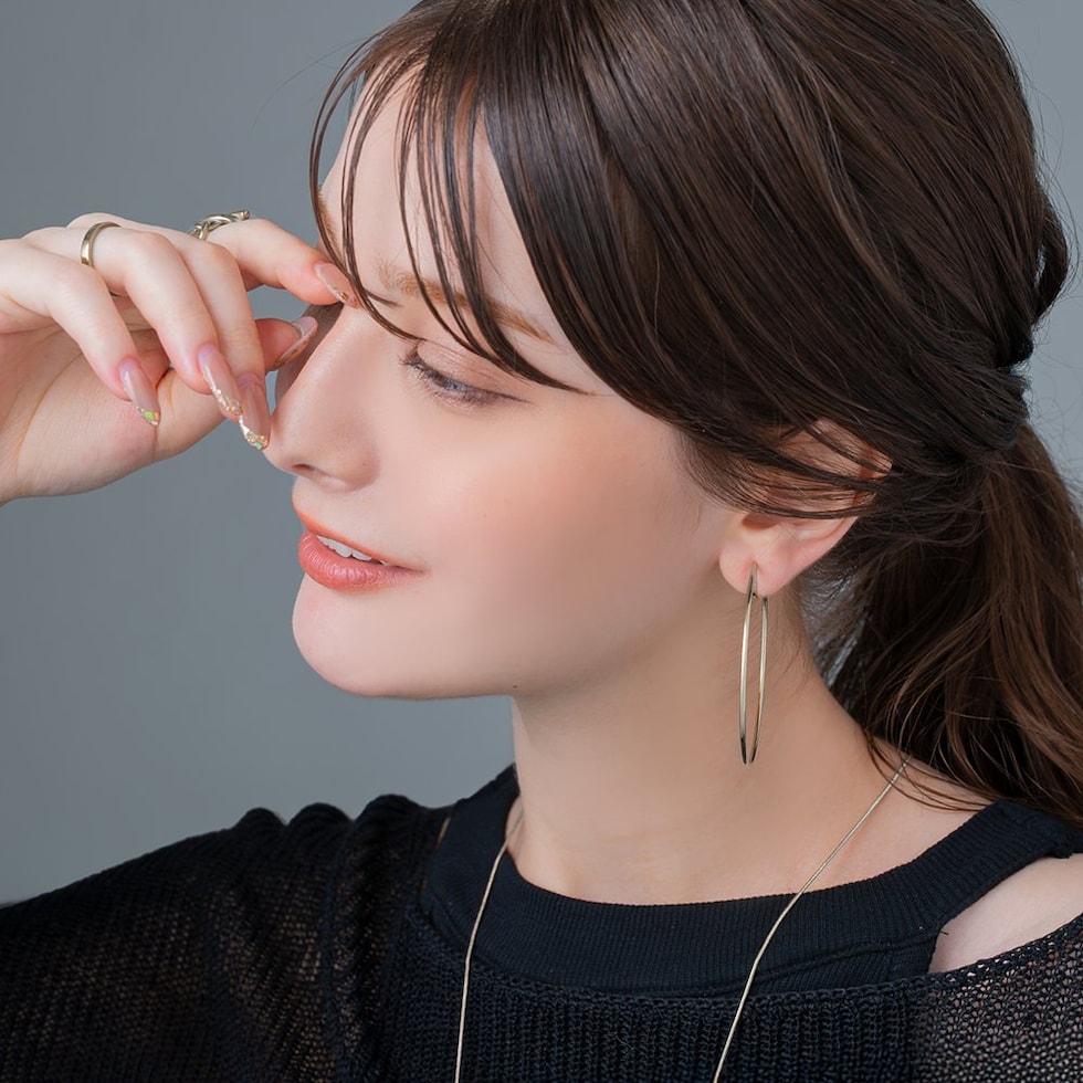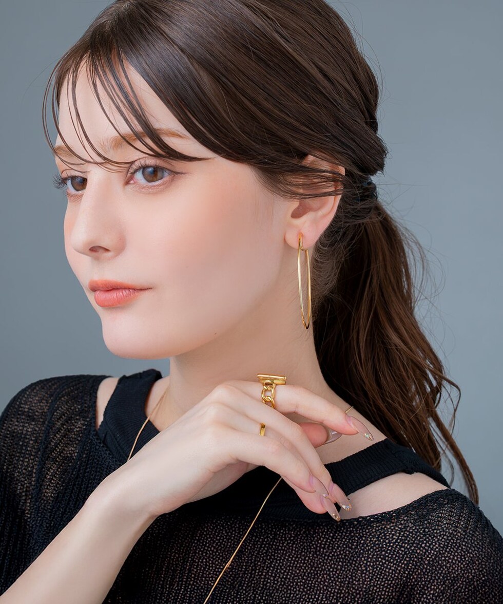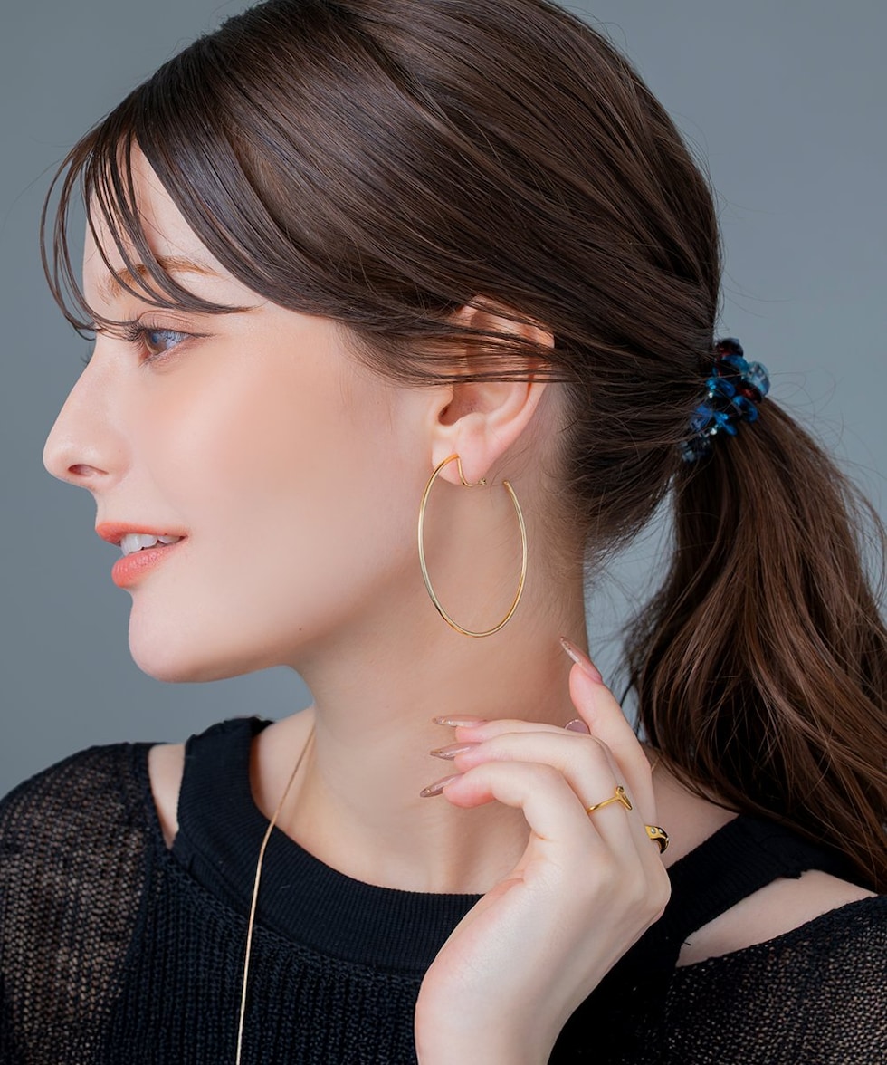 シンプルで細身のメタルが艶めくフープイヤリング。大胆なサイジングで他にはない存在感を放ちます。コーデのアクセントにピッタリなひと品です。