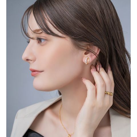 オープンアーモンドのイヤリング/ピアス。カーブラインとビジューがつくるアーモンドフォルムが耳元を女性らしい華やかな印象を演出します。どんなスタイルも品良くマッチして毎日使いに重宝しそう◎