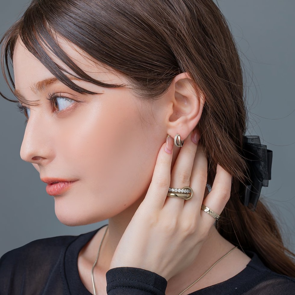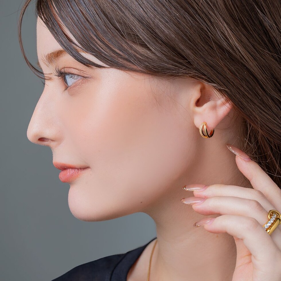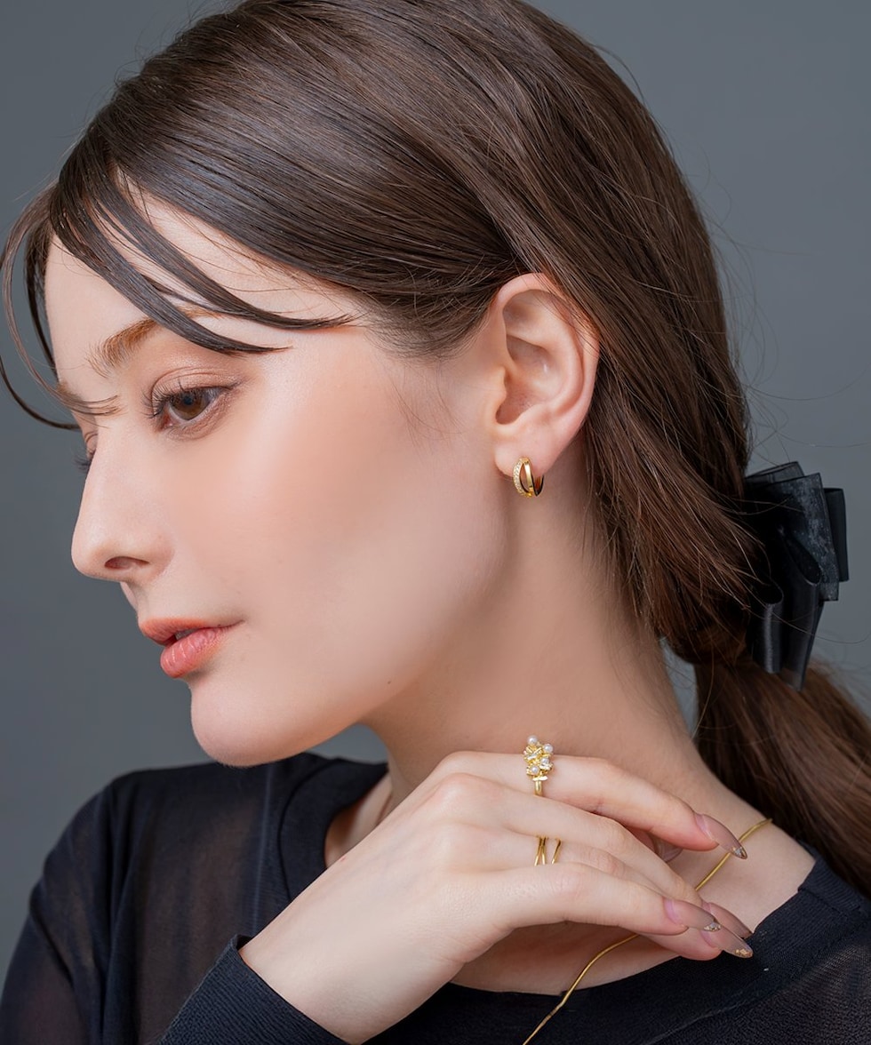 ビジューとメタルのラインが煌めくキャッチレスピアス。耳たぶにフィットするミニマムなサイジングと小粒ビジューが顔周りを品良く演出します。キャッチレスタイプなので、素早く簡単に装着できるのも嬉しいひと品◎