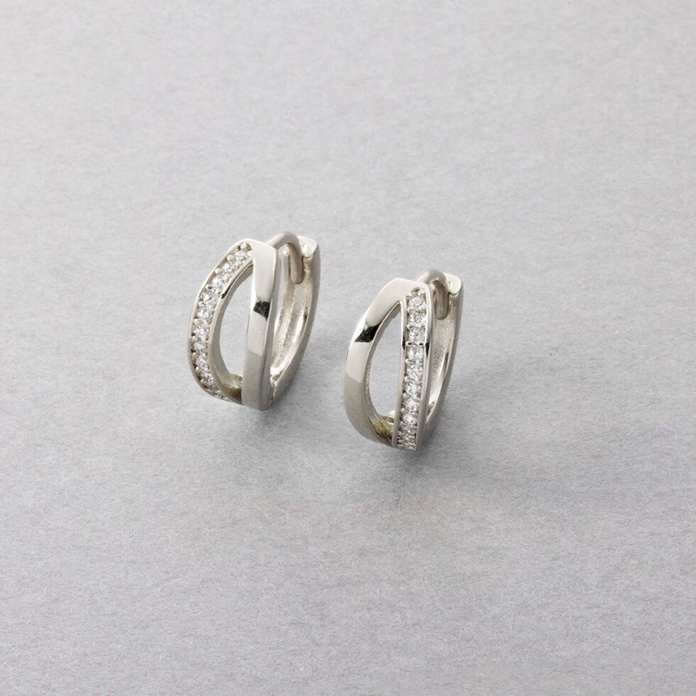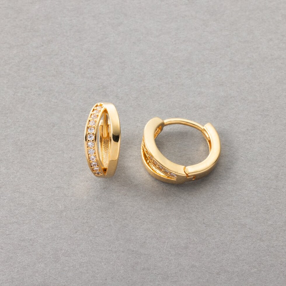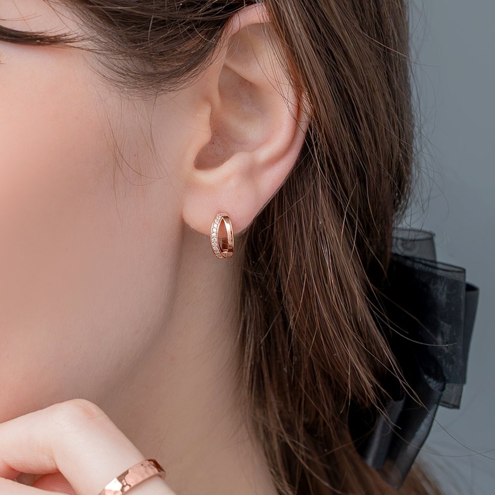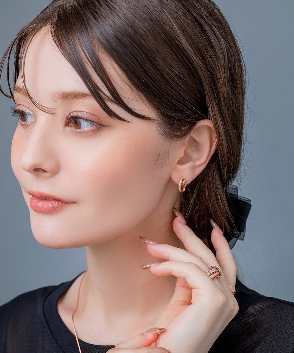 ビジューとメタルのラインが煌めくキャッチレスピアス。耳たぶにフィットするミニマムなサイジングと小粒ビジューが顔周りを品良く演出します。キャッチレスタイプなので、素早く簡単に装着できるのも嬉しいひと品◎