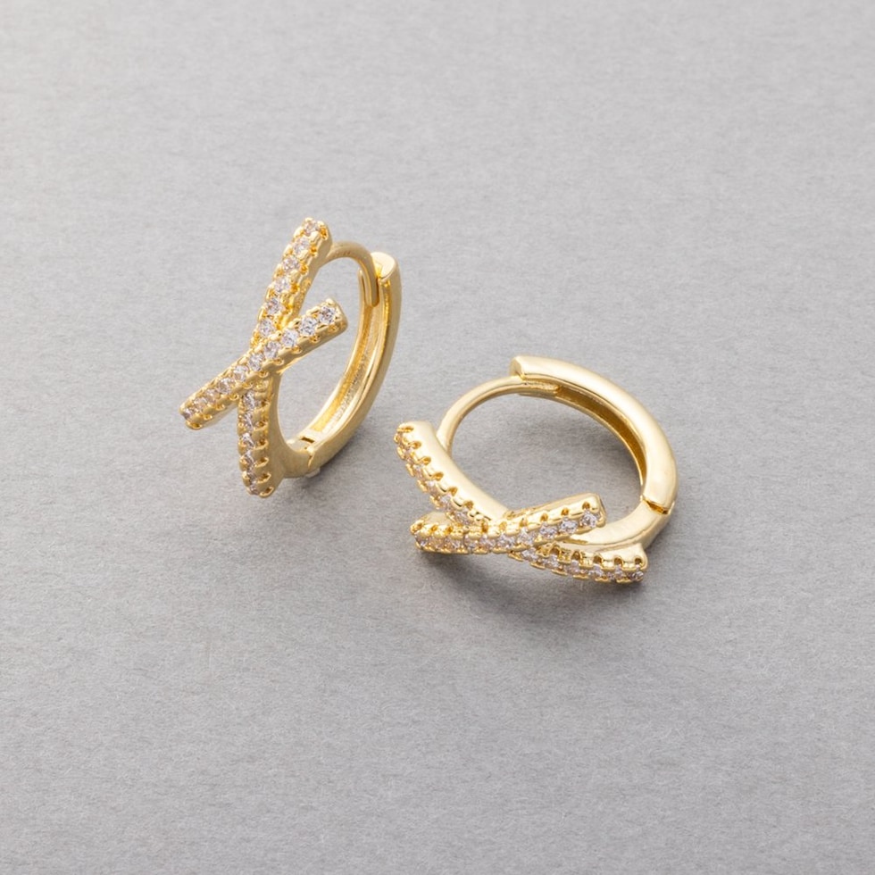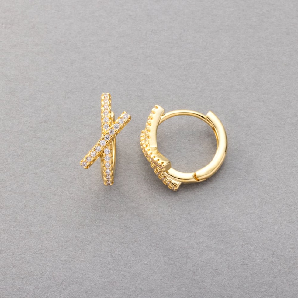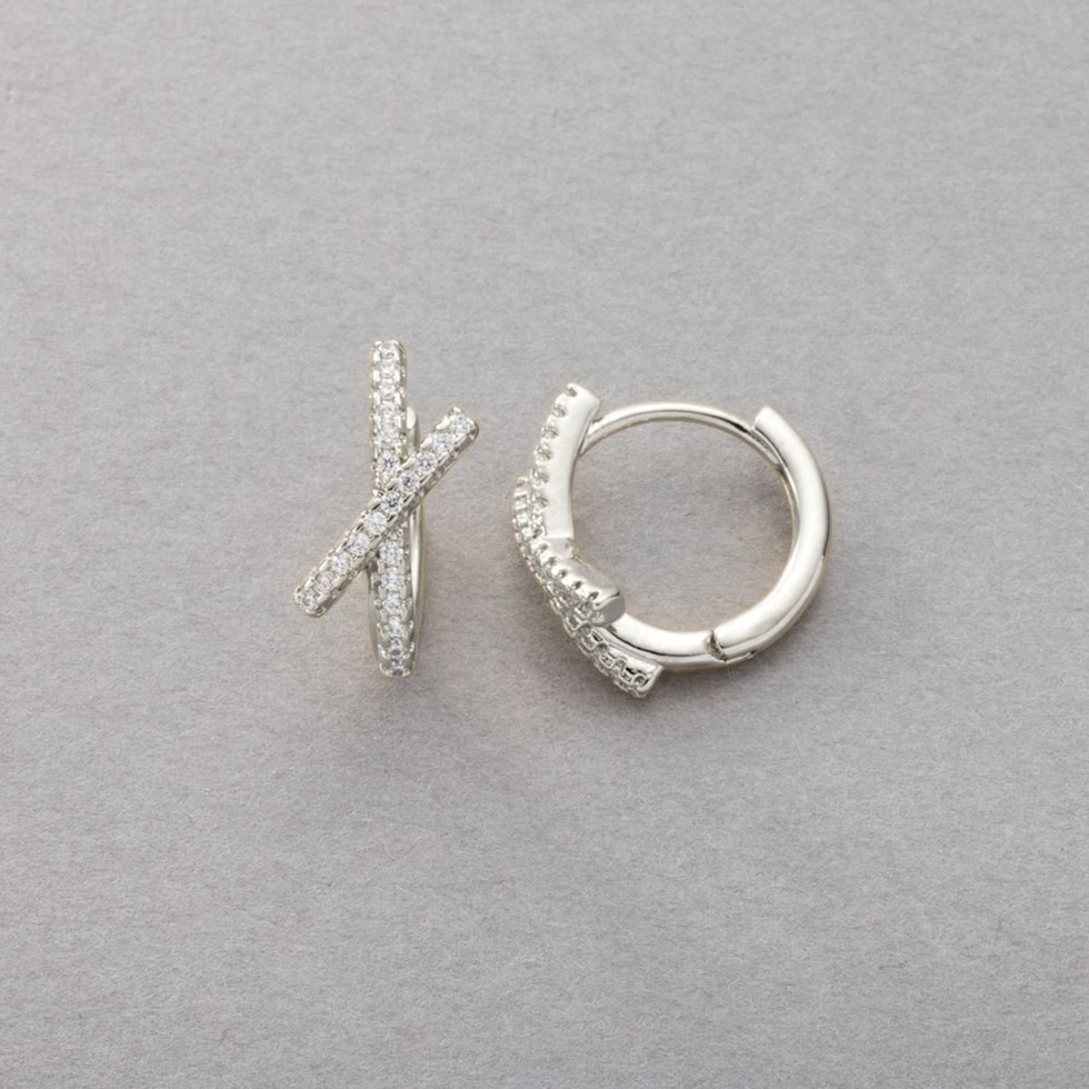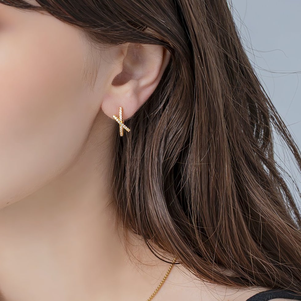 クロスラインのキャッチレスフープピアス。緩やかにカーブする極小ジルコニアを並べたビジューラインを交差させた“オトナの定番”のクロスデザインで、耳元から大人の女性らしさを香らせます。カチッと留まる着脱楽ちんな開閉式キャッチレスなのも嬉しいpoint。