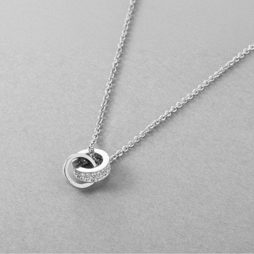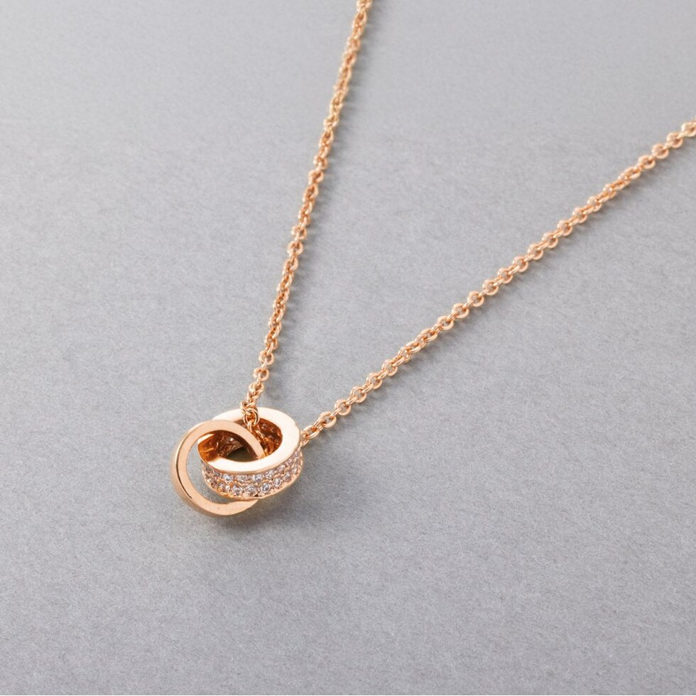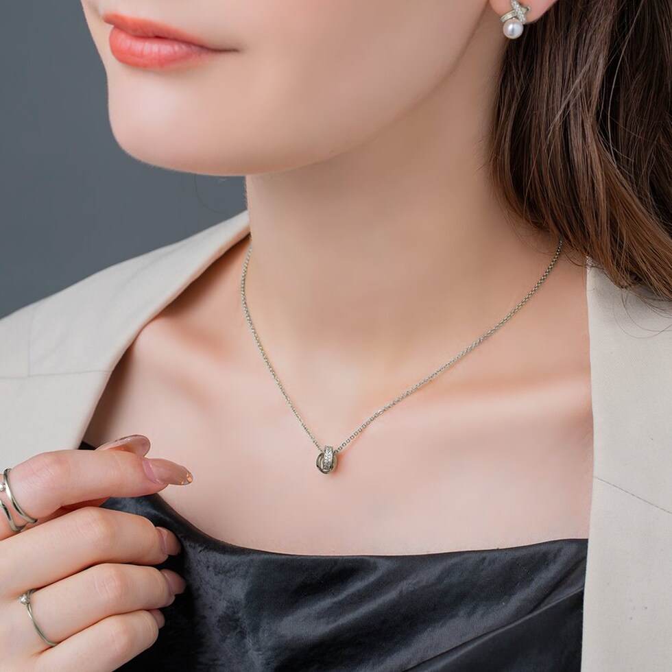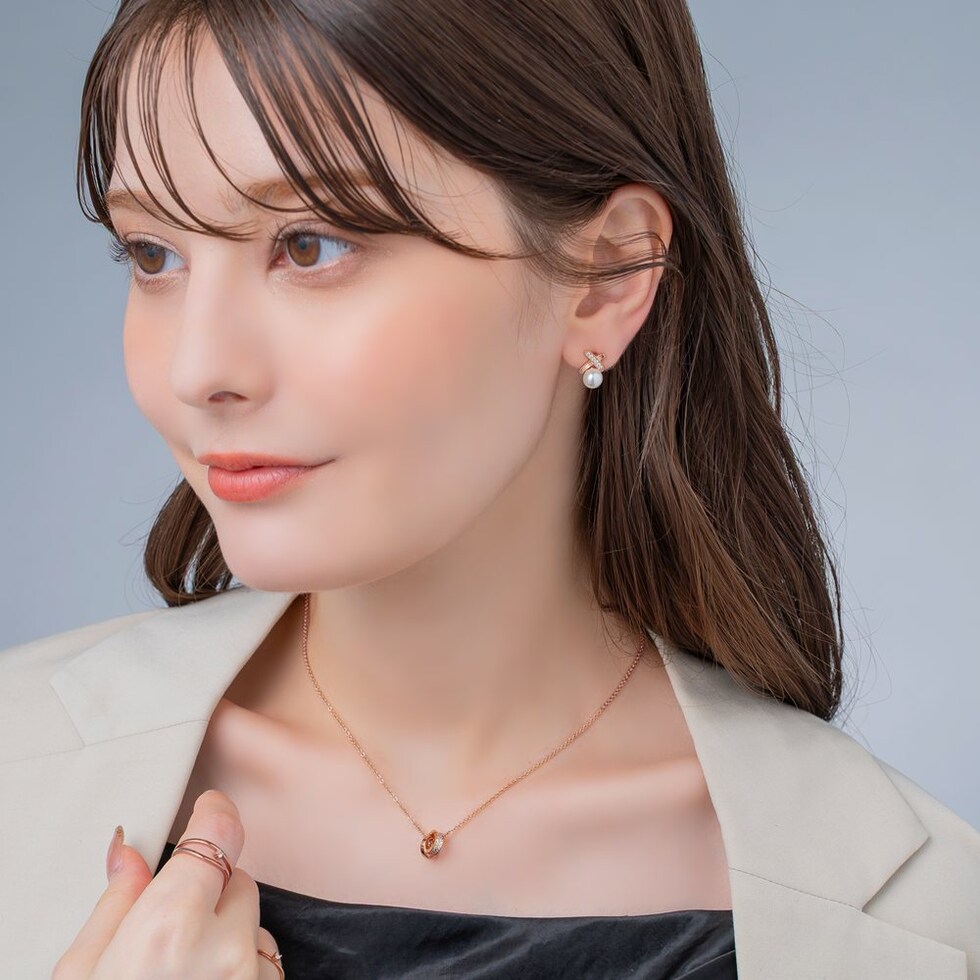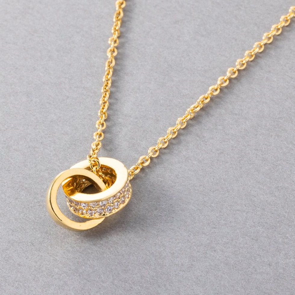 ダブルラインビジューが一周するリングとプレーンリングを連ねたネックレス。立体的なシルエットで、どの角度からも繊細な輝きを放ちます。どんなコーデとも相性がよいので、デイリーにオススメのアイテム◎