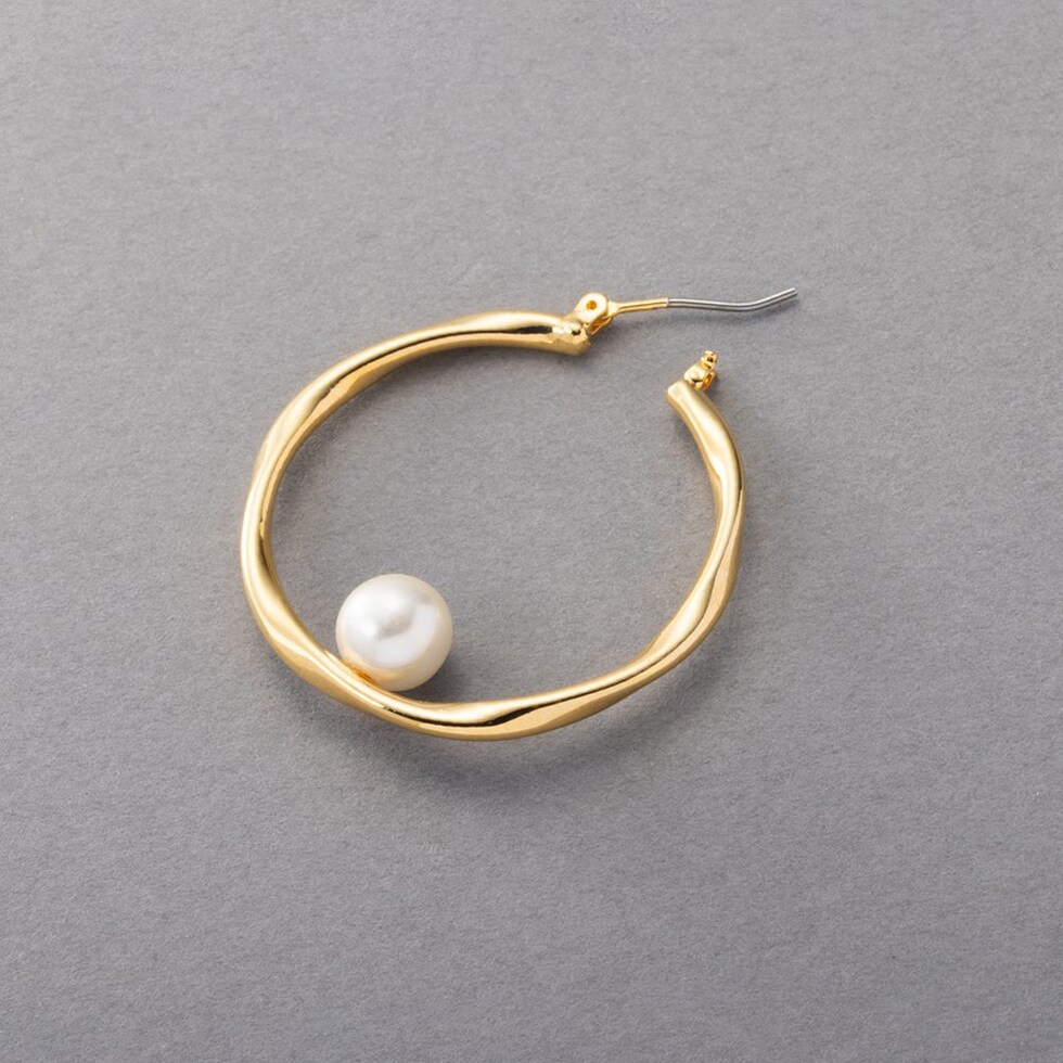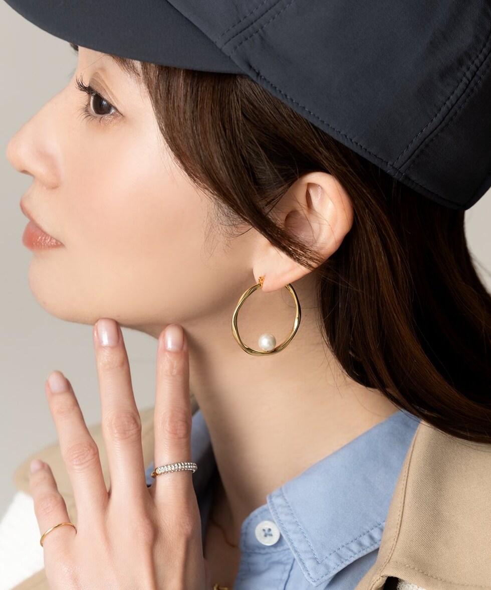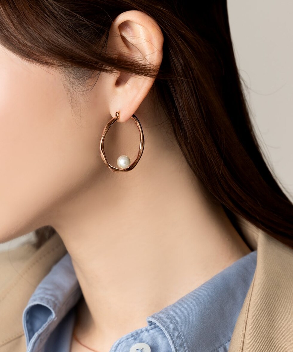 ひねりを効かせたメタルにパールを組み合わせたフープピアス。耳元にアクセントをプラスしてコーデをグッと引き締めてくれるデザイン。他にはない存在感でこなれた雰囲気に仕上がります◎