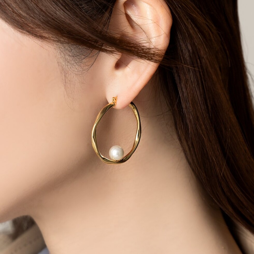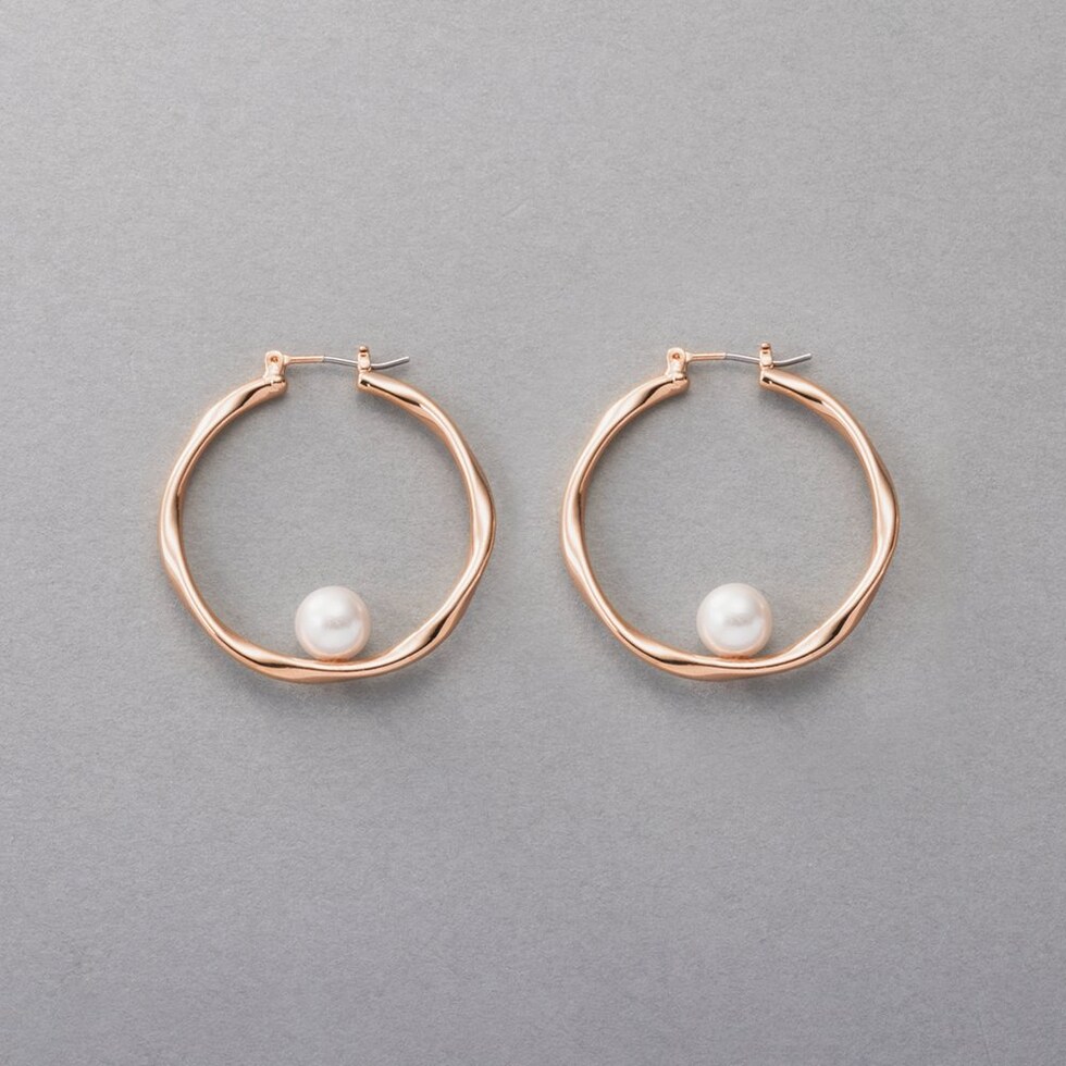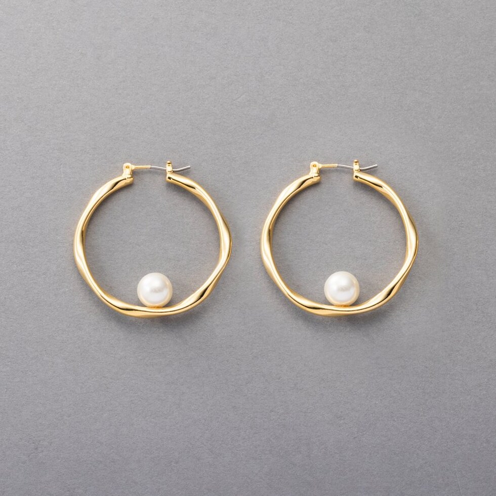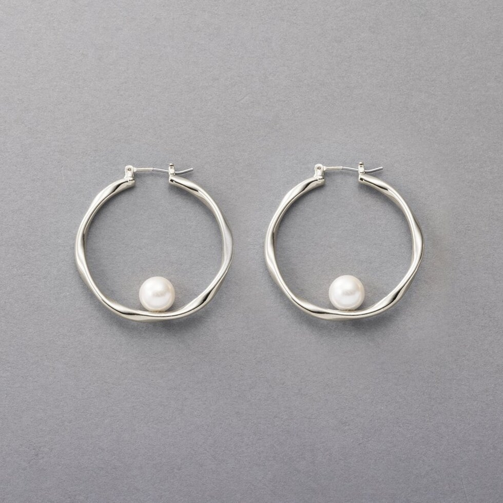 ひねりを効かせたメタルにパールを組み合わせたフープピアス。耳元にアクセントをプラスしてコーデをグッと引き締めてくれるデザイン。他にはない存在感でこなれた雰囲気に仕上がります◎