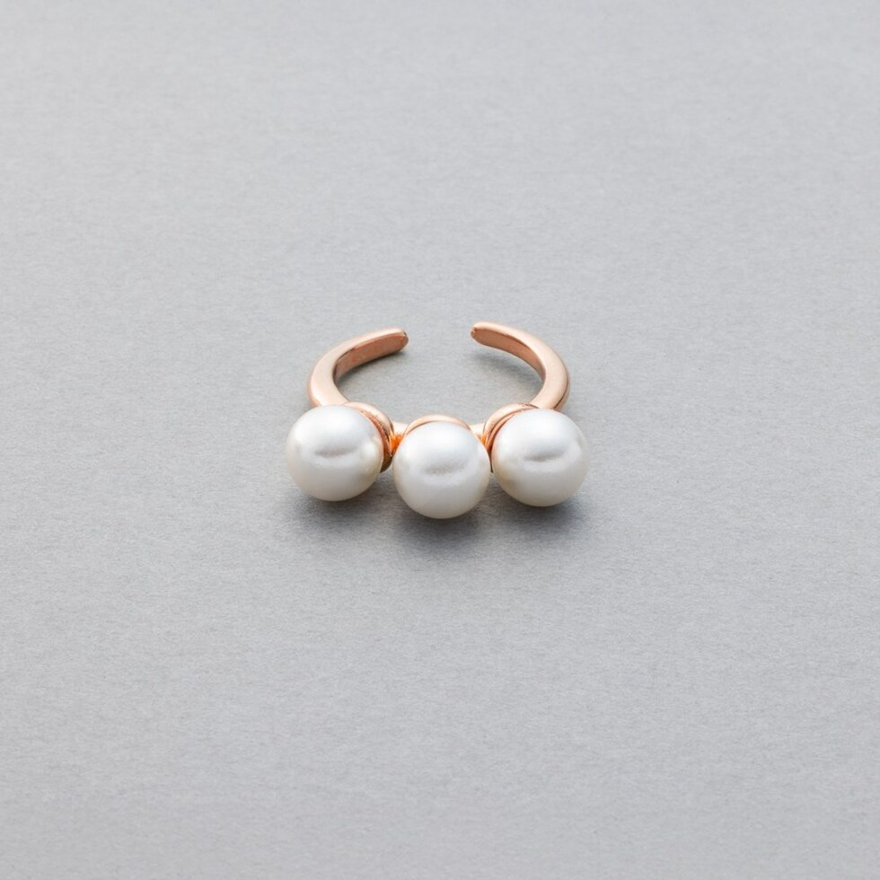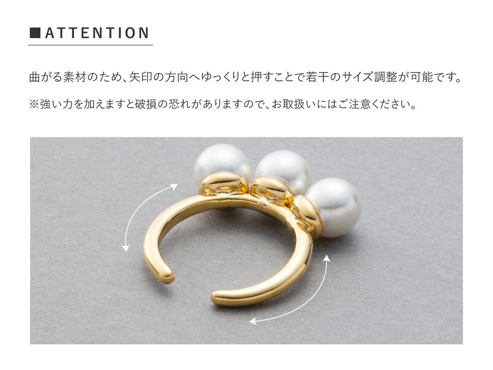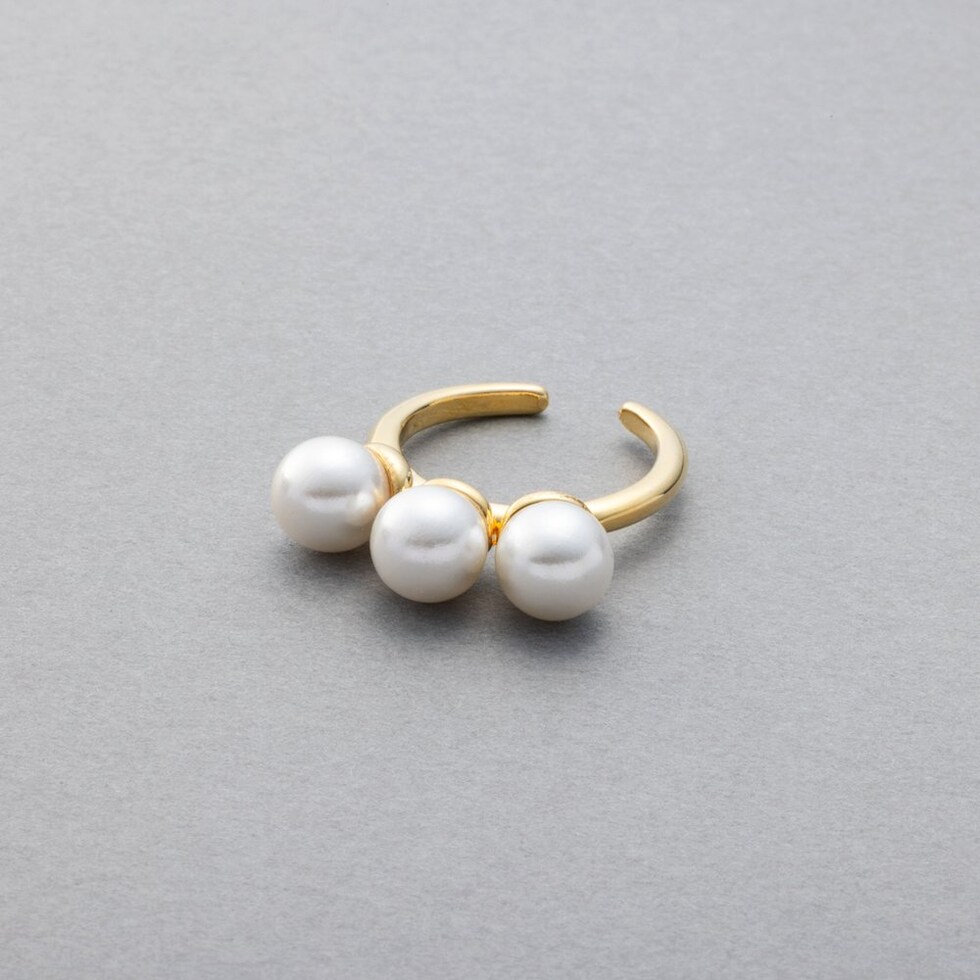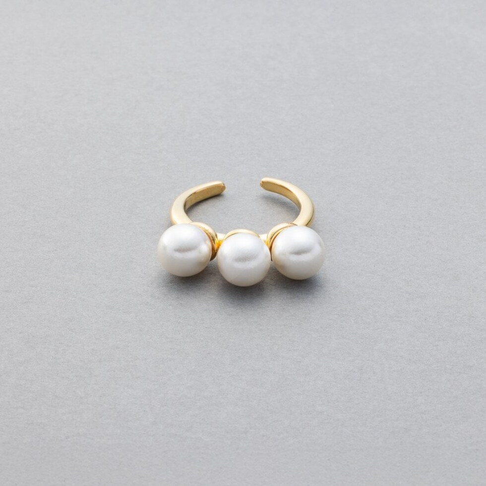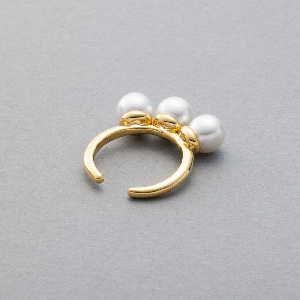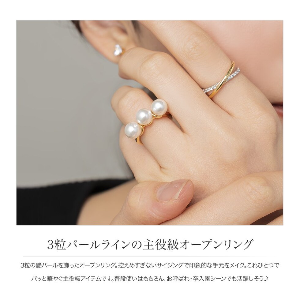 3粒の艶パールを飾ったオープンリング。控えめすぎないサイジングで印象的な手元をメイク。これひとつでパッと華やぐ主役級アイテムです。普段使いはもちろん、お呼ばれ・卒入園シーンでも活躍しそう♪