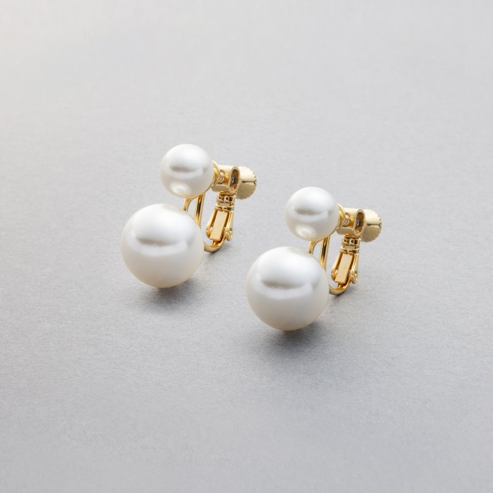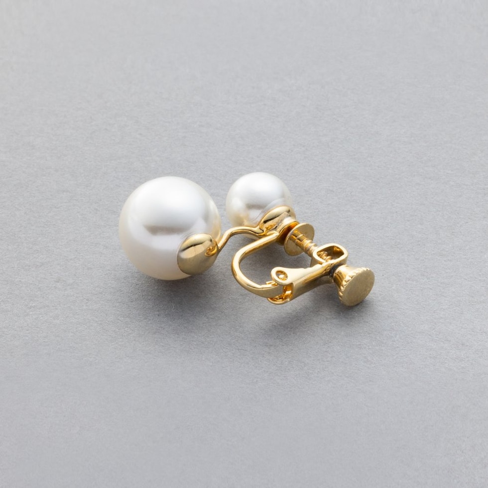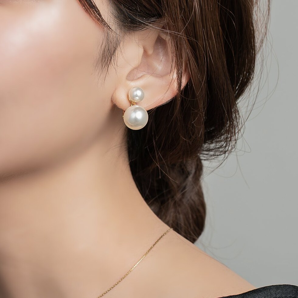大きさの異なるダブルパールデザインが華やかなイヤリング。存在感がありながらも上品な艶めきが、印象的な横顔に仕上げてくれます。デイリー使いはもちろん、オケージョンシーンにも活躍してくれるアイテムです。低アレルギーのニッケルフリー素材を使用しているので、長時間の着用も安心です。