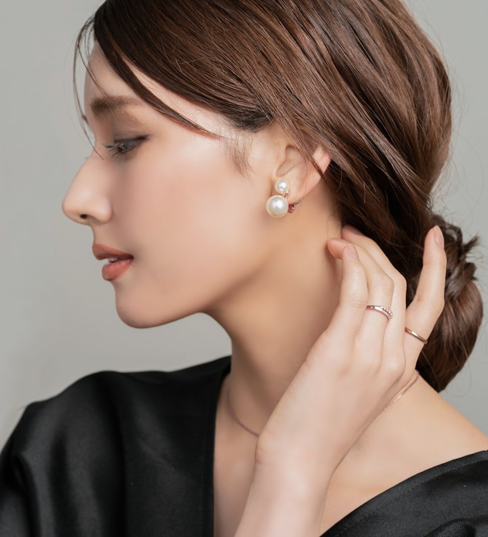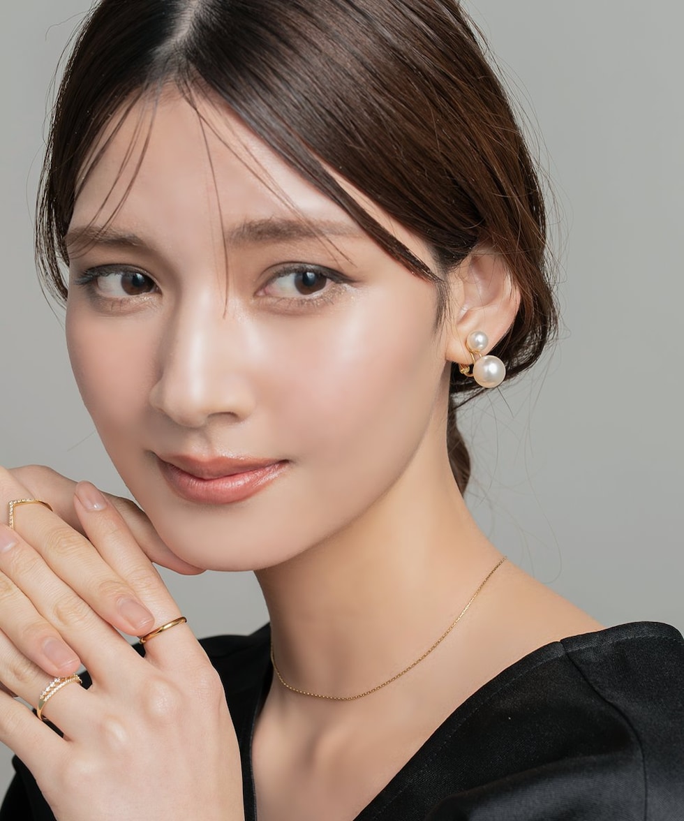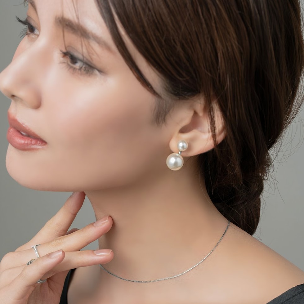 大きさの異なるパールを使用したダブルパールデザイン。艶めく上品なパールがお顔周りを華やかに彩ります。