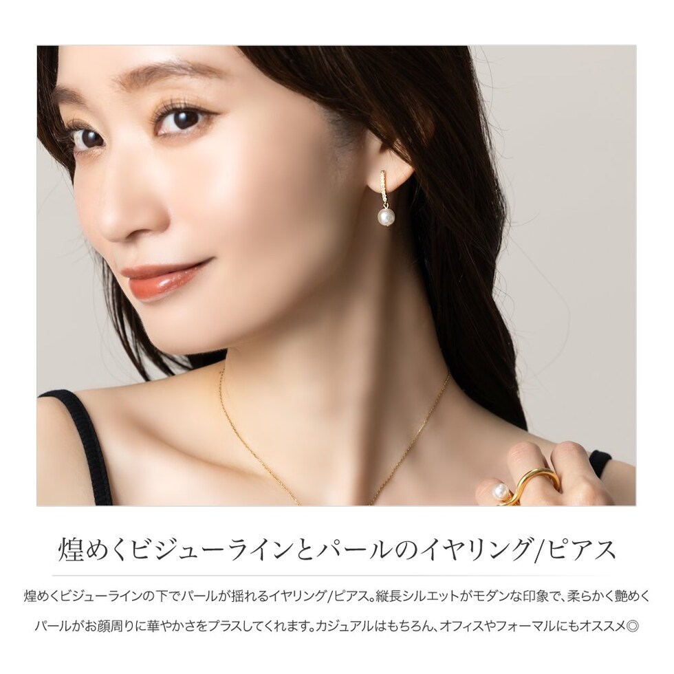 煌めくビジューラインの下でパールが揺れるイヤリング/ピアス。縦長シルエットがモダンな印象で、柔らかく艶めくパールがお顔周りに華やかさをプラスしてくれます。カジュアルはもちろん、オフィスやフォーマルにもオススメ◎低アレルギーのニッケルフリー素材を使用しているので、長時間の着用も安心です。