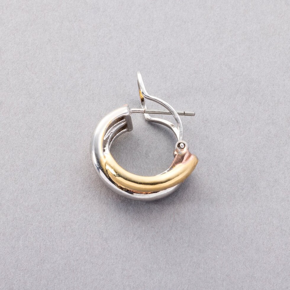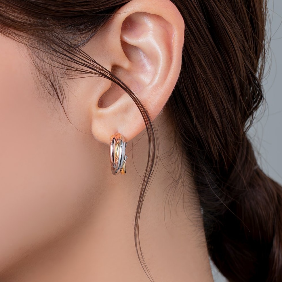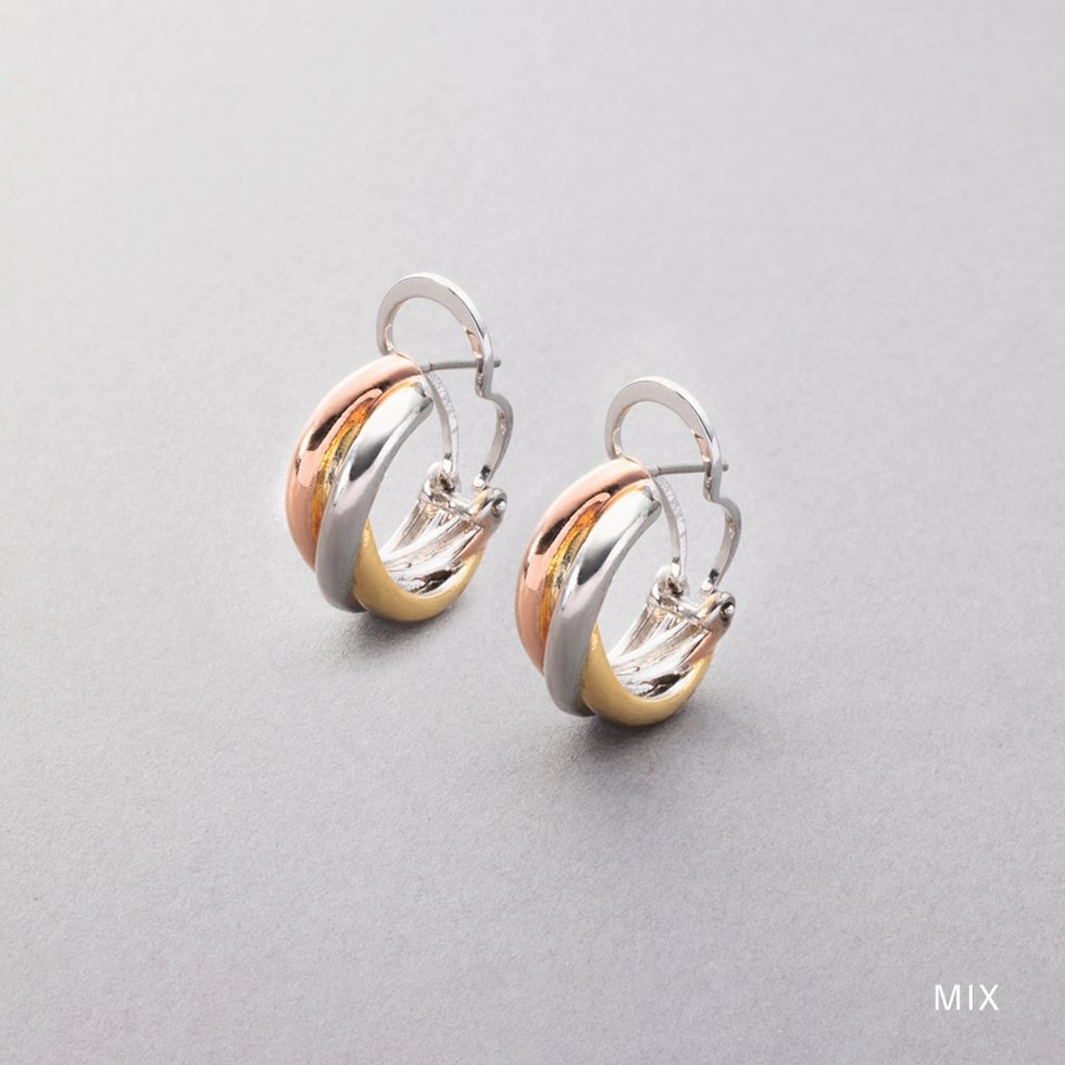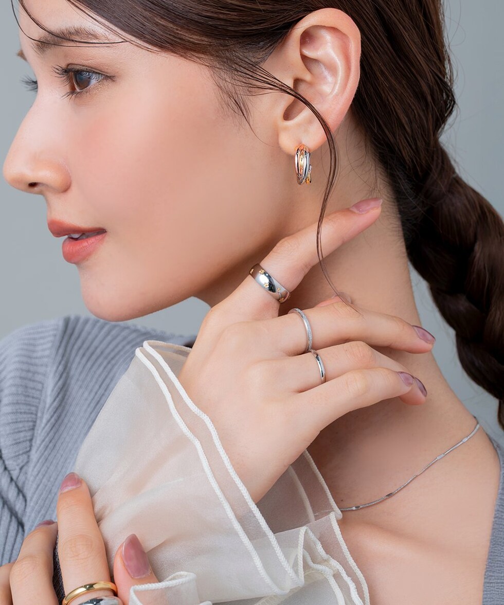 艶やかなMIXカラーのクロスデザインが目を惹くキャッチレスフープピアス。流れるようなメタルラインがモードな雰囲気を演出するひと品。他にはないスタイリッシュな印象を楽しめるアイテムです。