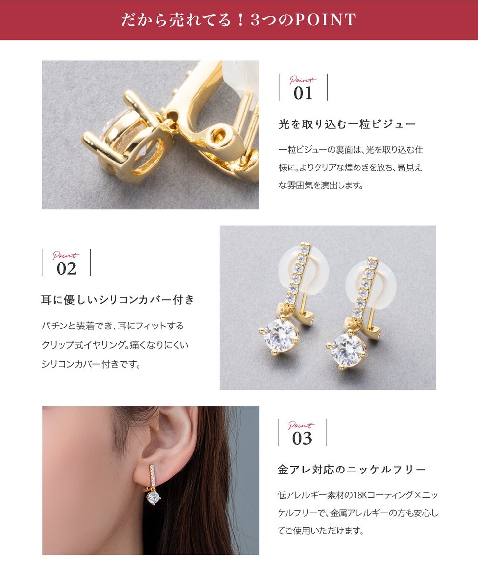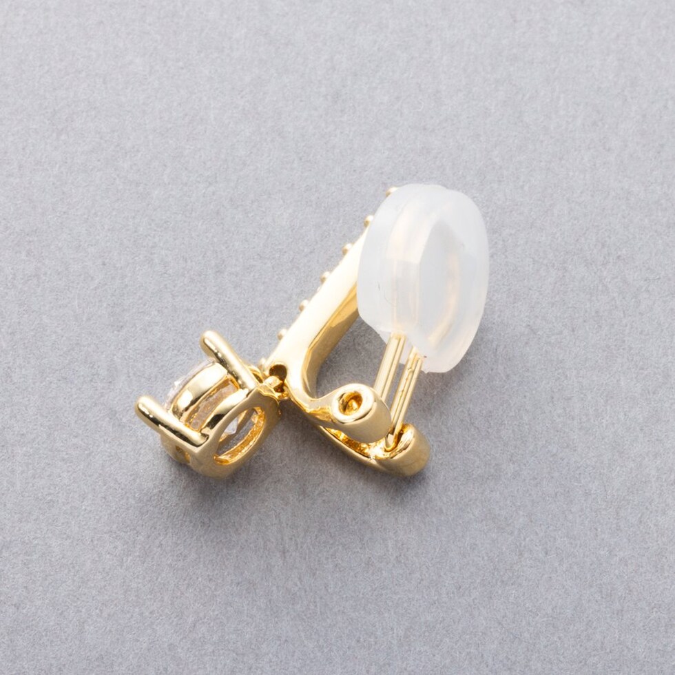 パチンと装着でき、耳にフィットするクリップ式イヤリング。痛くなりにくいシリコンカバー付きです。