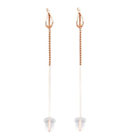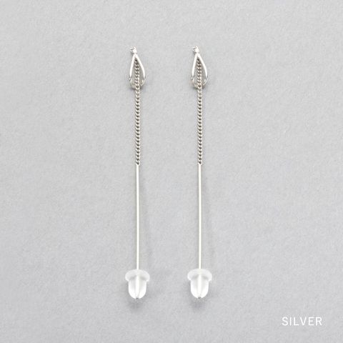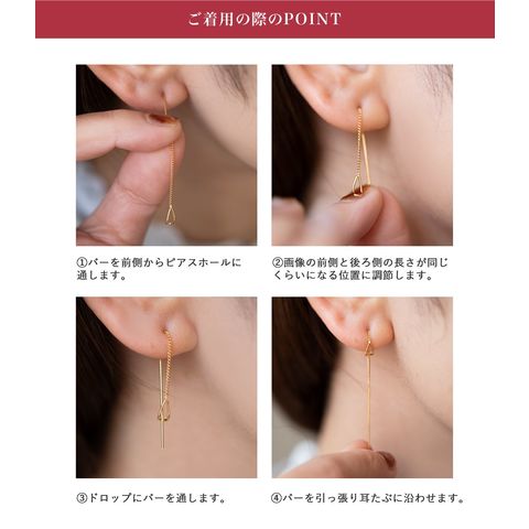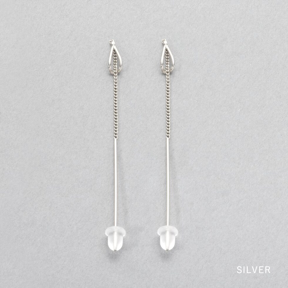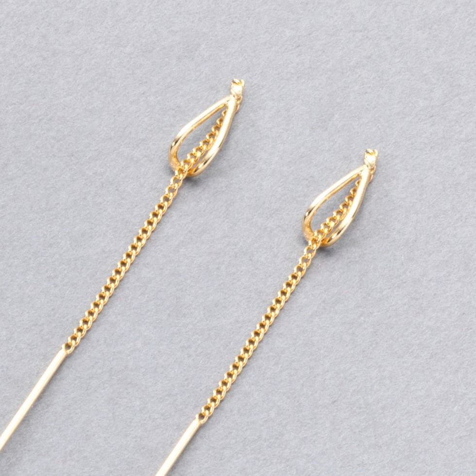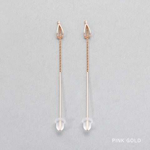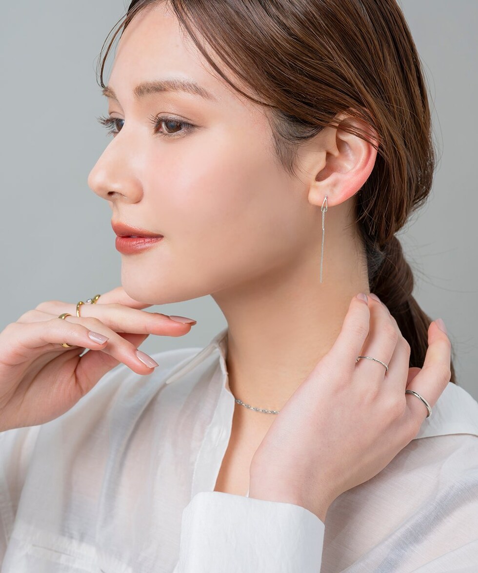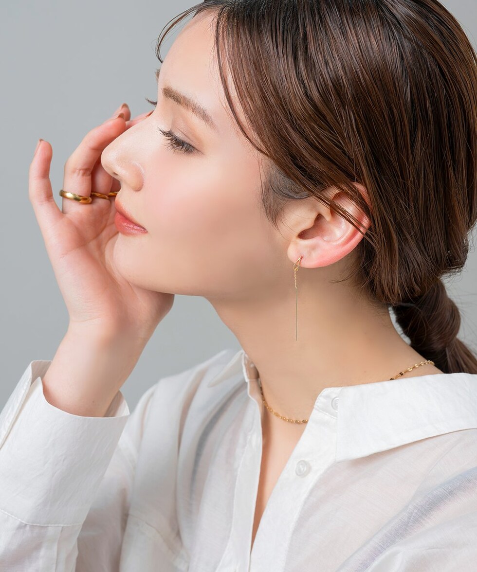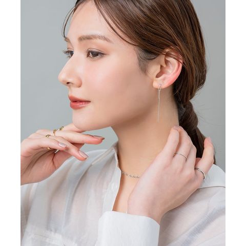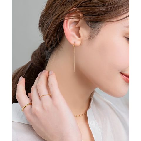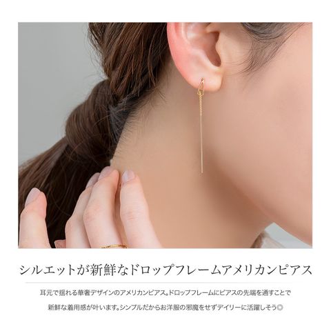 耳元で揺れる華奢デザインのアメリカンピアス。ドロップフレームにピアスの先端を通すことで新鮮な着用感が叶います。シンプルだからお洋服の邪魔をせずデイリーに活躍しそう◎