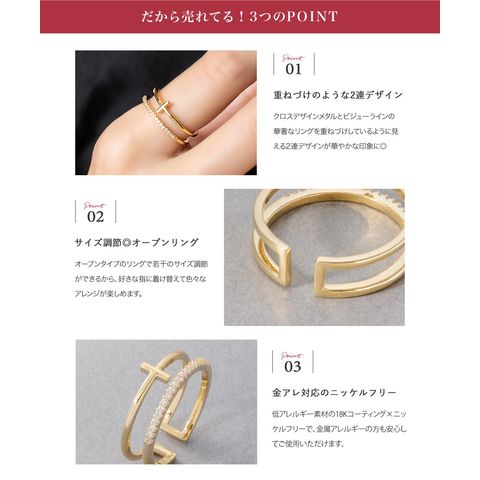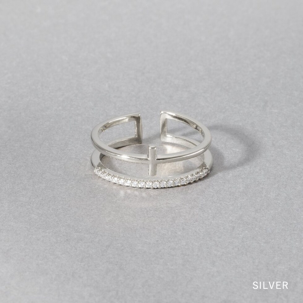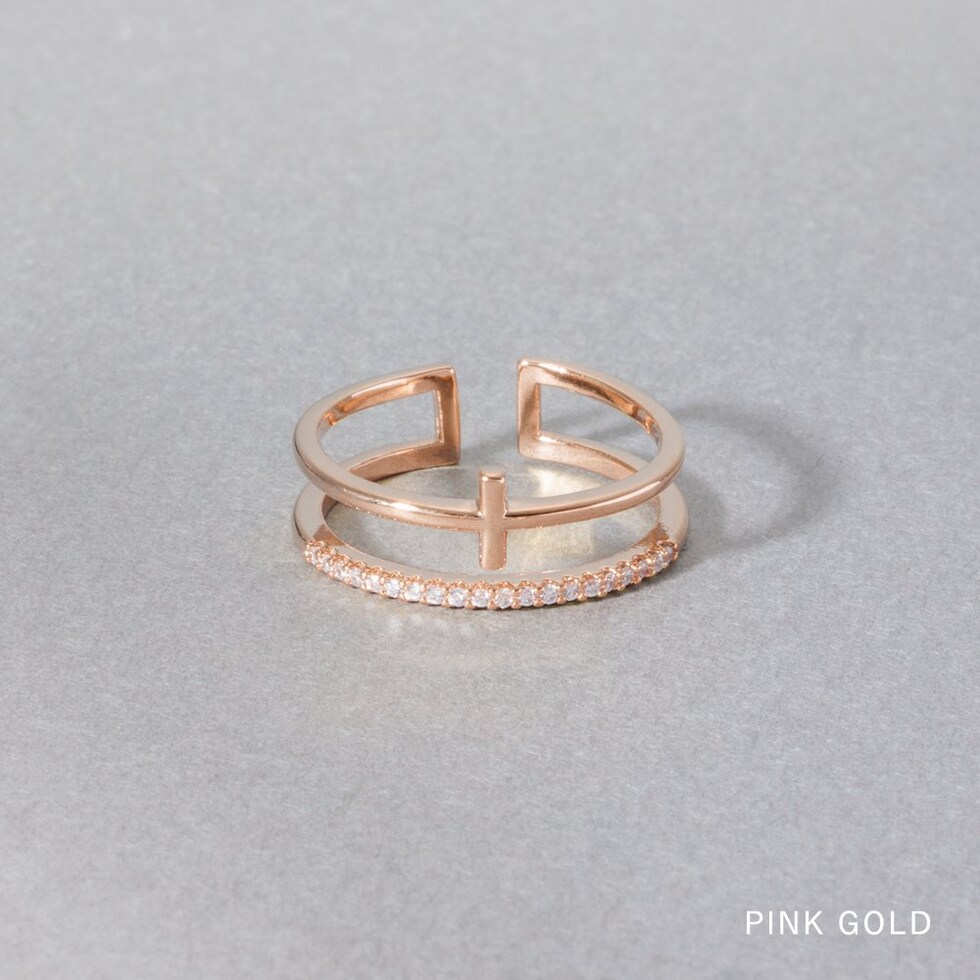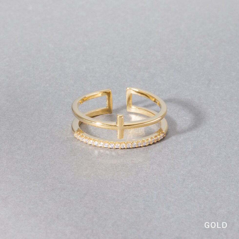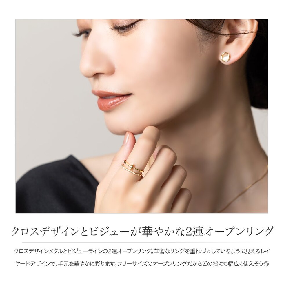 クロスデザインメタルとビジューラインの2連オープンリング。華奢なリングを重ねづけしているように見えるレイヤードデザインで、手元を華やかに彩ります。フリーサイズのオープンリングだからどの指にも幅広く使えそう◎低アレルギーのニッケルフリー素材を使用しているので、長時間の着用も安心です。