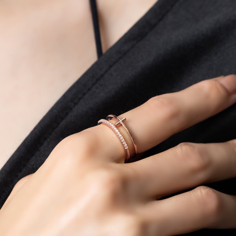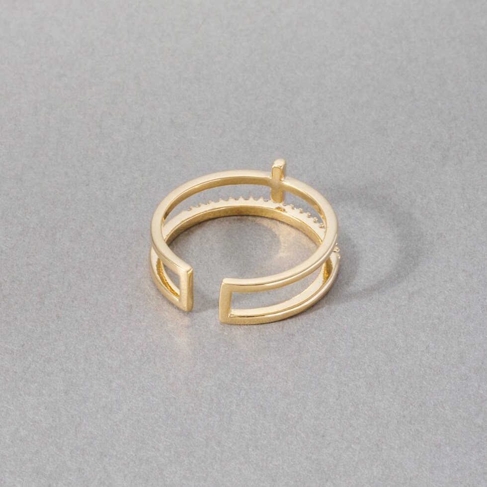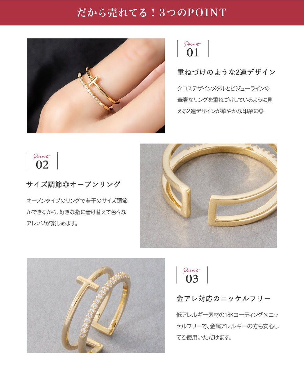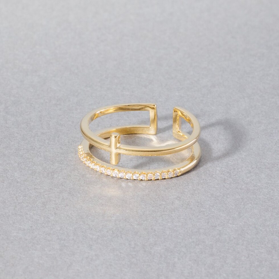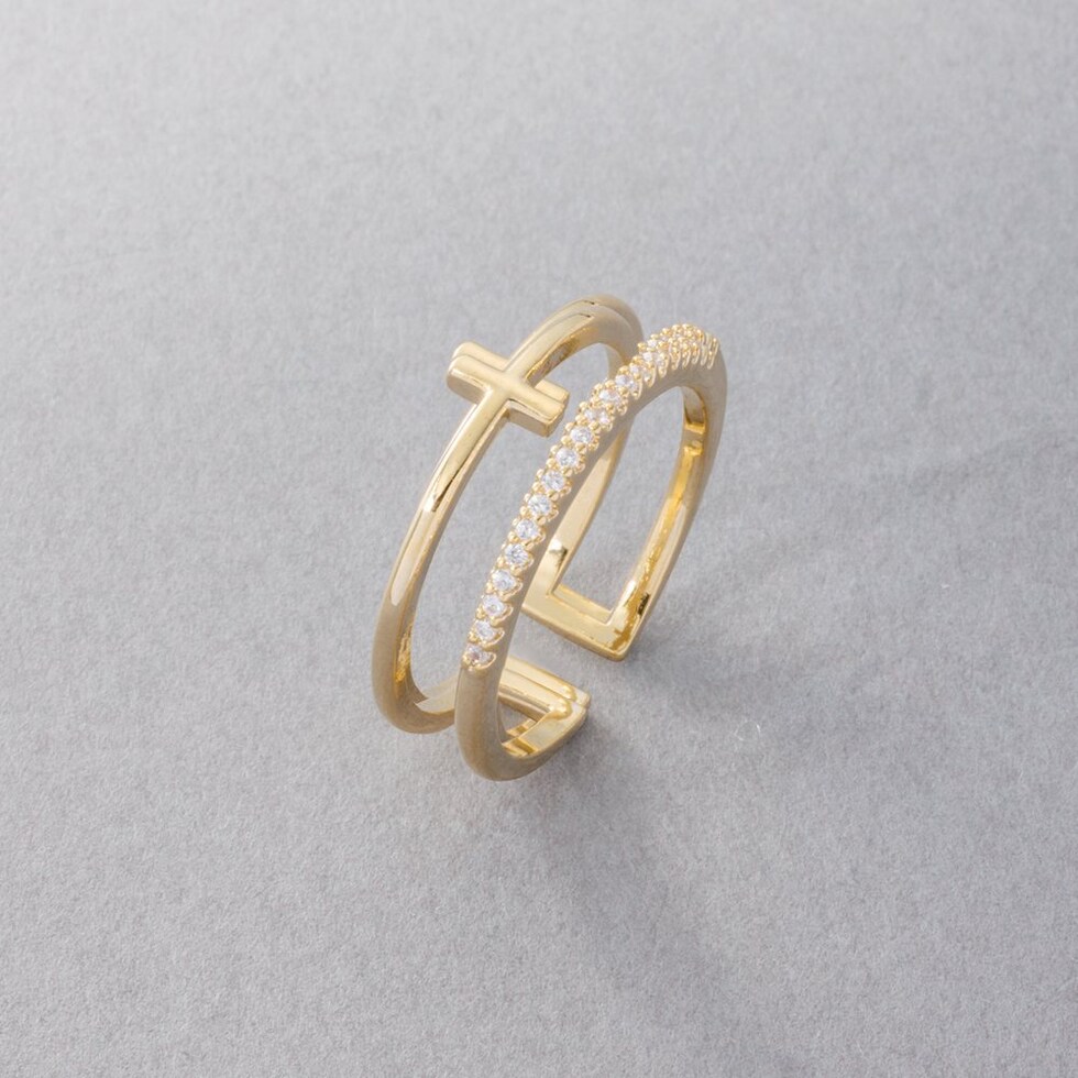 クロスデザインメタルとビジューラインの2連オープンリング。華奢なリングを重ねづけしているように見えるレイヤードデザインで、手元を華やかに彩ります。フリーサイズのオープンリングだからどの指にも幅広く使えそう◎低アレルギーのニッケルフリー素材を使用しているので、長時間の着用も安心です。