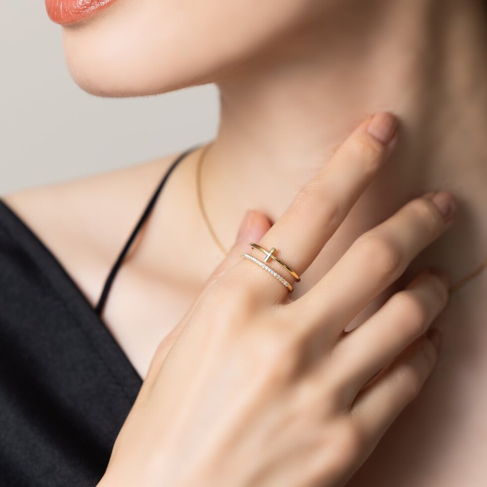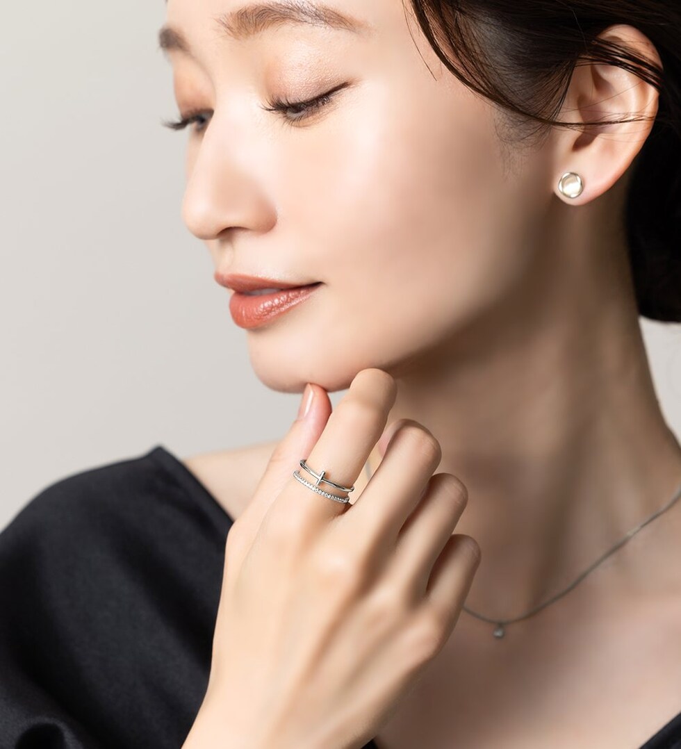 クロスデザインメタルとビジューラインの華奢なリングを重ねづけしているように見える2連デザインが華やかな印象に◎