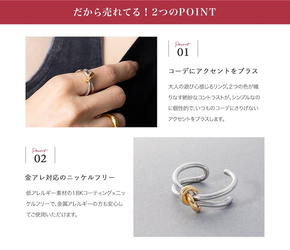 大人の遊び心感じるリング。2つの色が織りなす絶妙なコントラストが、シンプルなのに個性的で、いつものコーデにさりげないアクセントをプラスします。