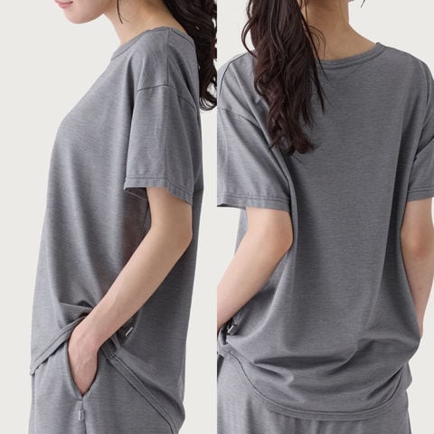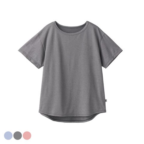 リラックス感のあるシルエットにヒップラインをさりげなくカバーする前後差を付けた裾が嬉しい丸首半袖トップス。