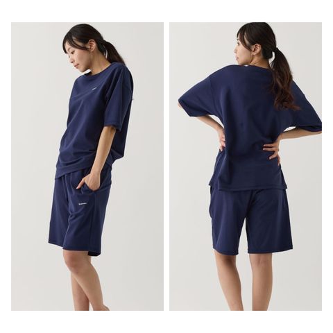 トップスは程良くワイドな身幅とドロップショルダー、ボトムスのハーフパンツはウエスト下部にバックヨーク、股下にはマチを付け上下共にお部屋でくつろぐのに最適なリラックスシルエットで細部にまで着用感に拘ったリカバリー構造になっています。