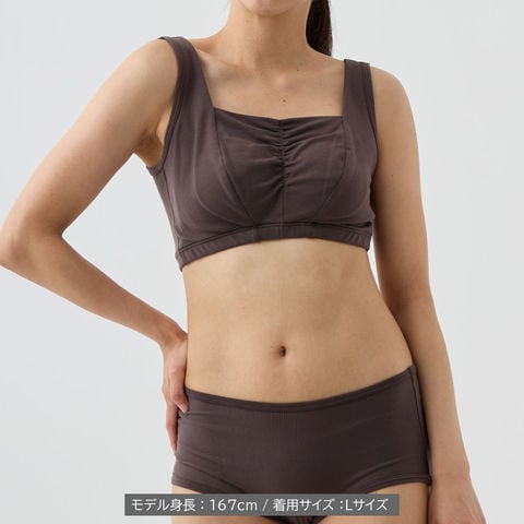 ブラジャーは生地の伸縮性と切り替えでバスト全体をカバー。センターフロントにシャーリングを入れ谷間にもフィット。