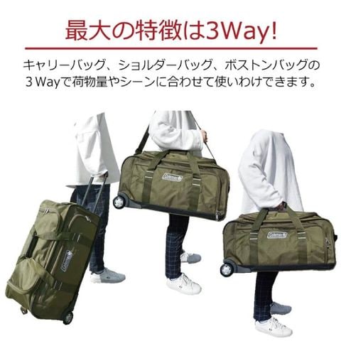 キャリーバッグ、ボストンバッグ、ショルダーバッグとして使える3WAY仕様。